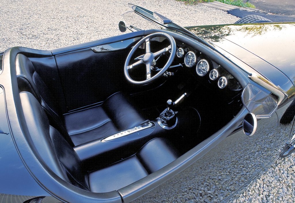 Beneath the windshield is a basic and beautiful dash fitted with Stewart-Warner Wings gauges that follow the flavor of this car. The center console continues this theme with a selection of switches and lights nestled in black aluminum surrounded by black leather. Tom Sewell brought this special touch to the mix, and followed with the same material for the seating and other subtle details. One of these is the Bell 15-inch, four-spoke steering wheel that has been well placed through the use of tubular supports and multiple Borgeson U-joints. It is also interesting to note that both of the seat backs are removable to allow easy access to the rear storage compartment, which also houses the battery and a 17-1/2-gallon fuel cell.
