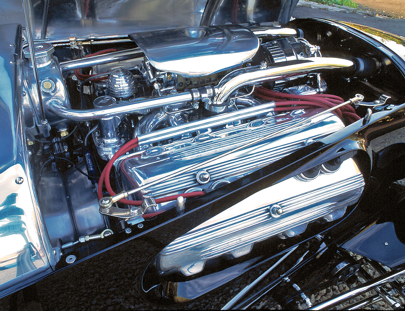 The traditional side of this machine can be found in a ’53 Mercury Flathead that’s been completely reworked by longtime Indy crew chief and master fabricator Dick Russell. It spins a 4-1/8-inch crankshaft armed with Cunningham rods and Arias forged aluminum pistons, creating a total displacement of 296 ci. To improve breathing, a pair of specially built Ardun hemispherical aluminum heads were acquired, and these, too, received a large helping of Russell foresight, including needle-bearing roller rockers and many other modification “secrets” that make for spirited performance. One we can mention is the custom Isky camshaft with a Winfield grind pattern that makes the most of the adjoining hardware. To take full advantage of the improved breathing and combustion chambers, a hand-built aluminum intake manifold was shaped and fitted with a Demon 625cfm four-barrel carburetor and a custom air cleaner. Then came an MSD electronic ignition system to heat up the spark, and finally an Oberg oil filter to maximize engine life. The bottom side of the heads joins with hand-built, equal-length 1-1/2-inch headers that have been Jet Hot-coated for a better look and heat retention for added power. The remainder of the exhaust system required some unique thinking, as clearance is limited. To make the most of that space, 1×5-inch NASCAR tubing was used for the head pipe and followed up with stainless steel Borla turbo mufflers and 2×3-inch oval tailpipes. Once the exhaust system was completed, an aluminum belly pan was shaped around it from front to rear. The resulting exhaust tone certainly expands on this car’s exotic styling, leaving few clues that this motor is “just” an early Ford V-8.