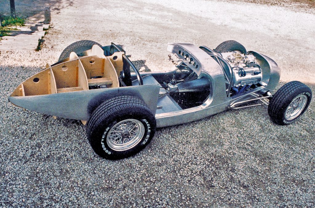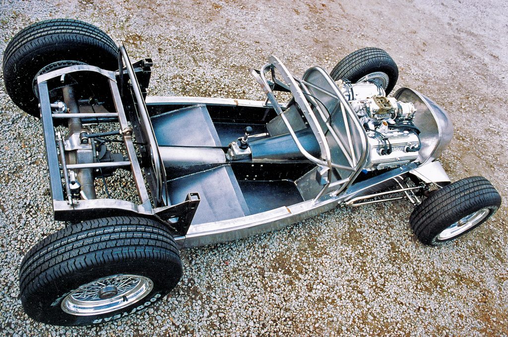 With a good portion of the chassis work completed, attention was turned to the creation of the aluminum body. With the drivetrain and suspension components in place, a wooden buck was shaped from lengths of 1-inch plywood separated every 12 inches by a series of bulkheads. As the various pieces came together, their shape was massaged until the contours of the various illustrations could be visualized in the body buck. As you might expect, this process was time-consuming, yet taking extra time at this point ensured that the desired body contour was achieved the first time around.