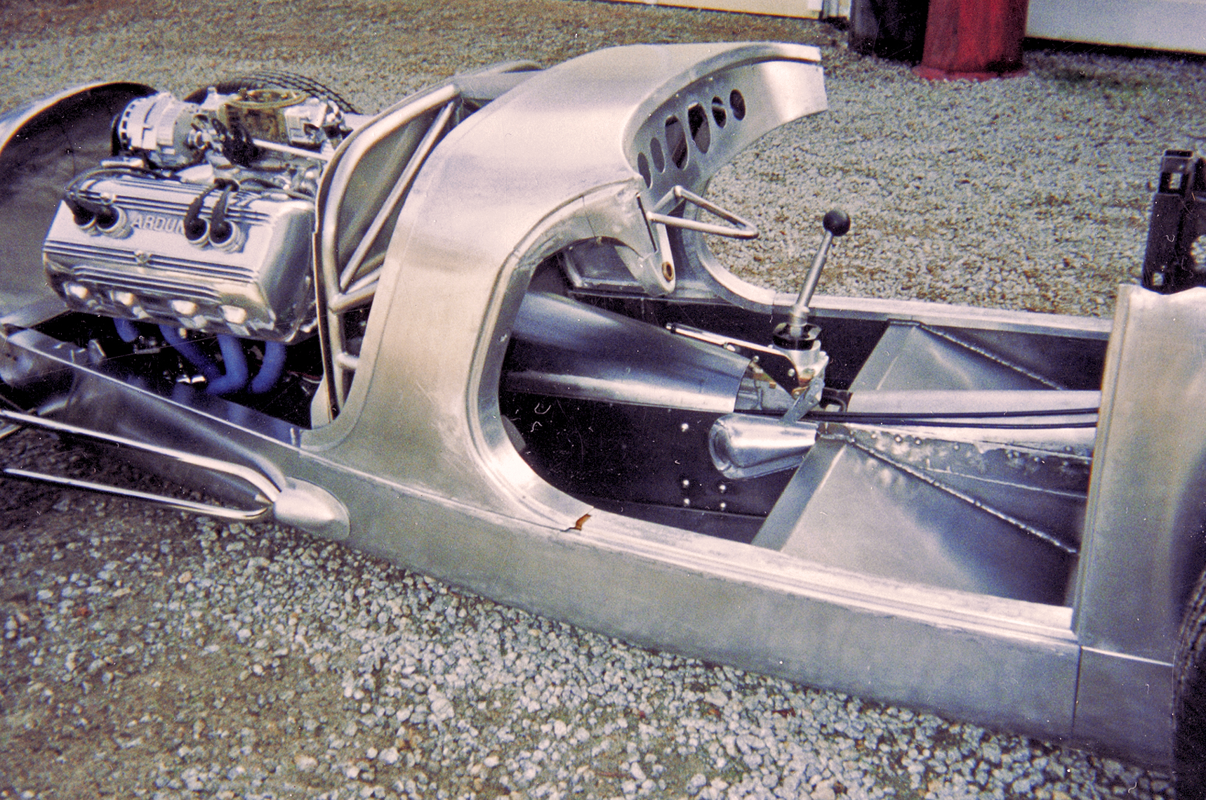 Because the driveshaft spins between the driver and passenger, Kinney created a tunnel that doubles as a full-length 3/16-inch scattershield, with a removable cover allowing access to the transmission, linkage, and other items below.
