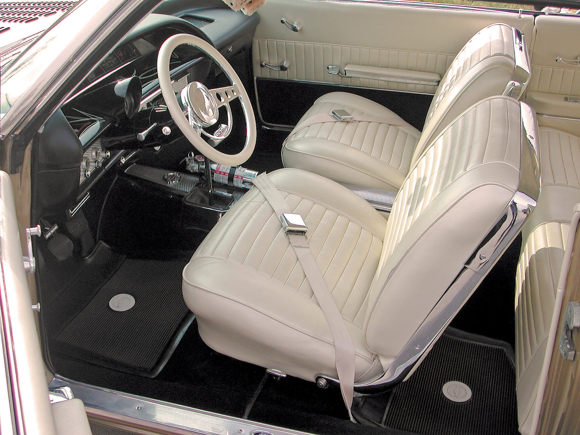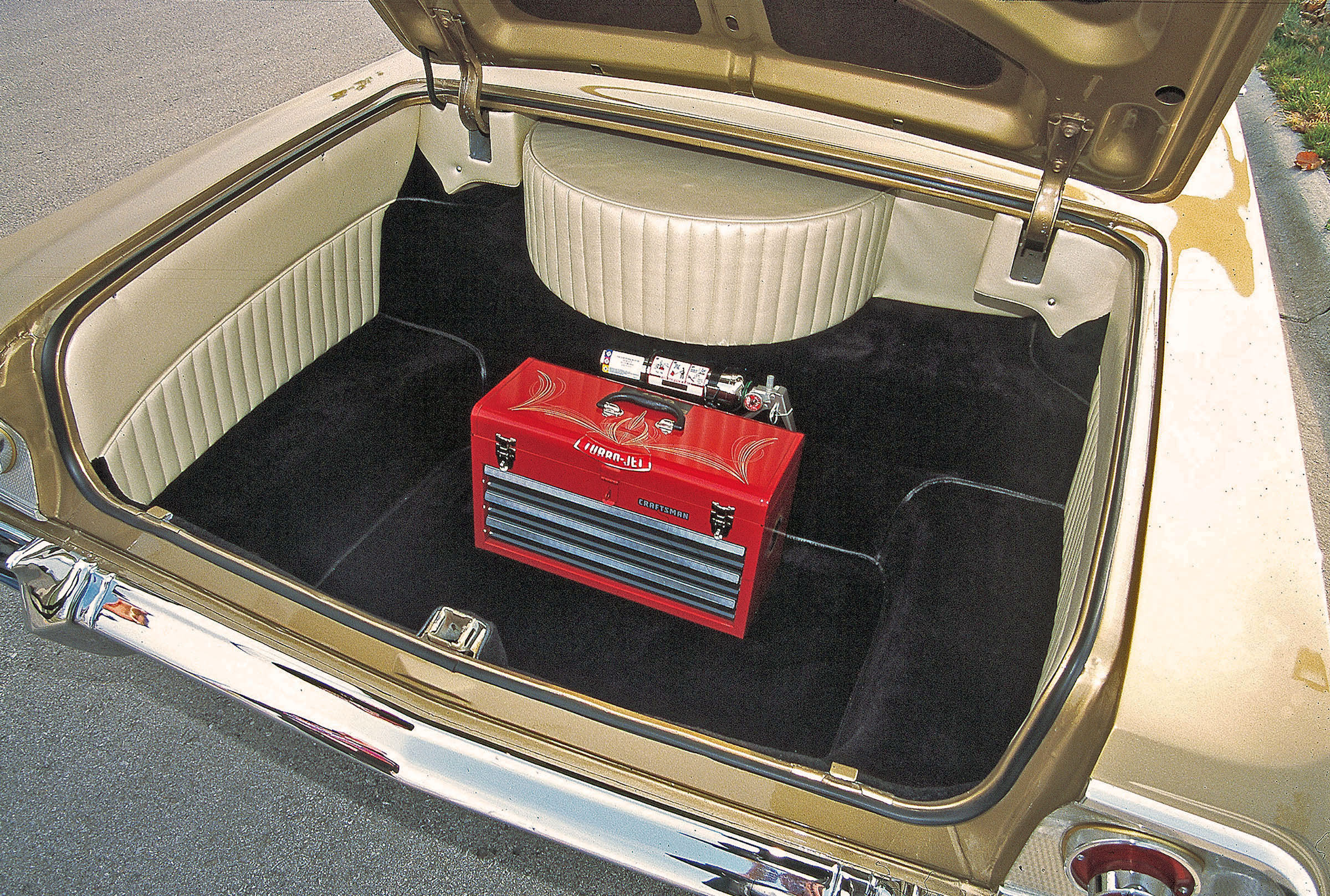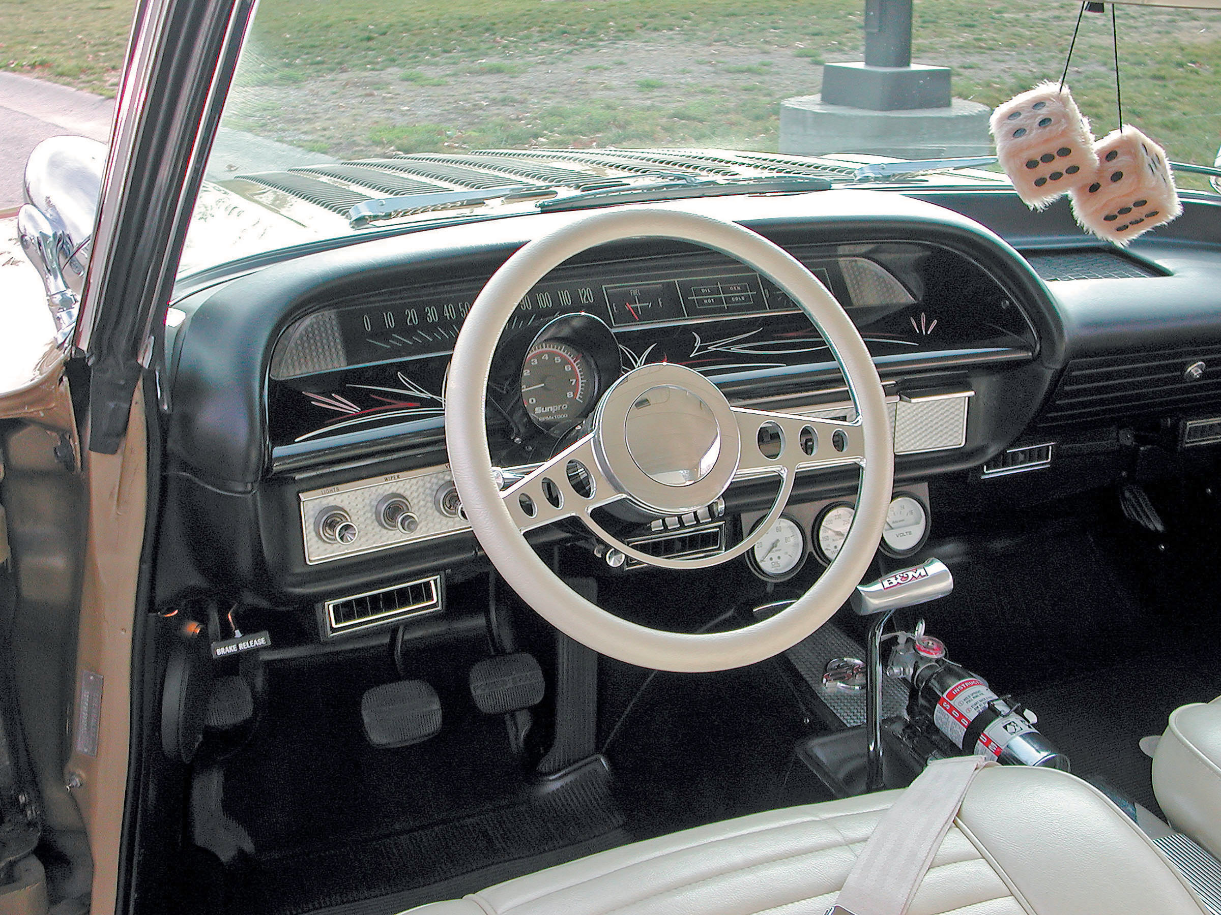 The rest of the car was just as sizzling. Polished American Torq-Thrust 15-inch wheels rotate Goodyear P225/70 front and P255/70 rear rubber. Lexington, Missouri’s Donnie Shafer laid the DuPont Anniversary Gold paint. Bob Bond from Lee’s Summit applied the ghost flames. Hot Rod Express in Blue Springs color-sanded the paint and applied many coats of clear. In all, it took four months to do all the paint-finishing work. The bumpers were show-chromed, and Moon dual dummy spotlights were added, along with a new hood with 328 louvers. The headlights are Jag-style glass lamps by Lucas. A super-rare new-old-stock (NOS) grille, eyebrow chrome and a hood lip molding came from Phil Reed’s Classic Motors in Kansas City. The factory side trim also is new-old-stock, as are the taillight assemblies. The headlight bezels have been chromeplated and the front license plate aluminum has been louvered. The front suspension was lowered 2 inches with Year One shortened front coil springs. Station wagon rear coil springs were cut slightly to lower the rear 3/4 inch for a ’60s nose-down-rake stance.