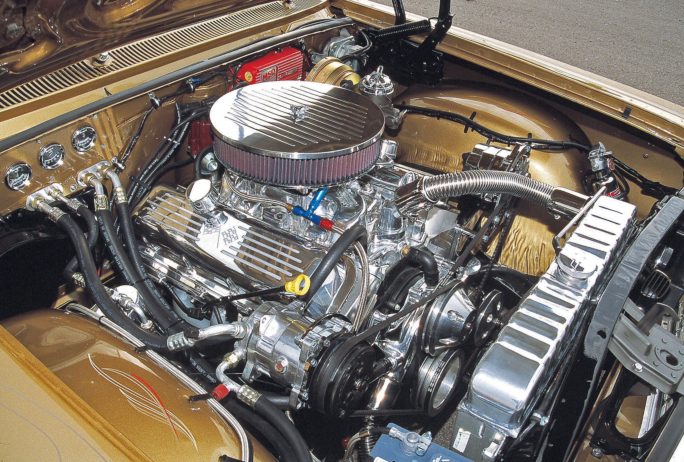 In 2001, Lavine felt it was time to bring the car into the 21st century. To do so, he pulled the 474 ’09 and replaced it with a warmed-over 502 crate motor featuring aluminum heads and a lot of aftermarket goodies. The cam is a Crane roller with 0.613/0.634 lift. Firing the cylinders is a Mallory Hyfire VI system with Taylor spark plug wires. An Edelbrock polished dual-plane manifold with a Demon 850cfm carb serves as the induction. Helping feed the 502 is a Holley electric fuel pump. Scavenging the exhaust are ceramic-coated Sanderson headers, a 3-inch-diameter dual-exhaust system and a pair of Flowmaster mufflers. Billet Specialties valve covers and air cleaner (with a K&N filter) help set off the theme of “all show and go.” The braided-steel engine hoses are from Cool-Flex, and the radiator is a polished Griffin unit with dual electric fans. A chromed alternator pumps out 140 amps so the stereo can blast away on a hot day with the air conditioning on. You can bet Lavine installed a top-quality Vintage II polished A/C system. Thanks to Bob Bond, the engine compartment is tastefully pinstriped. The entire engine and engine compartment have received hours of detailing.
