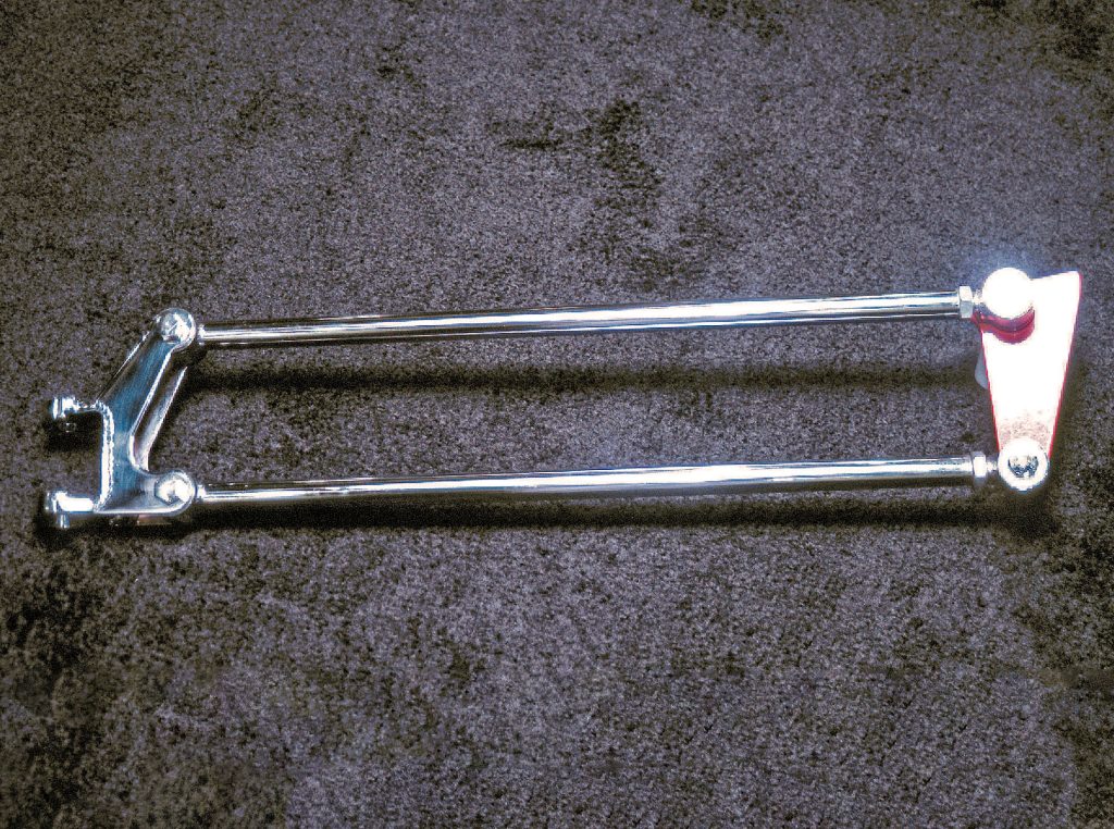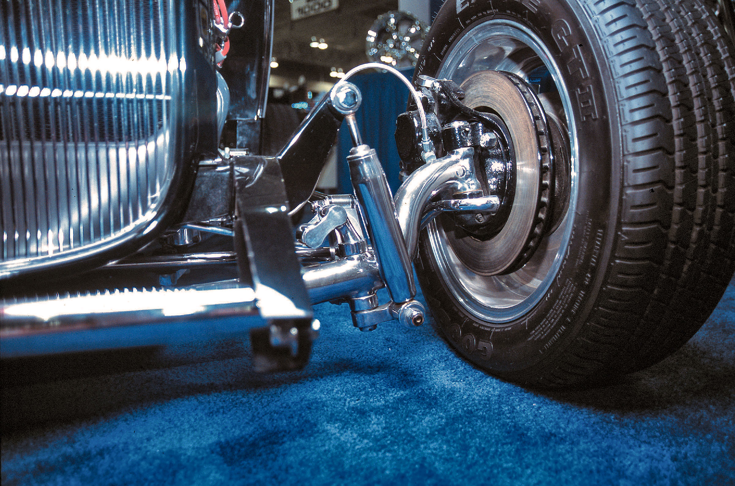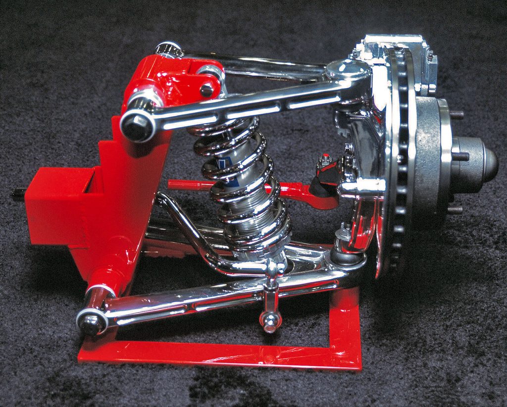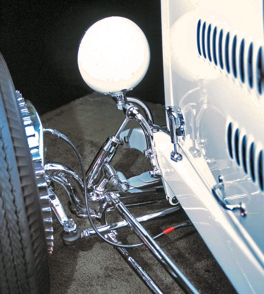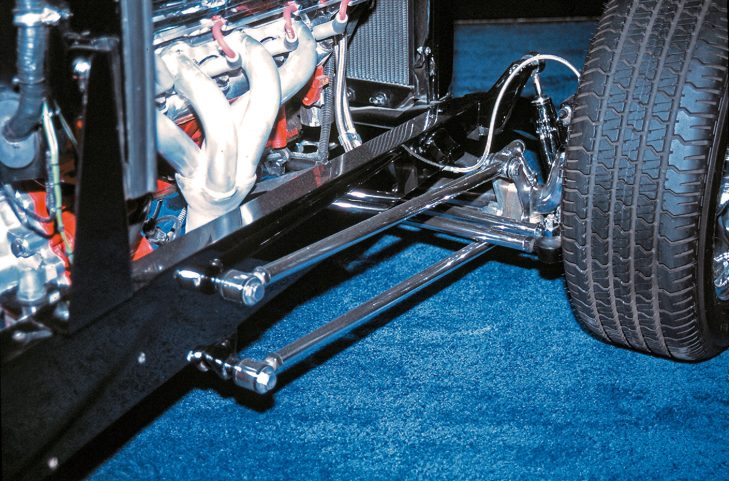 “On high-tech highboy cars, I like to use an independent front suspension, but I use the ones designed for open-wheel cars. I think they look best in polished stainless steel or chrome, and I don’t think stamped-steel A-arms have a place on open-wheel cars. When I build a high-tech, open-wheel car, I think polished tubing, polished everything, for kind of an Indy-race-car-looking suspension.”