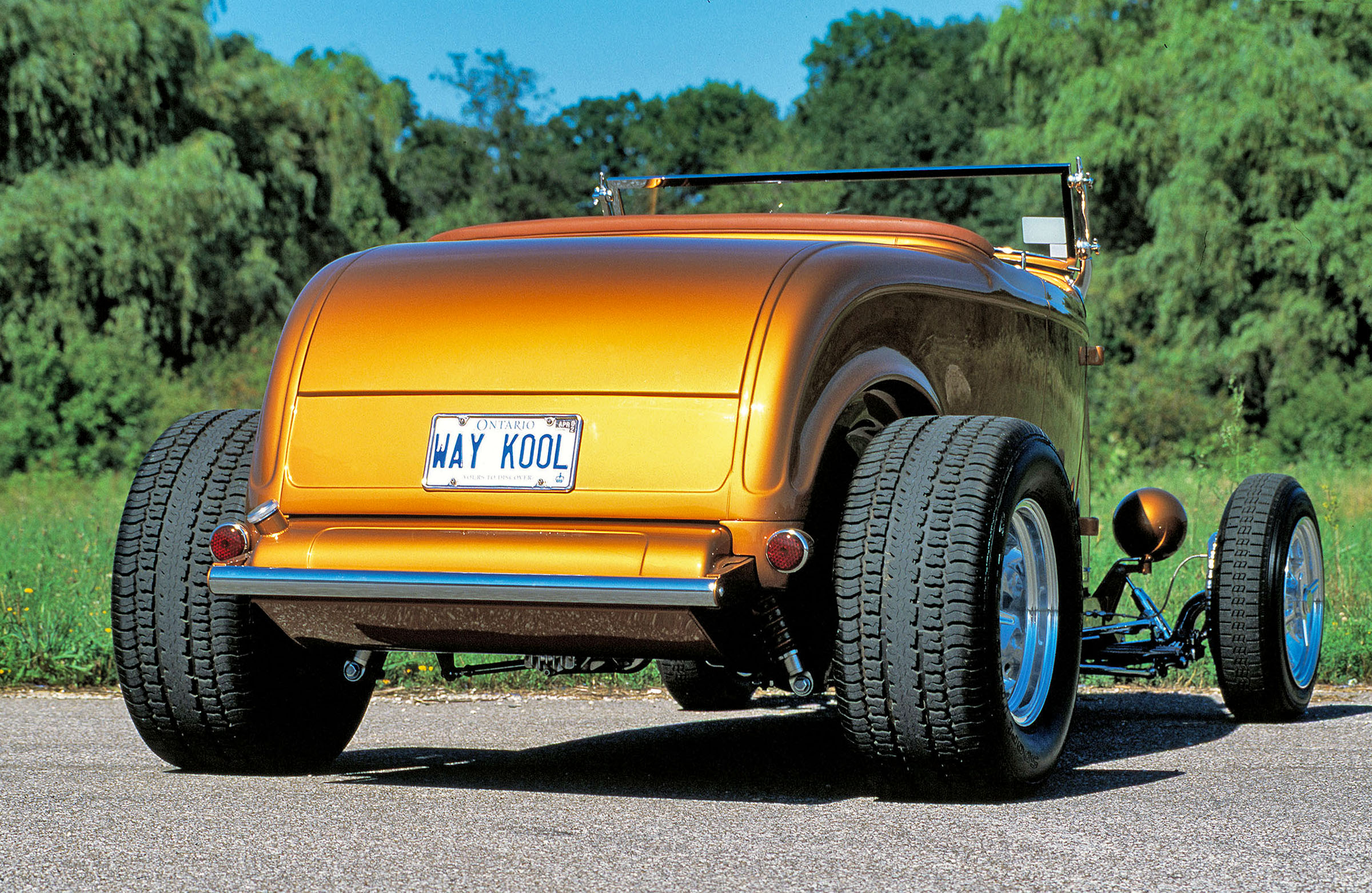 Rear Suspension. “You know, independent or solid axle, the most important thing is how the rear wheels are tucked close to the body on a highboy, or fill the fenders on a full-fendered car. Since most modern wheels are available with virtually any offset, we use a rear-axle measurement for all our Deuces that is 56 inches from flange to flange. We then adjust the fit of the tires with wheel offset.”