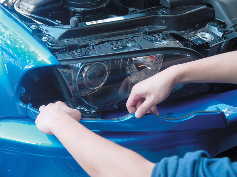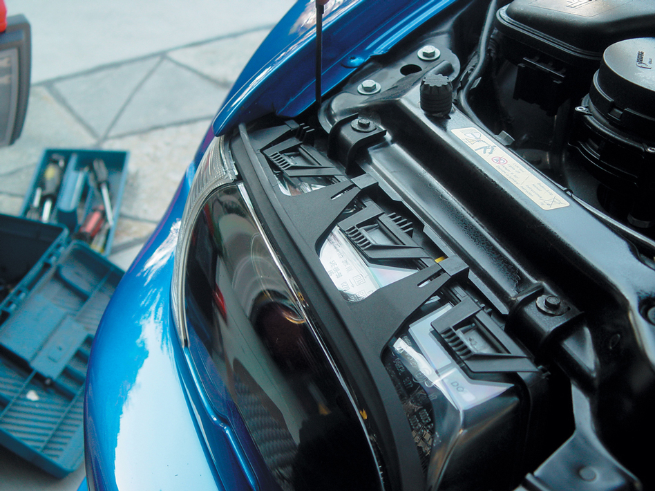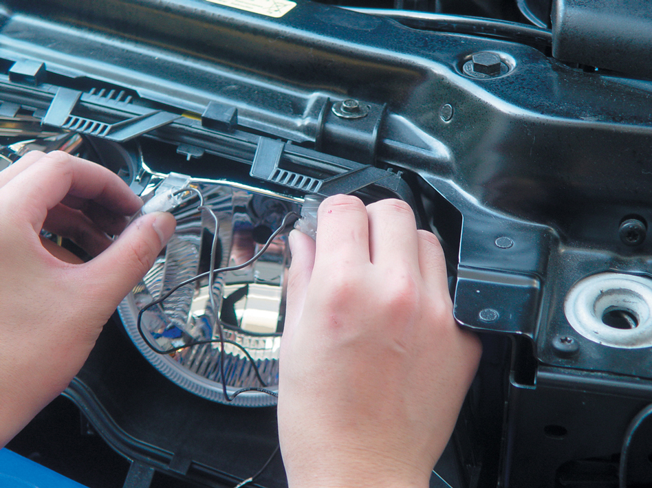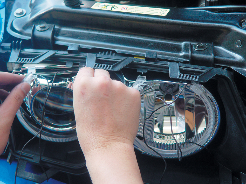 Also, when installing the new halos, make sure not to touch them. Like HID bulbs, oil and dirt from your fingers can cause serious damage to the halos. After clipping on the halos to the headlight surroundings and connecting them to the control boxes, check that all four units work correctly. Always test your work before putting the pieces back together, which will save you a lot of time and headaches in the long run. Once you have checked that all four halos work correctly, then you can reassemble the headlights.