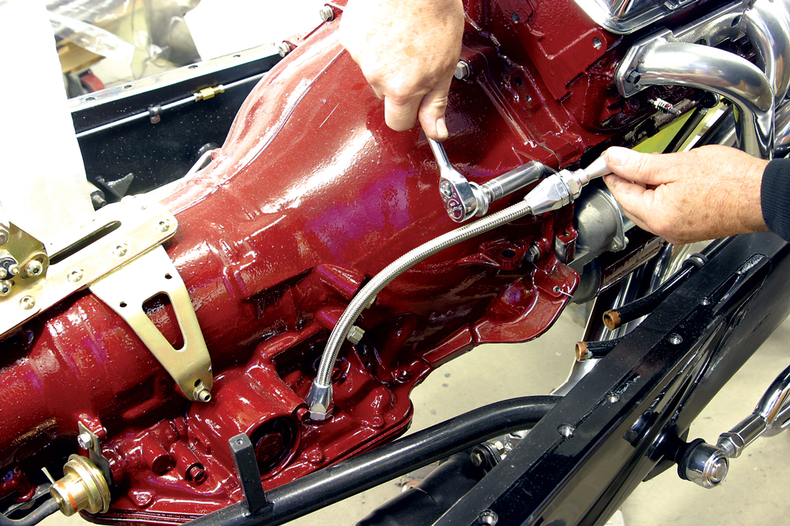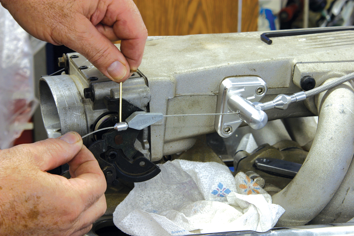 The kick-down cable housing needs to be cut to length before the transmission end can be installed. We dummy our TPI fuel injection, mount the Lokar bracket and stud, route the cable under the TPI runners and mark the desired length. Follow Lokar’s instructions and cut the housing.