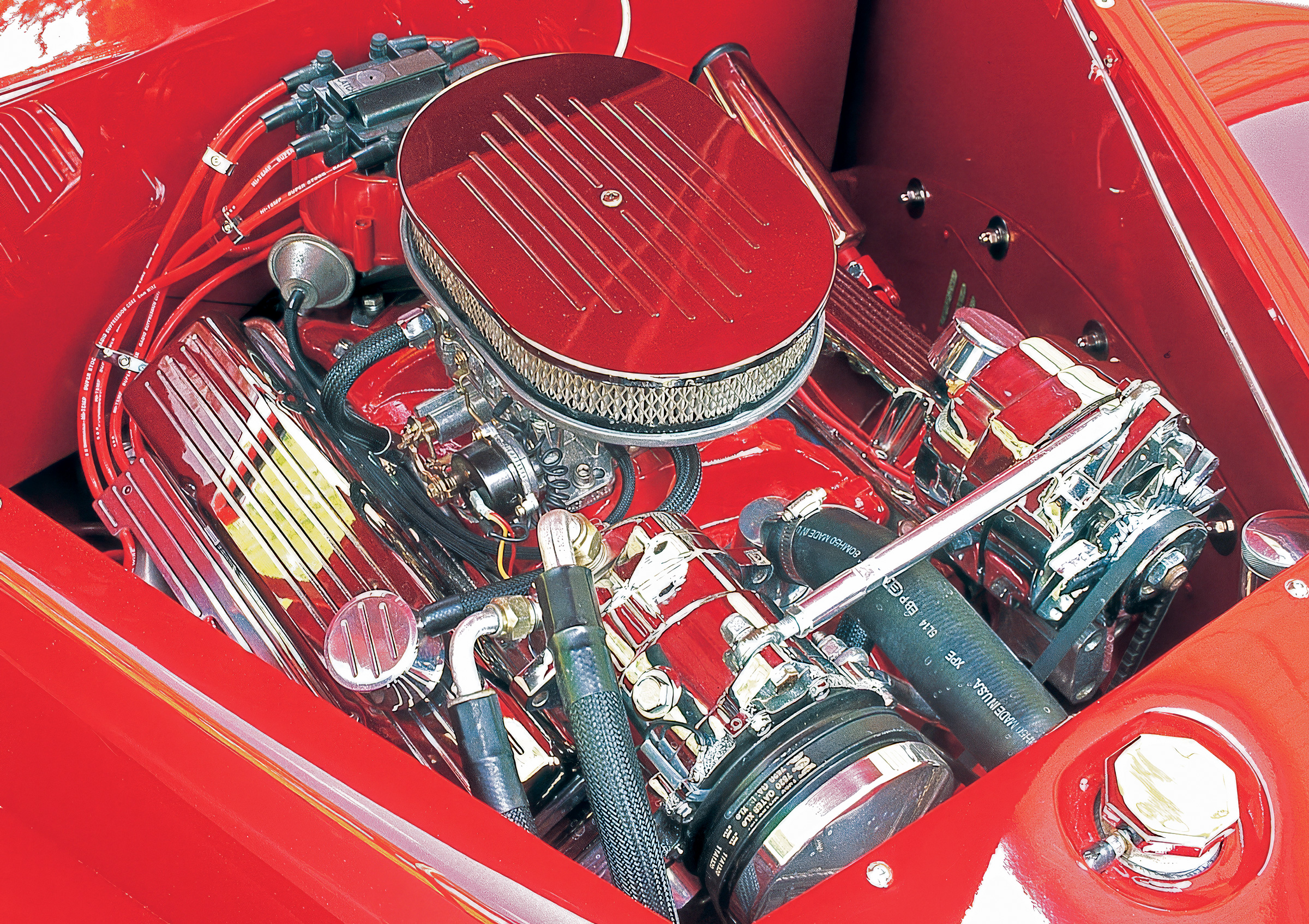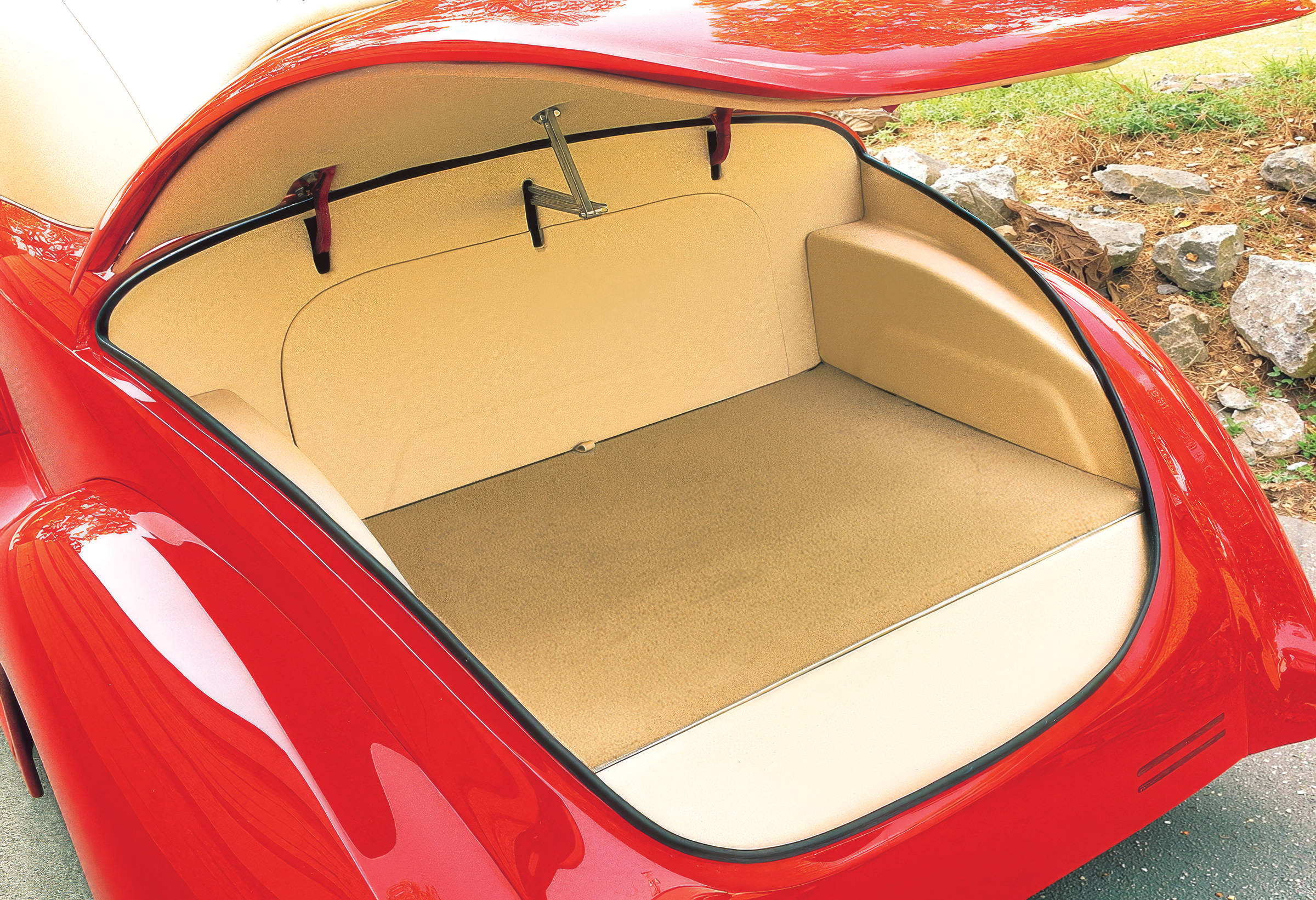 This particular example benefits from an absolutely stunning surface coated in red BASF paint, as we mentioned earlier, by Ted Pulsifer. It’s also unique in that, unlike the other Coast to Coast bodies you’ll see, this one has power curved-glass windows. The windshield is also special in that it was cut down from an ’82 Toyota Tercel, as is the grille and adjoining lighting, which was specially adapted to this car. The same hot finish can also be found on the bottom side of the fenders, and it follows to the engine compartment, a nicely detailed 350 Chevy and the adjoining drivetrain and chassis. Other special touches include billet valve covers and a matching air cleaner, and equally brilliant hardware elsewhere.