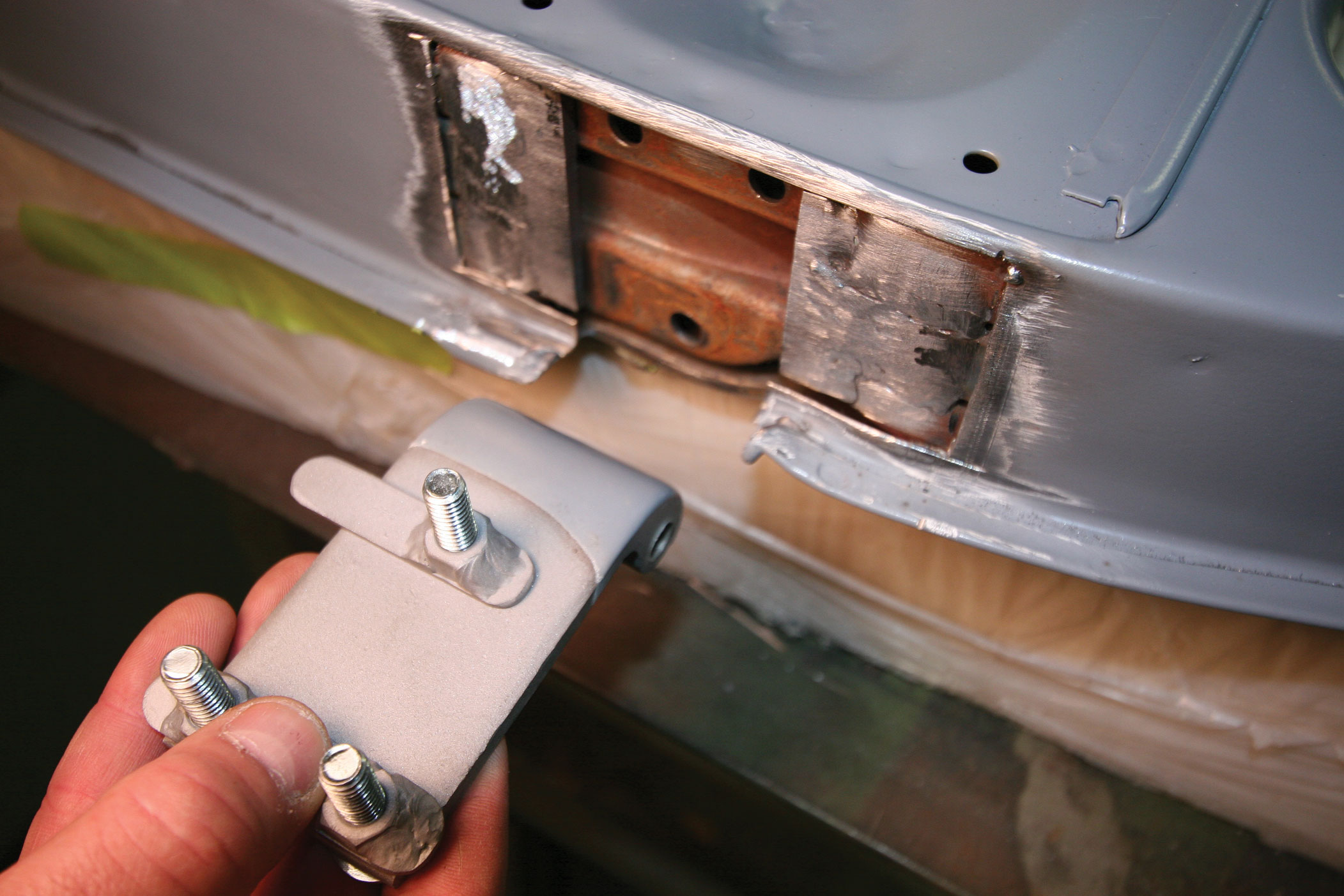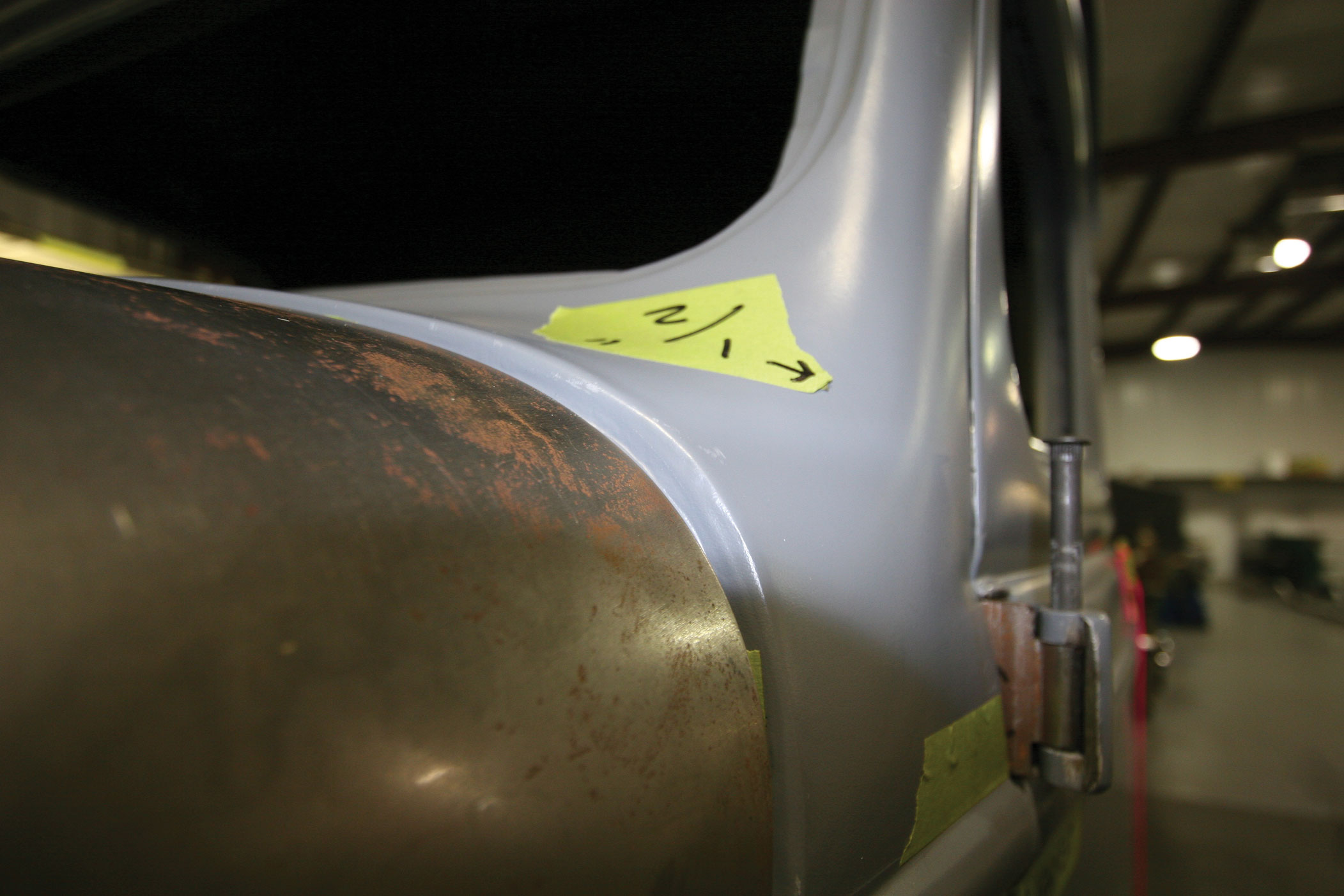 With the flexing issue resolved, we can align the panels so that the bodylines match up. Unlike a car or truck from later years, the external-hinged cars are unable to be adjusted up or down by loosening the hinges. The only option here is to cut and raise the striker to allow for proper alignment.