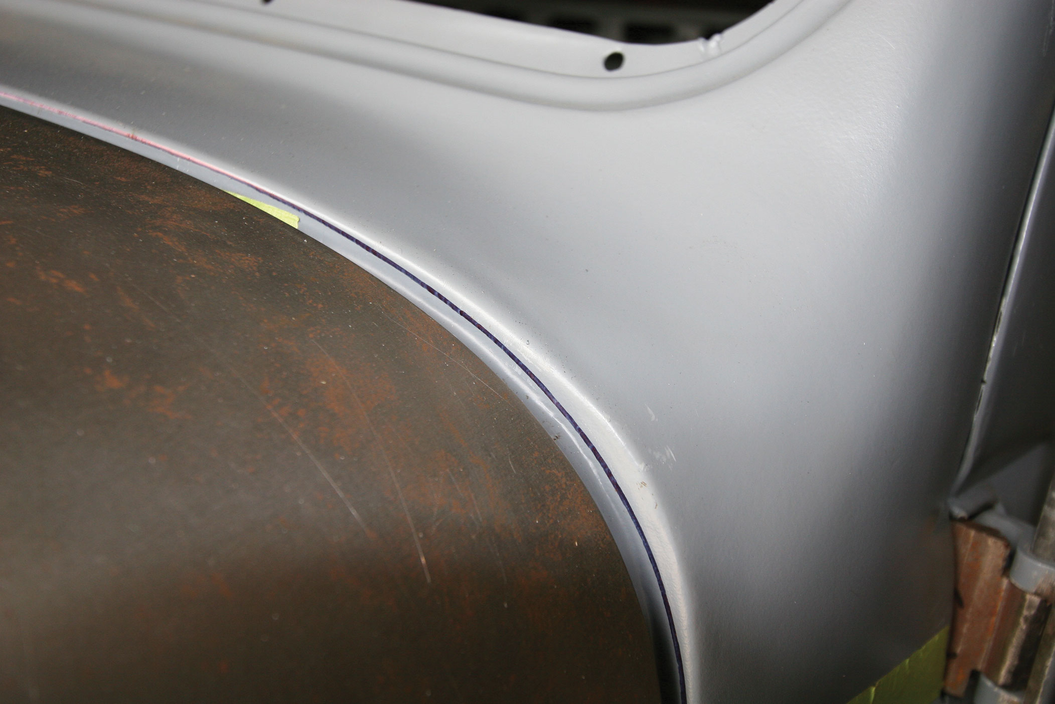 The last area that we want to repair is the actual door gap between the back of the door and cab. We’ve already fixed the alignment issue with the beltline, but now it’s time to get those gaps just right. We’ll cut along the marked line, add to the door and then grind it back to make the gaps measure a consistent 3/16 inch.