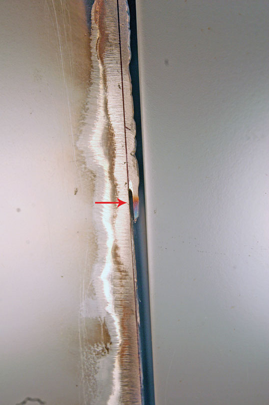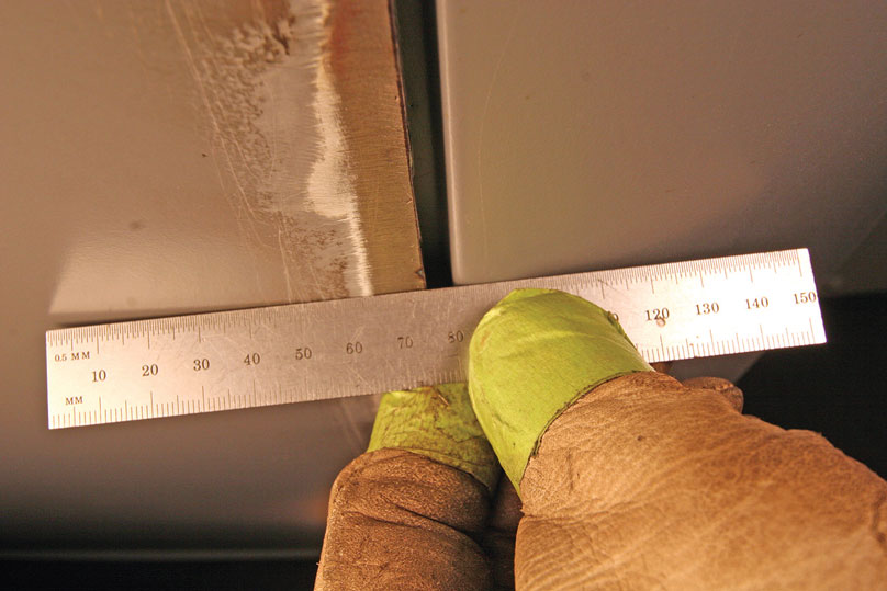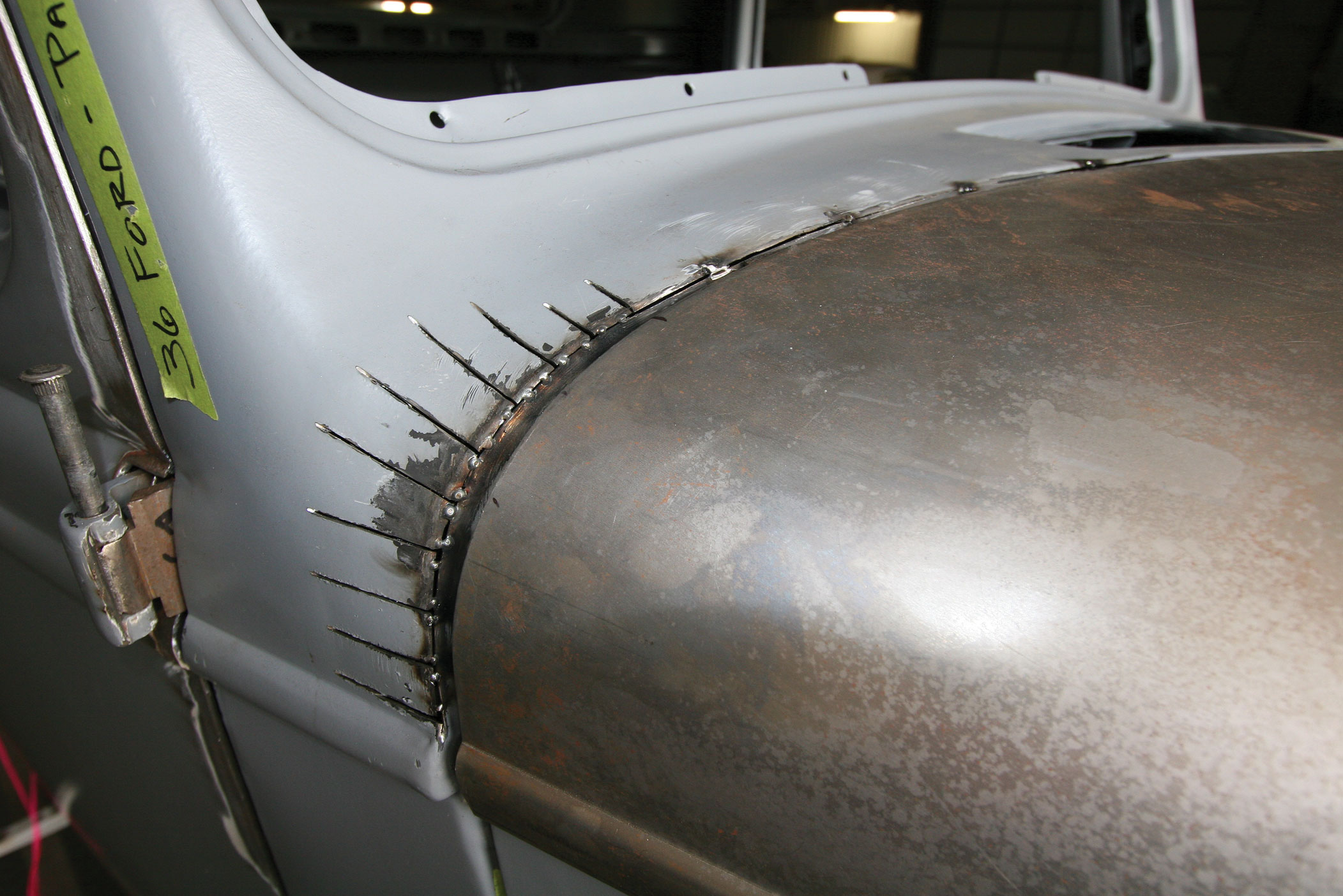 The gaps on this ’36 Ford pickup are very inconsistent, which is normal, but we’re going to change that. The current door-to-cab gap is 9/32 inch in this area, so we’ll simply weld a 1/8-inch rod on the edge to get our desired gap.