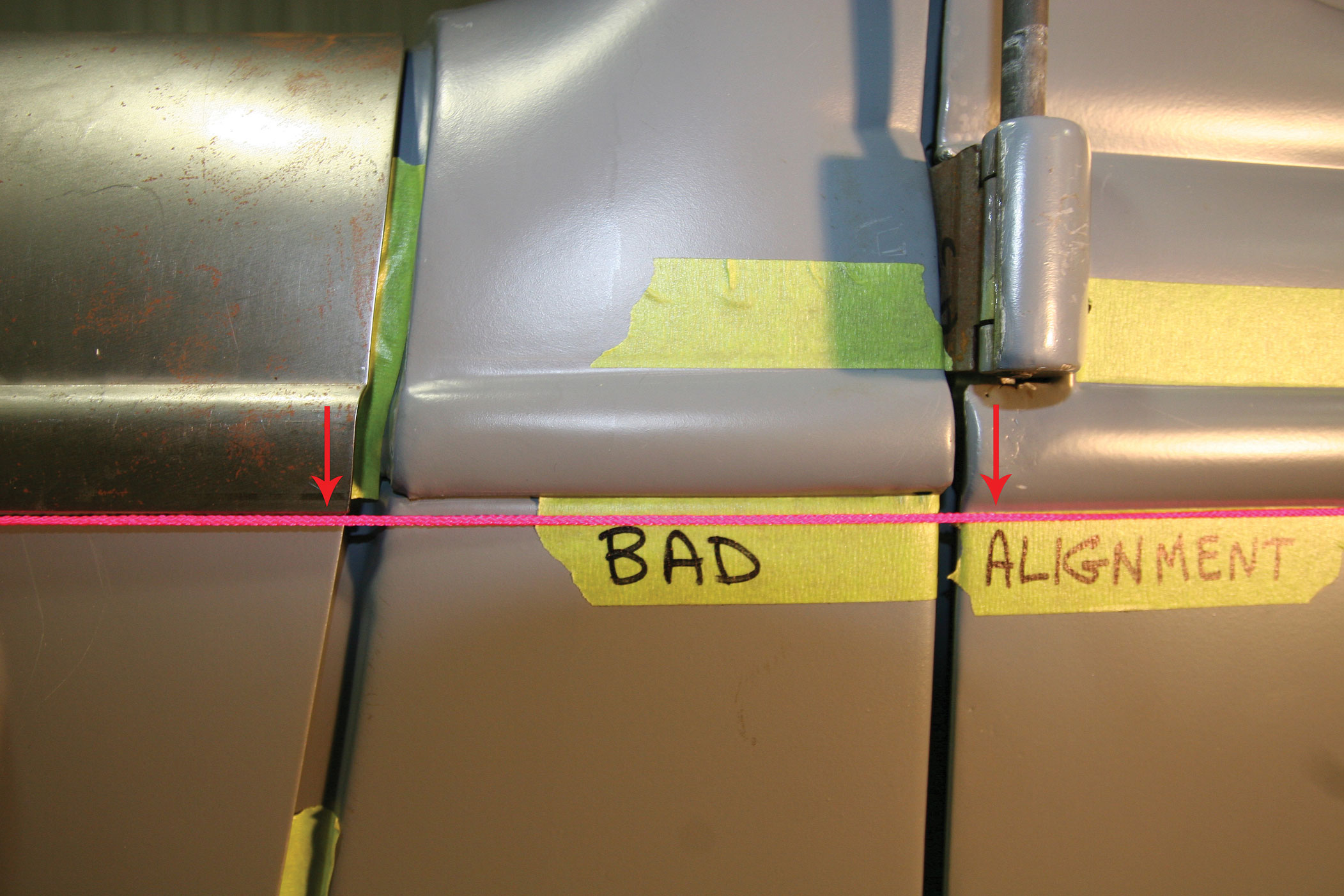 Using a piece of string, we can illustrate the difference in the bodyline from hood to cowl and from cowl to door. All of our other alignments have been made, so we can turn our attention to this area and perform any modifications necessary to make it all line up.