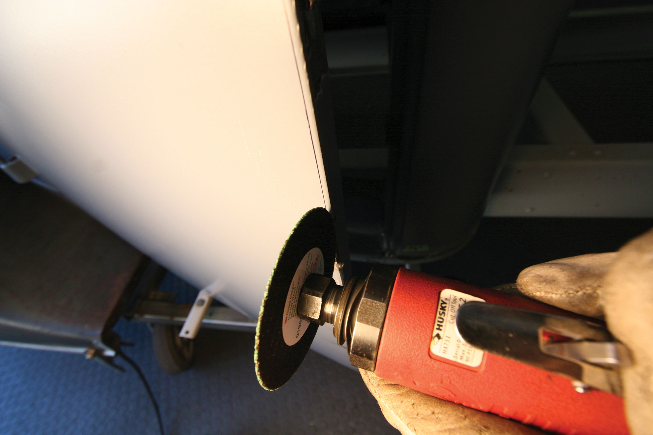 Using an air-powered cut-off tool, we can cut the edge of the door and then tack-weld it to keep the panel from splitting and separating. This will retain the thickness of the door’s edges and make for a clean look.