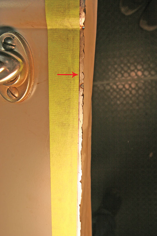The doorpost guide pins are in place, and the dovetails (shown in photos 11 and 12) slide precisely into place. We did, however, have to touch up the edge of the doorpost (see red arrow), as it was misaligned for many years and bent the edge over.