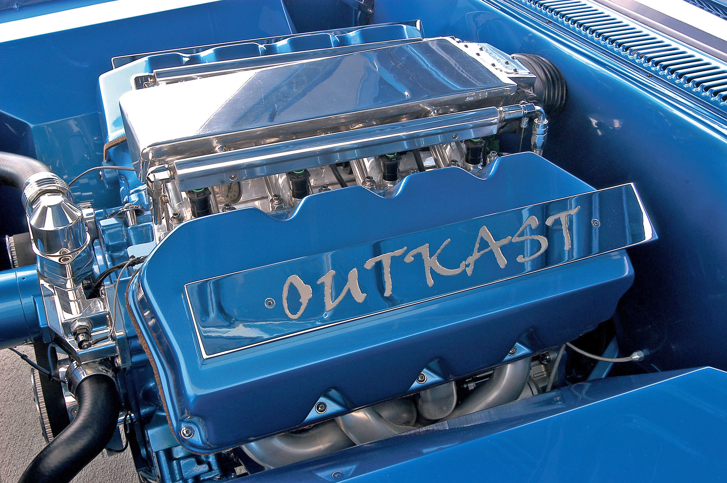 Along with these performance components, the block and heads were ground smooth for a slick finish, and the Indy valve covers are modified with custom plug wire covers that read “Outkast.” With all the power produced by the Hemi, a good transmission was needed, so a Chrysler 727 Torqueflite was used. A Turbo Action torque converter with a 3,200-rpm stall speed controls the power when applied. The custom pistol-grip shifter selects the gears in the modified three-speed automatic.