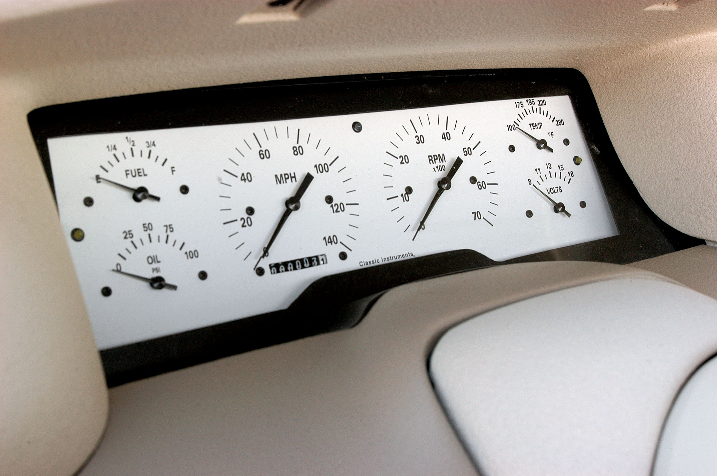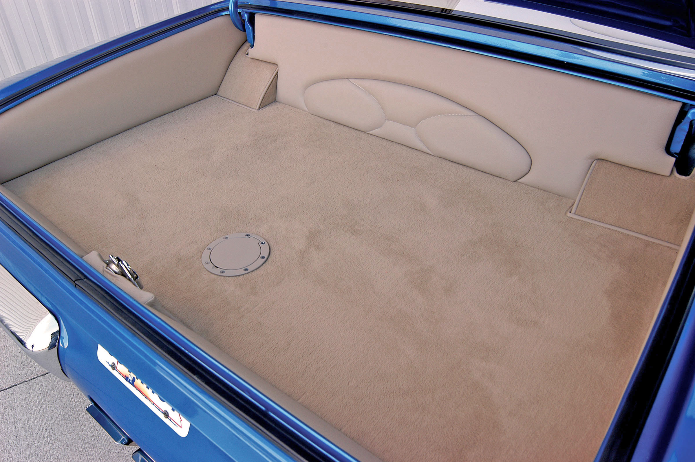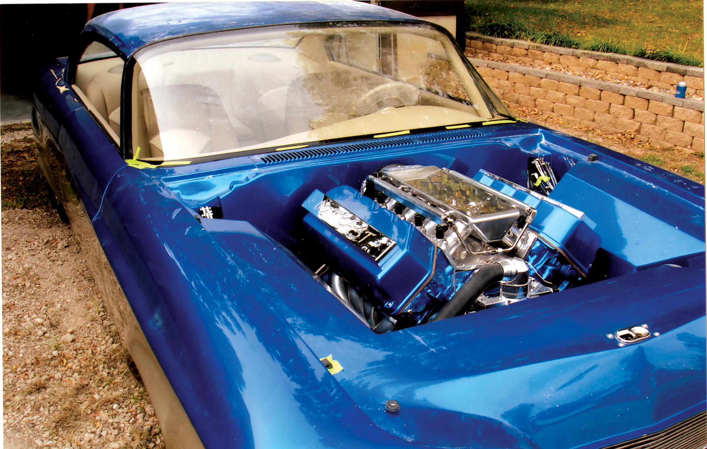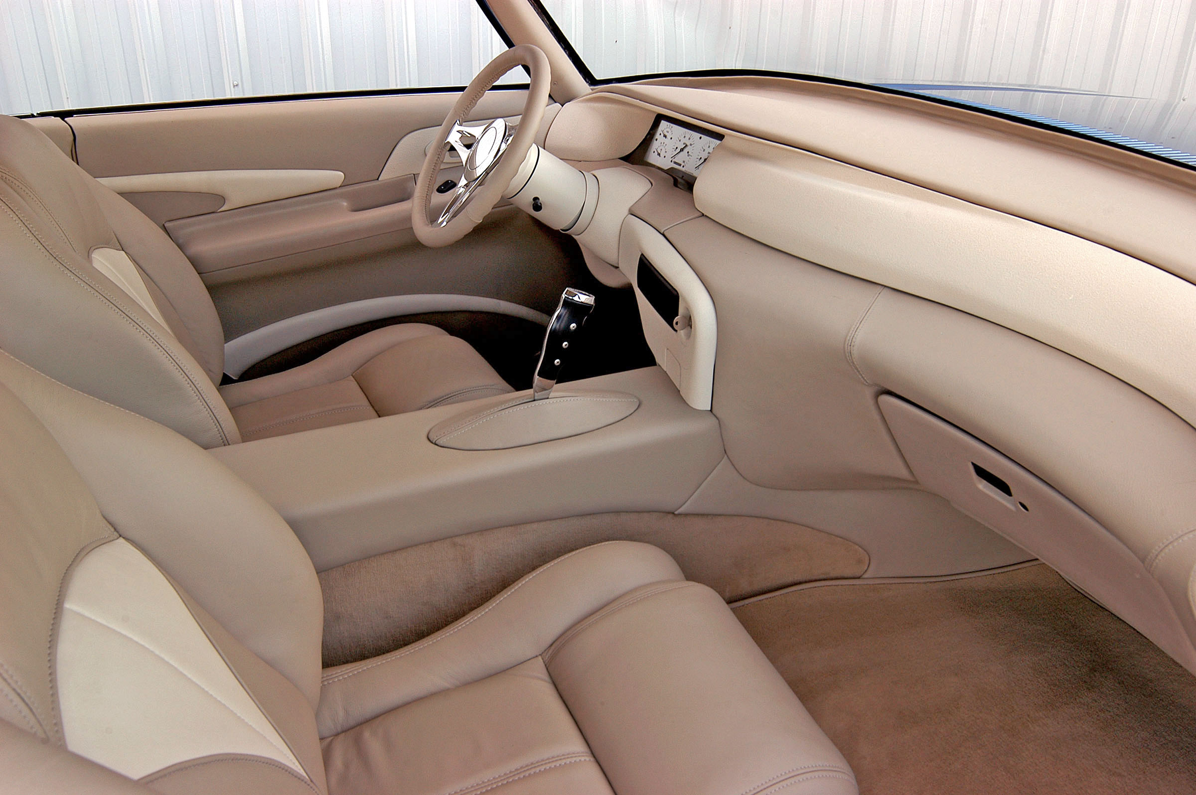 A great car would be nothing without a great interior, so Buzzello and Steve Gantz formed all of the interior parts from wood and fiberglass. The door panels and dash came from a Ford Windstar van. The dash was modified extensively by using fiberglass to mold a new shape and carry the design into the door panels. Inside the dash is a white-faced Classic Instruments cluster. A custom console was then fabricated, which runs from the dash to the package tray between the bucket seats used in the front and rear. After the interior panels were fabricated, McFall’s Auto Trim, located in Iowa City, Iowa, wrapped all of the components in taupe leather. The ring on the Niser Components three-spoke steering wheel was also covered in the same taupe leather. Audio comes from an Alpine CD player and Kenwood speakers. A Kicker amp powers the sound system and the Kicker subwoofer. Bob Gantz wired the engine and all the accessories for the Fury with a Syntec kit.