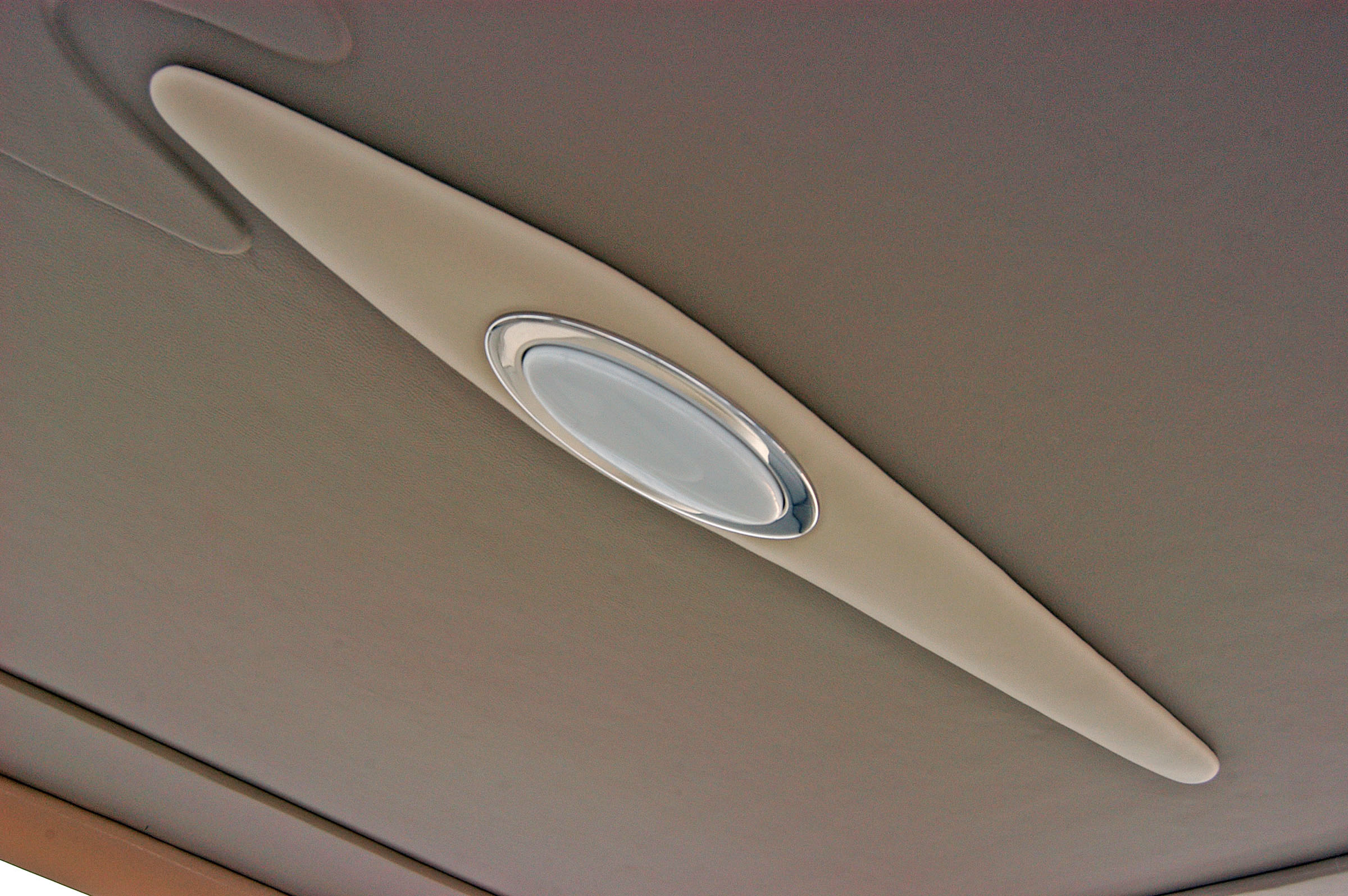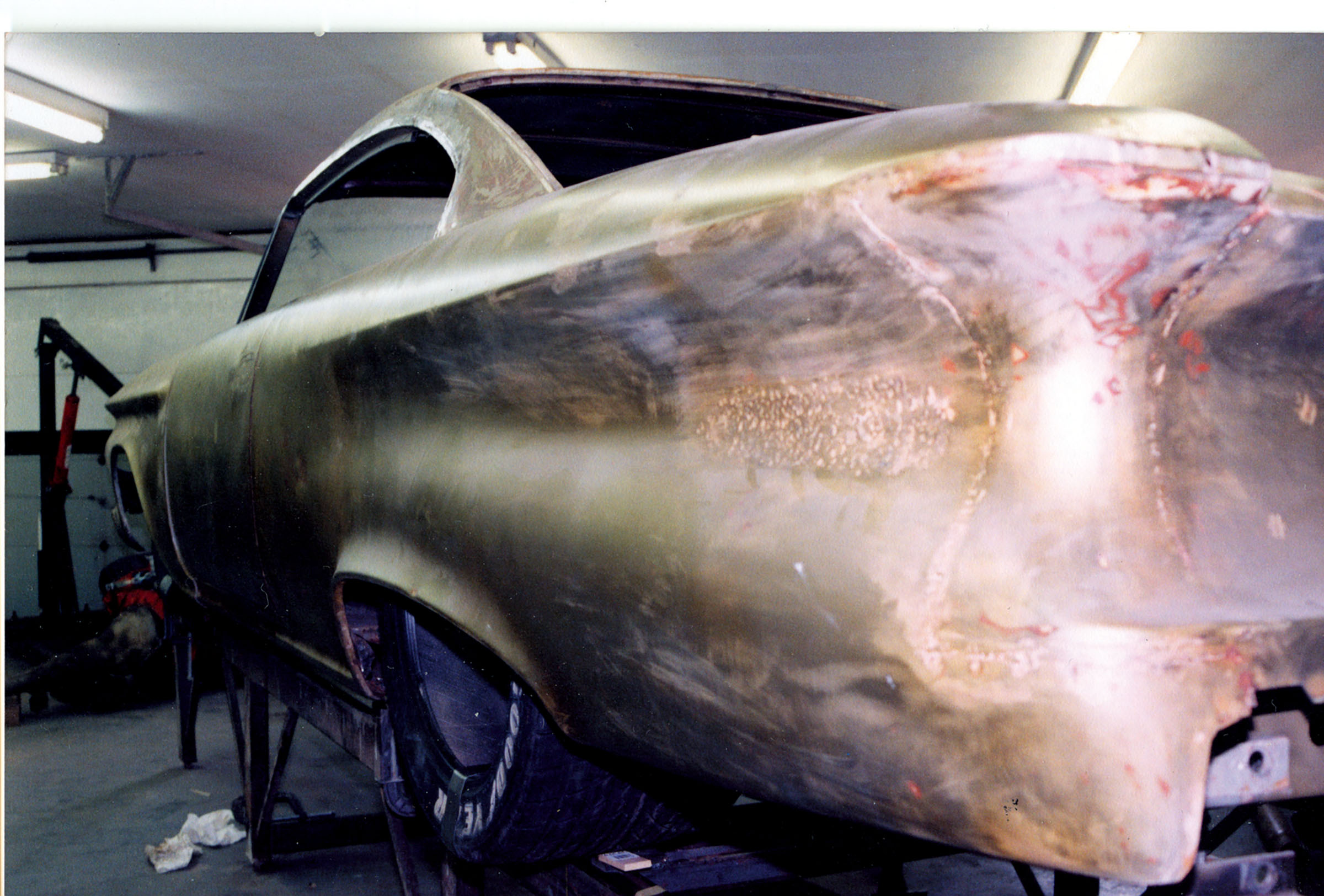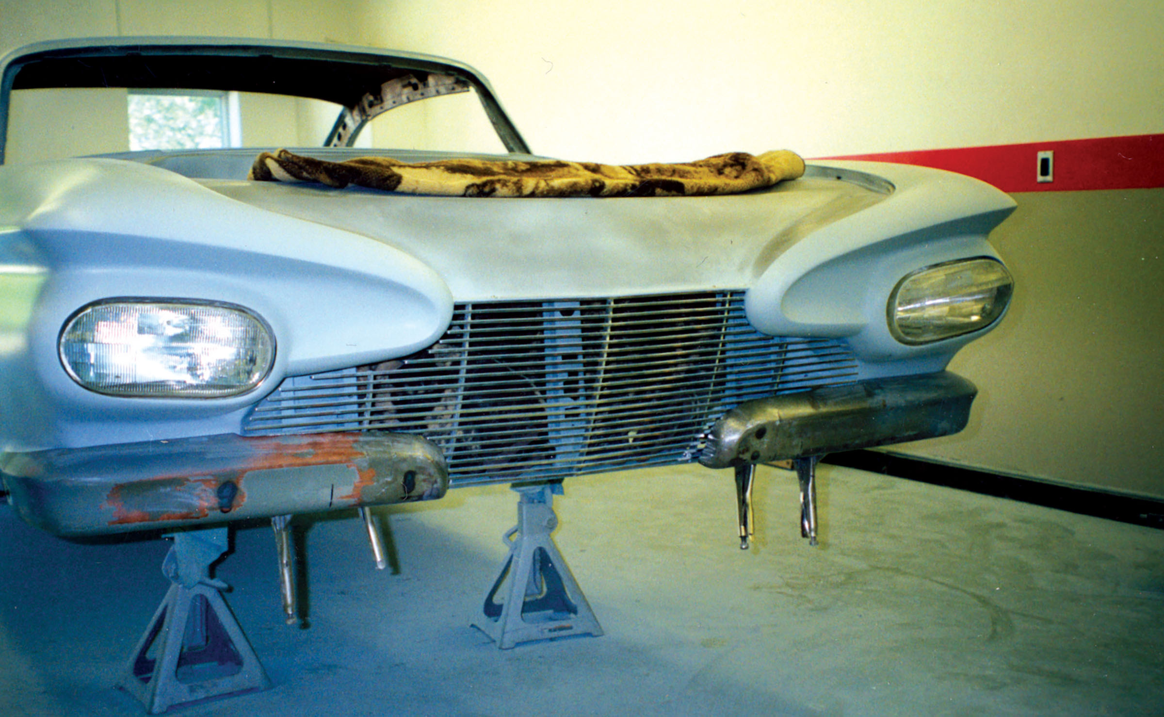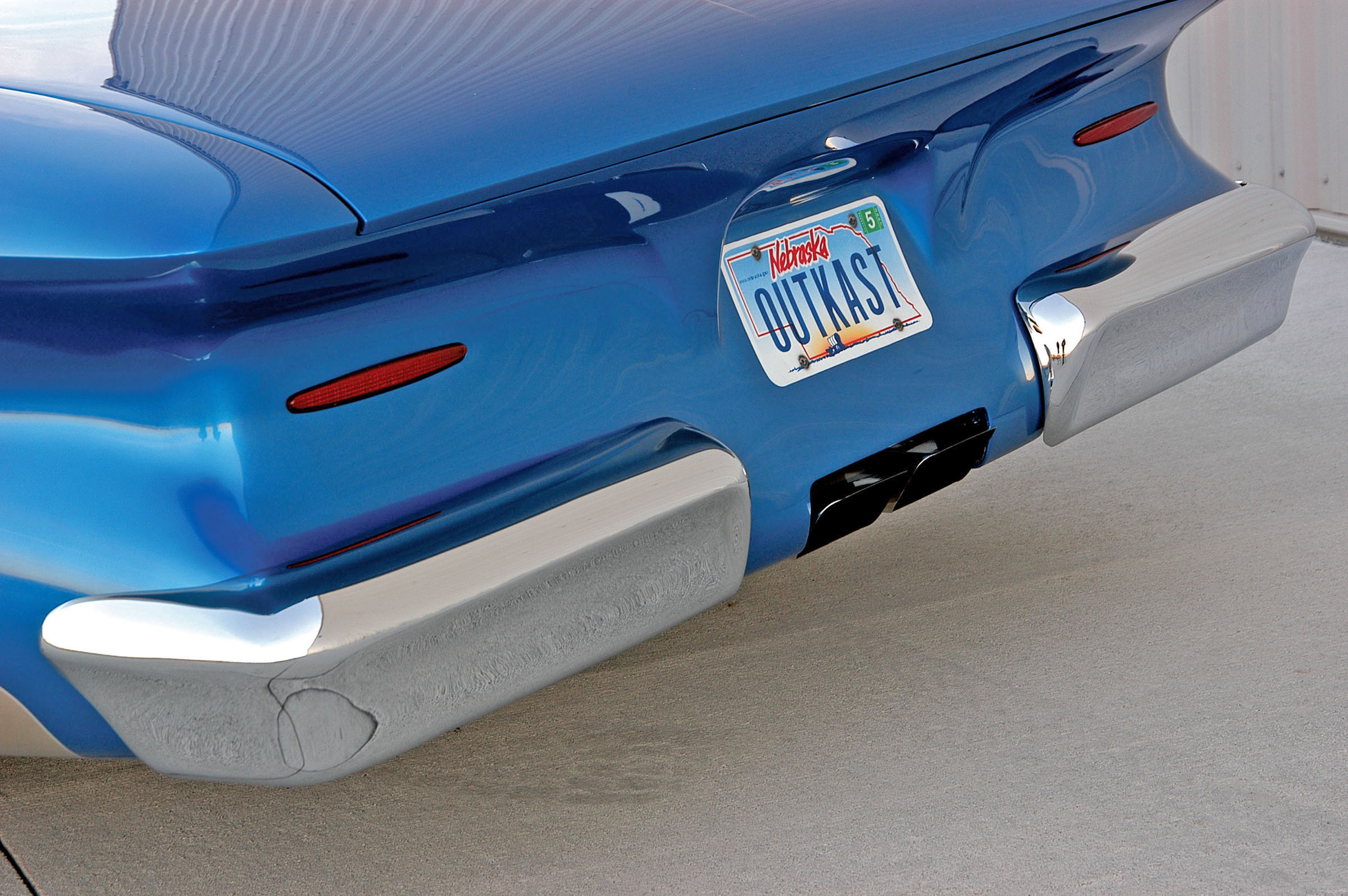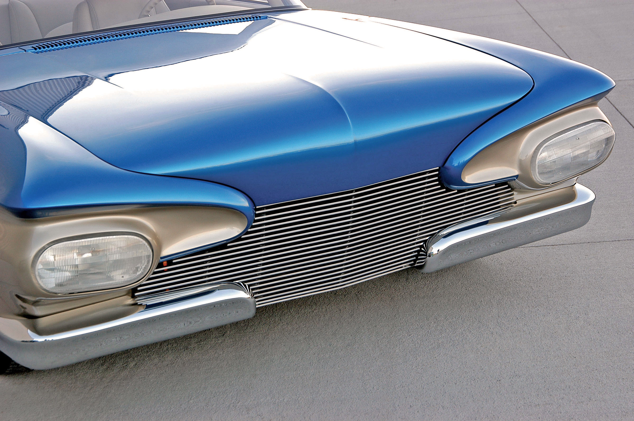 Buzzello started with a great body from California, but leaving it stock would be too easy. These cars had unique styling to begin with, but Buzzello, along with Gantz and McGrath, made modifications to every panel on the Fury. Extensive metalwork was performed on the car to amplify the extreme statement these contours make. The front of the hood was lengthened 4 inches and the fenders were welded to the body, making the transitions smoother and more appealing. Hand-built buckets house Jaguar XJS headlights that are slightly canted to match the angle of the bodylines on the front fenders. The front bumpers were split and reshaped to better fit the body, and the one-off Jim Rench grille fits nicely between the fenders. Also, the bodylines on the fenders were extended into the doors, gradually tapering into a point. All handles, emblems and trim were shaved, giving the Fury a clean look.