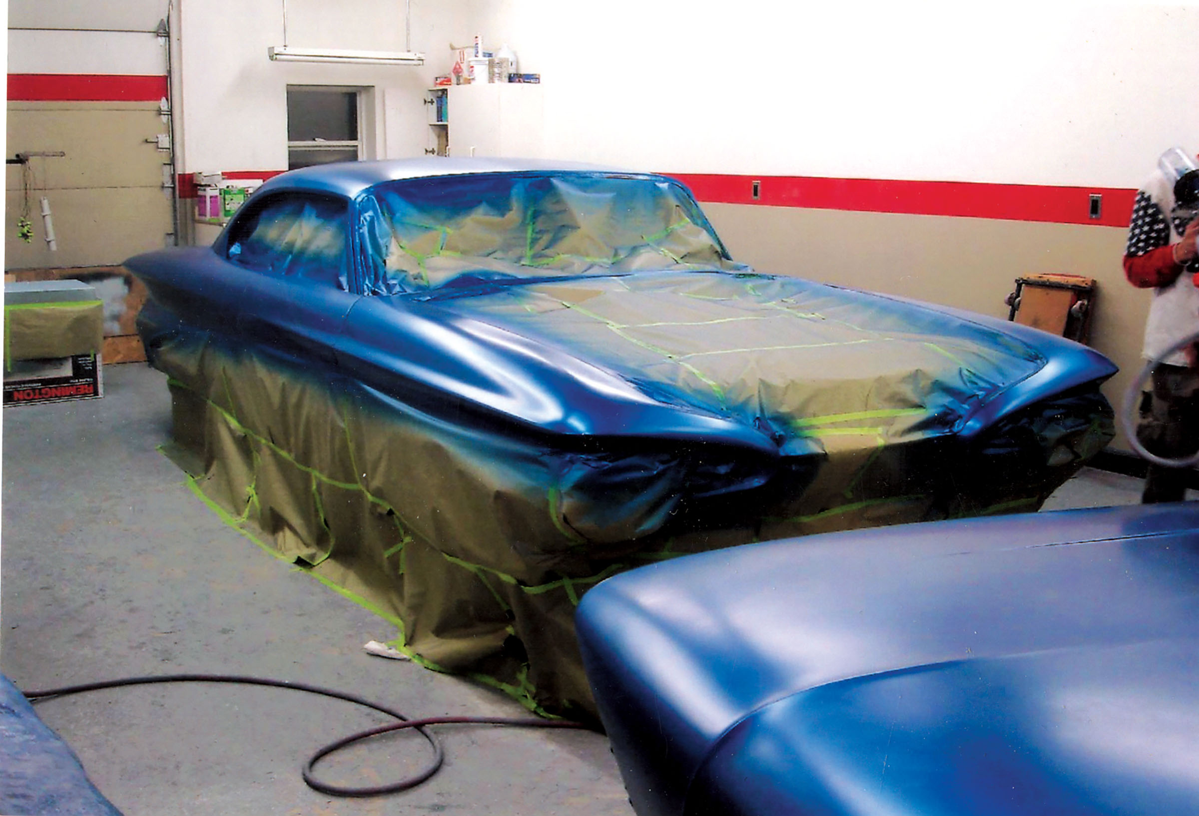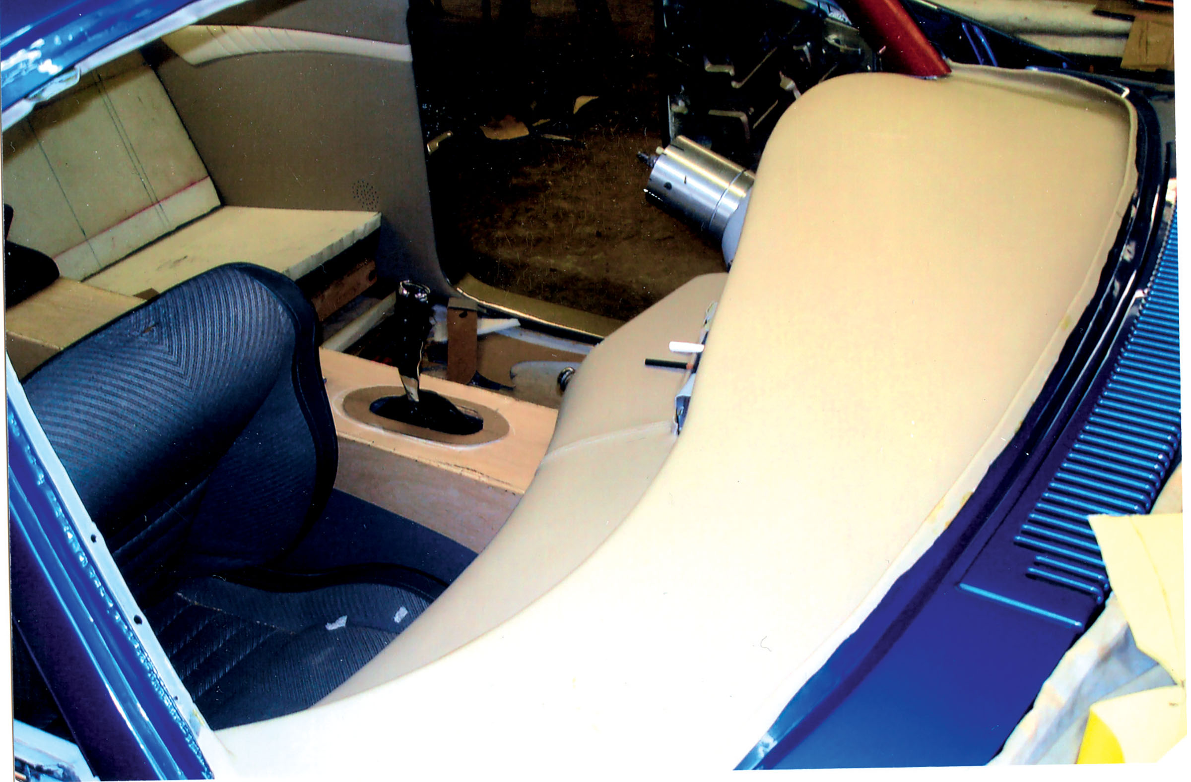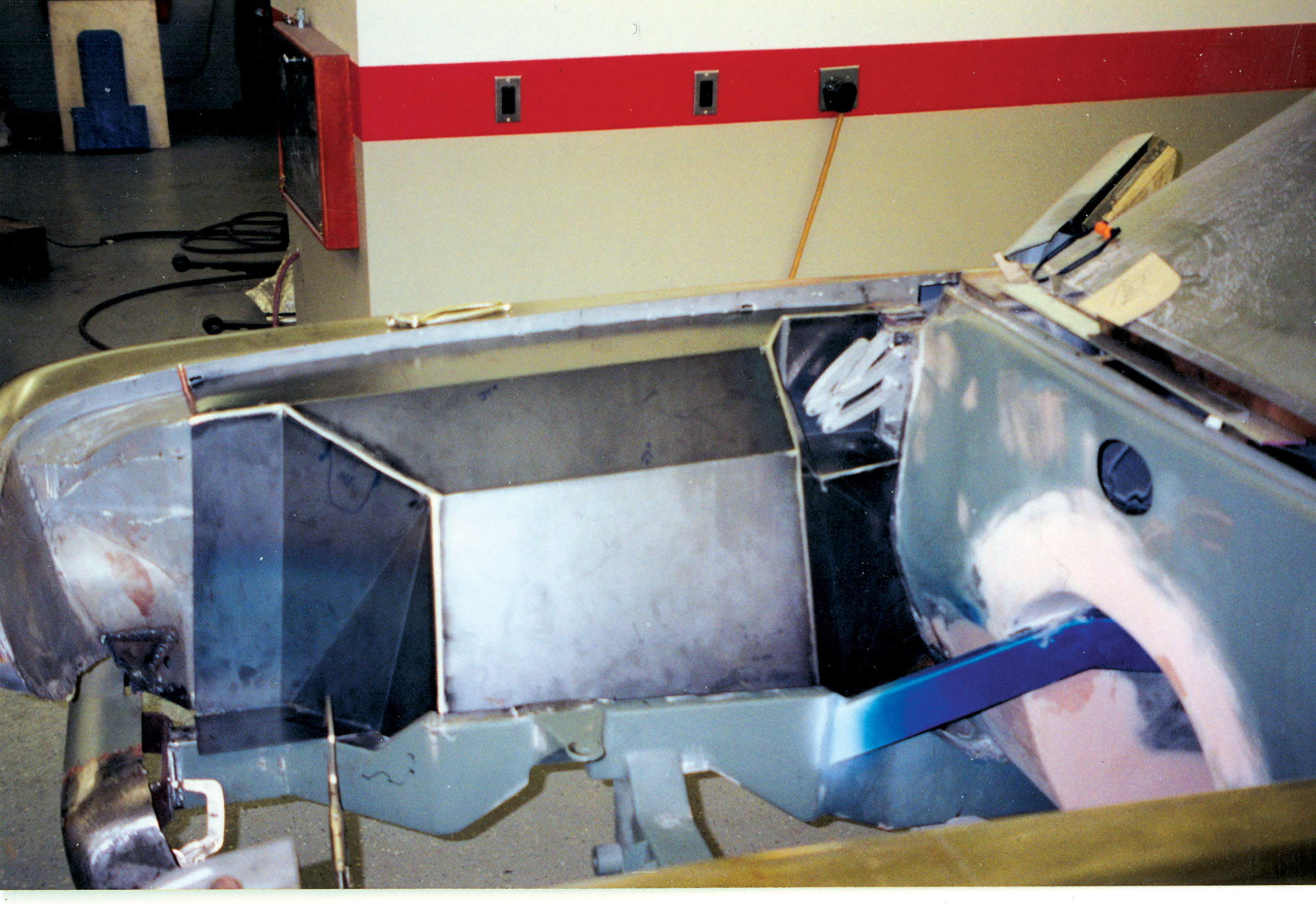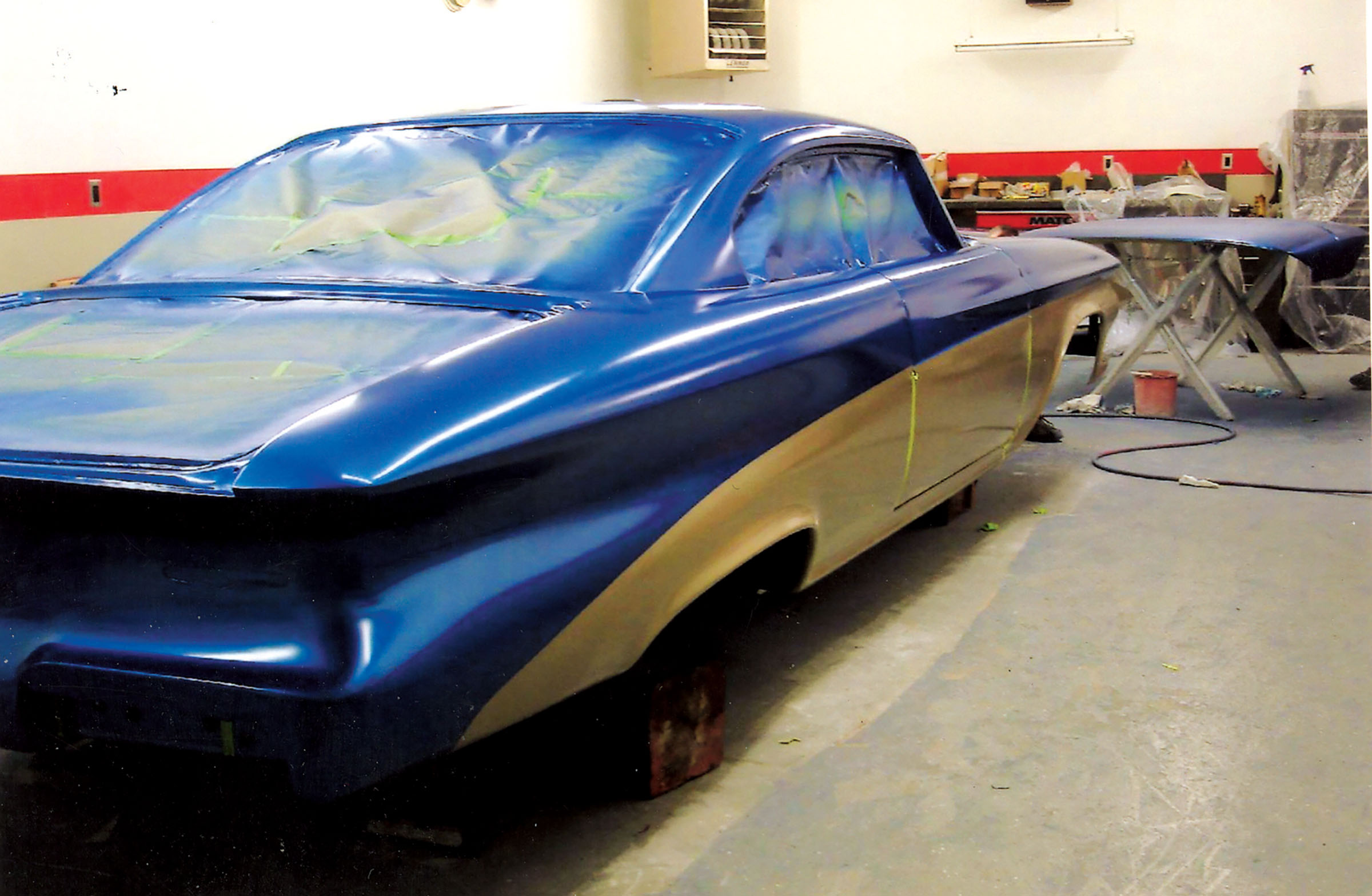 Along with all that metalwork, the guys spent many hours blocking and priming the body to make sure it was straight, with all of its panels properly aligned. All the painting materials and supplies came from Ron Stazzoni and Mike Cole at D&R Auto Paint and Supply. The two-tone design features Ford Festiva Blue on top with Ferrari Champagne on the lower portion. McGrath applied the base/clear paint, which was soon sanded and buffed to a high-quality finish.
