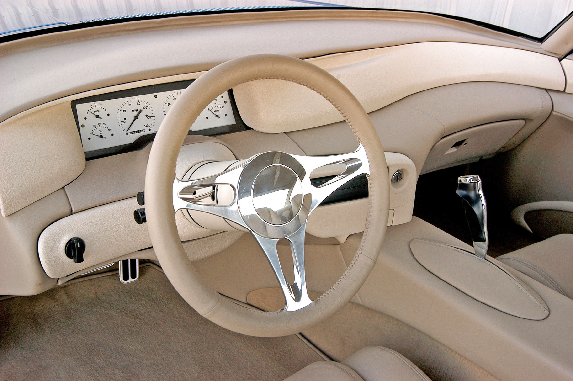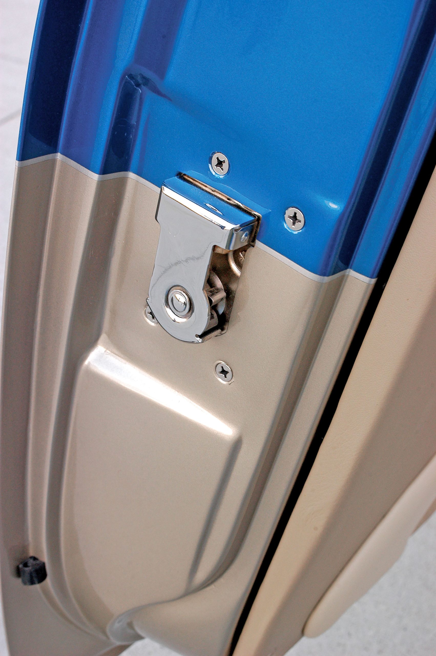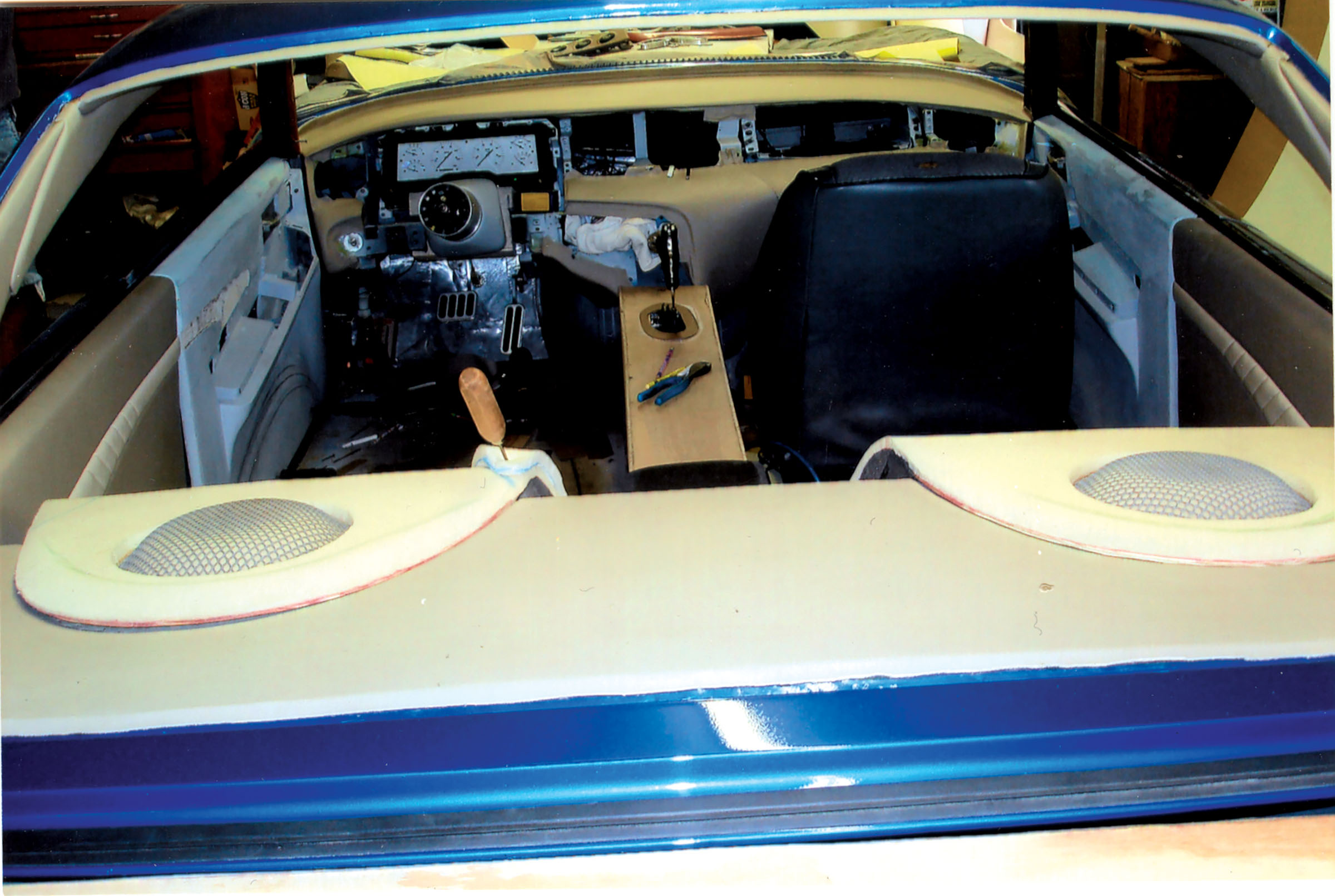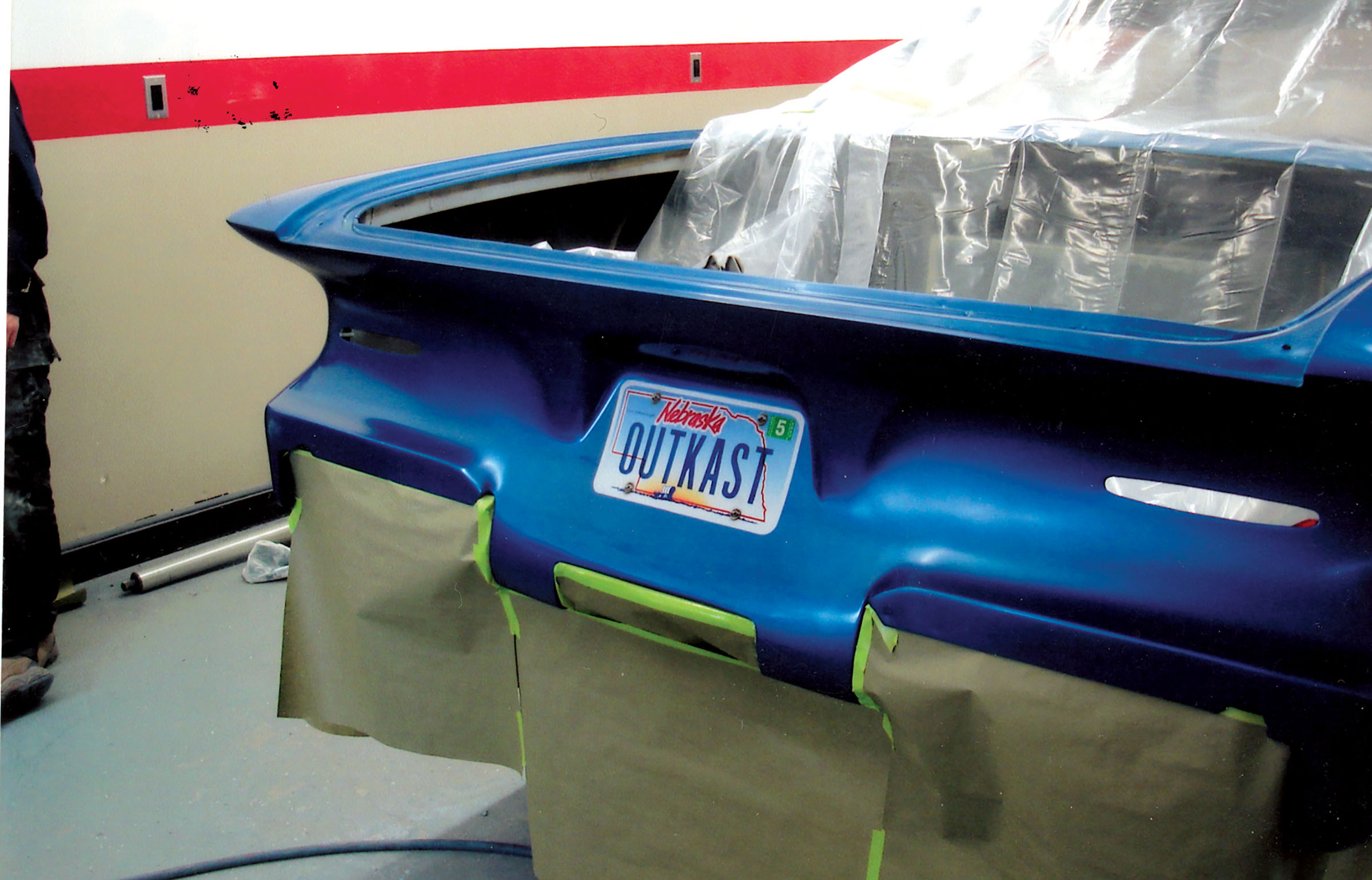 Along with all that metalwork, the guys spent many hours blocking and priming the body to make sure it was straight, with all of its panels properly aligned. All the painting materials and supplies came from Ron Stazzoni and Mike Cole at D&R Auto Paint and Supply. The two-tone design features Ford Festiva Blue on top with Ferrari Champagne on the lower portion. McGrath applied the base/clear paint, which was soon sanded and buffed to a high-quality finish.
