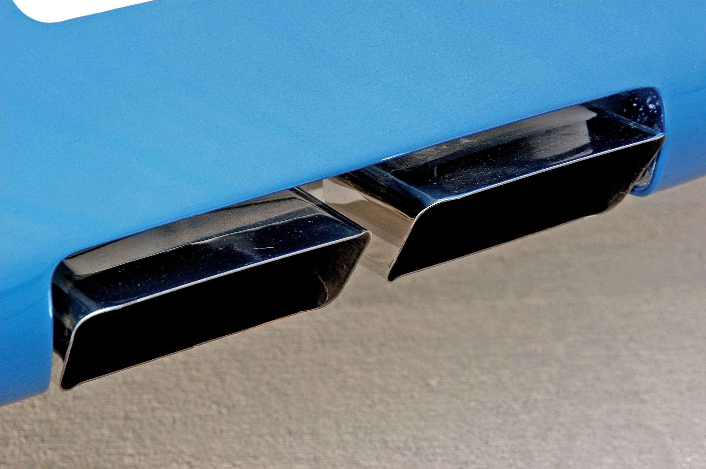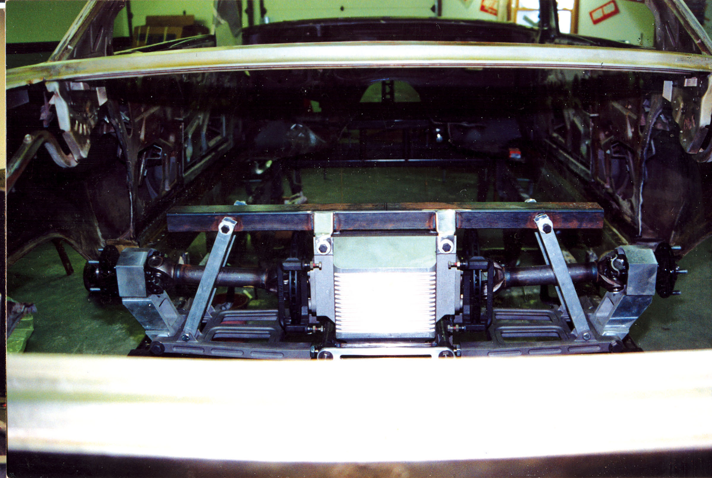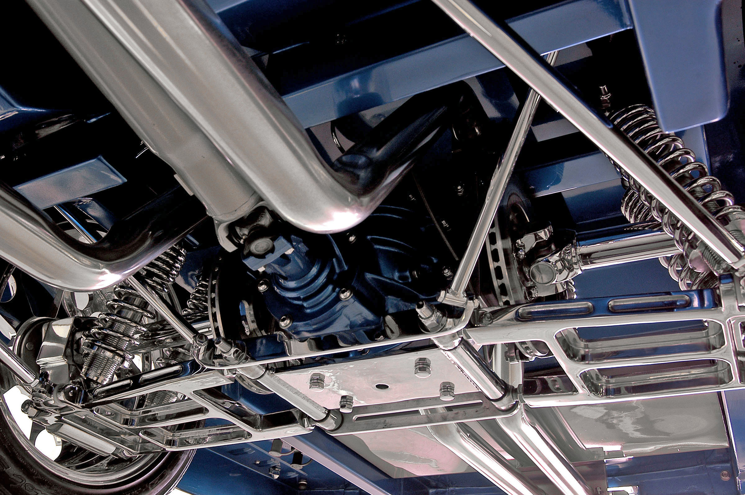 Out back, a Kugel independent rear suspension is in place with a finned aluminum housing and stainless steel control arms. Inside the housing, a set of 3.00 gears transfers power to the chrome half-shafts. Four adjustable coilovers support the weight of the Fury and give it a comfortable ride. Assisting the front discs, the rearend features inboard brakes with slotted rotors and finned Kugel calipers. Huge Michelin Pilot Sport tires measuring 335/35 provide traction and are wrapped around 18×12 Budnik Cannon wheels.