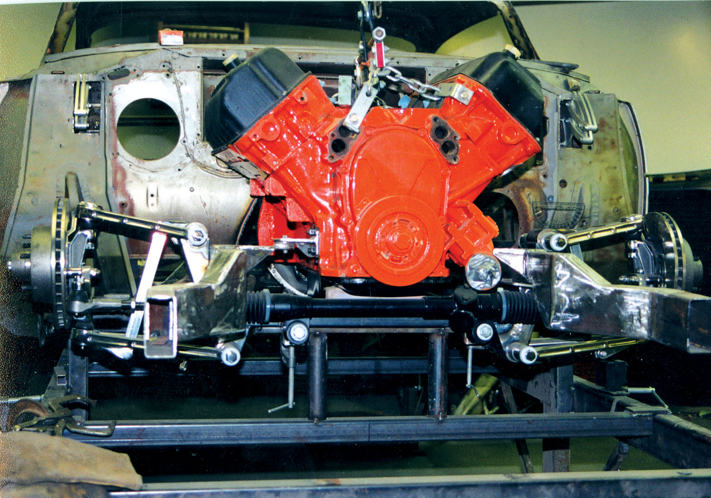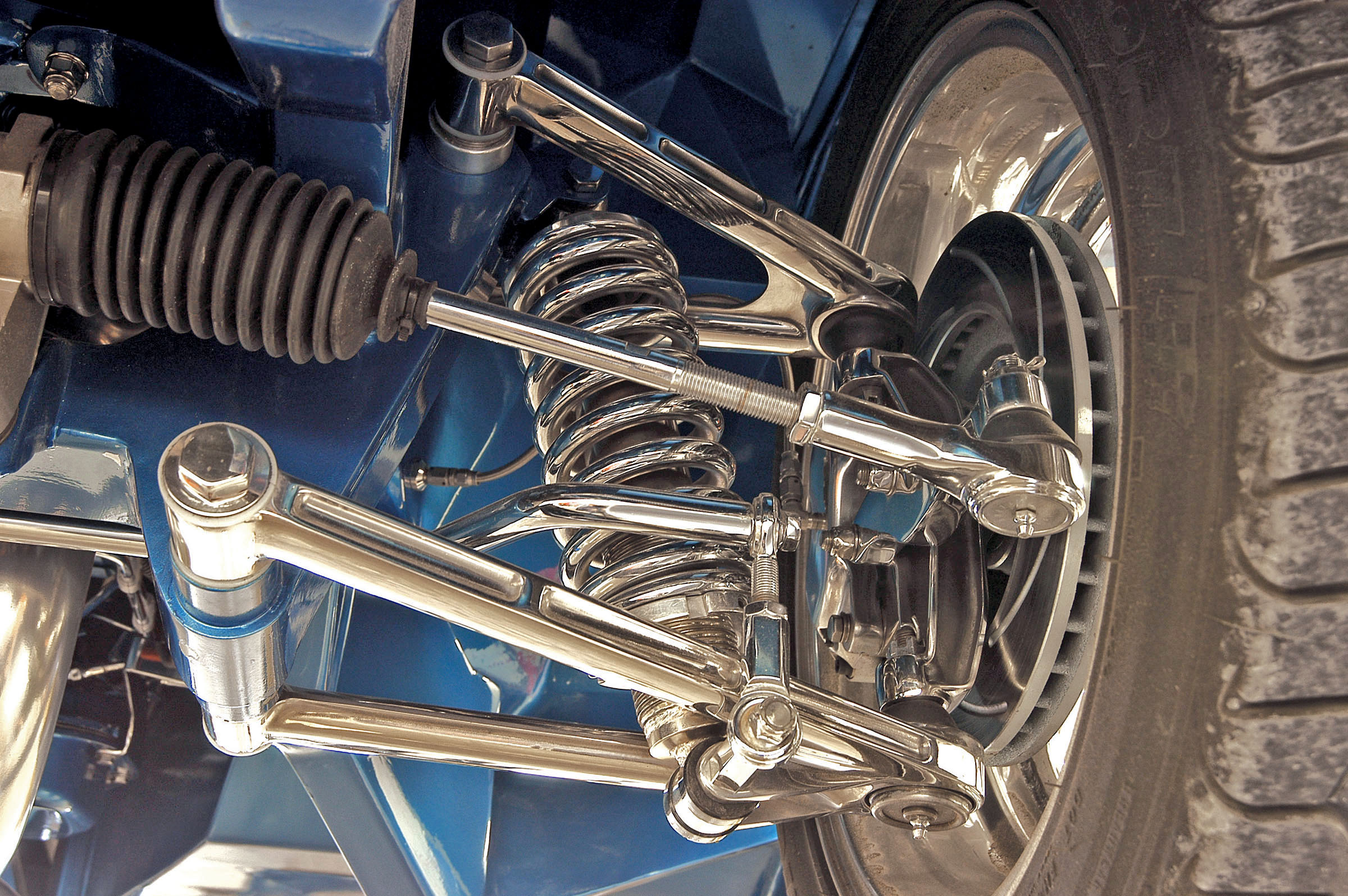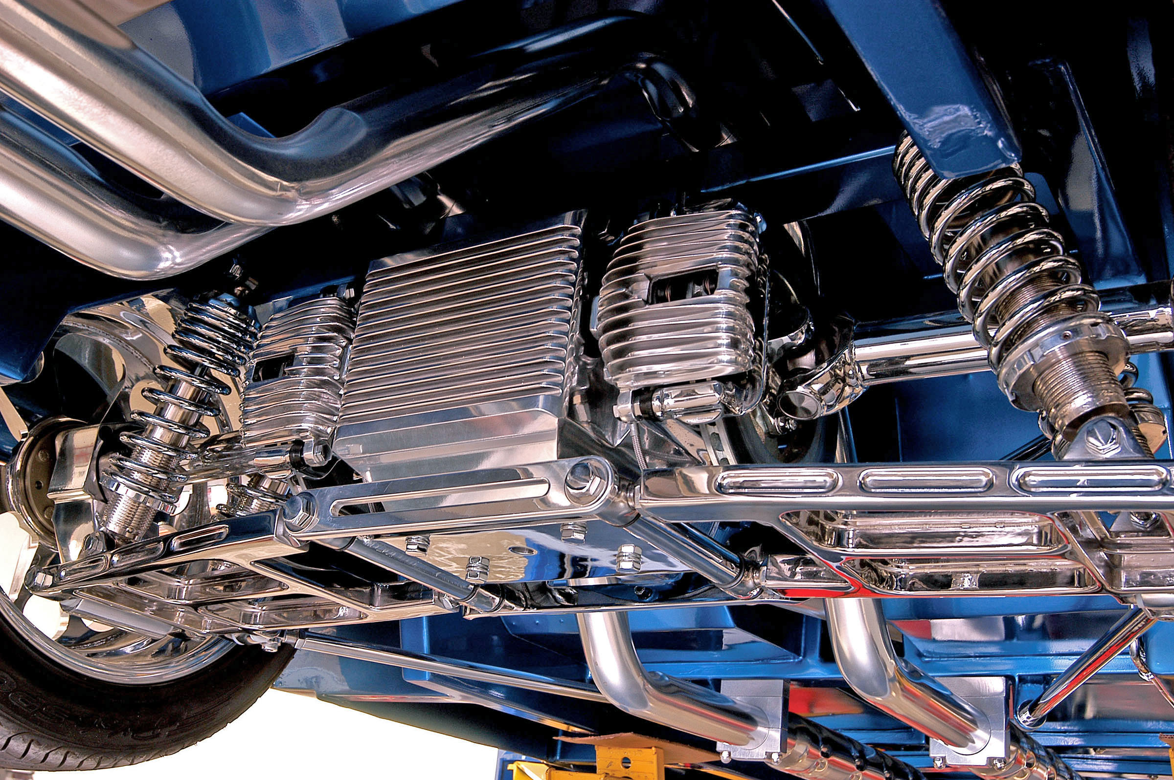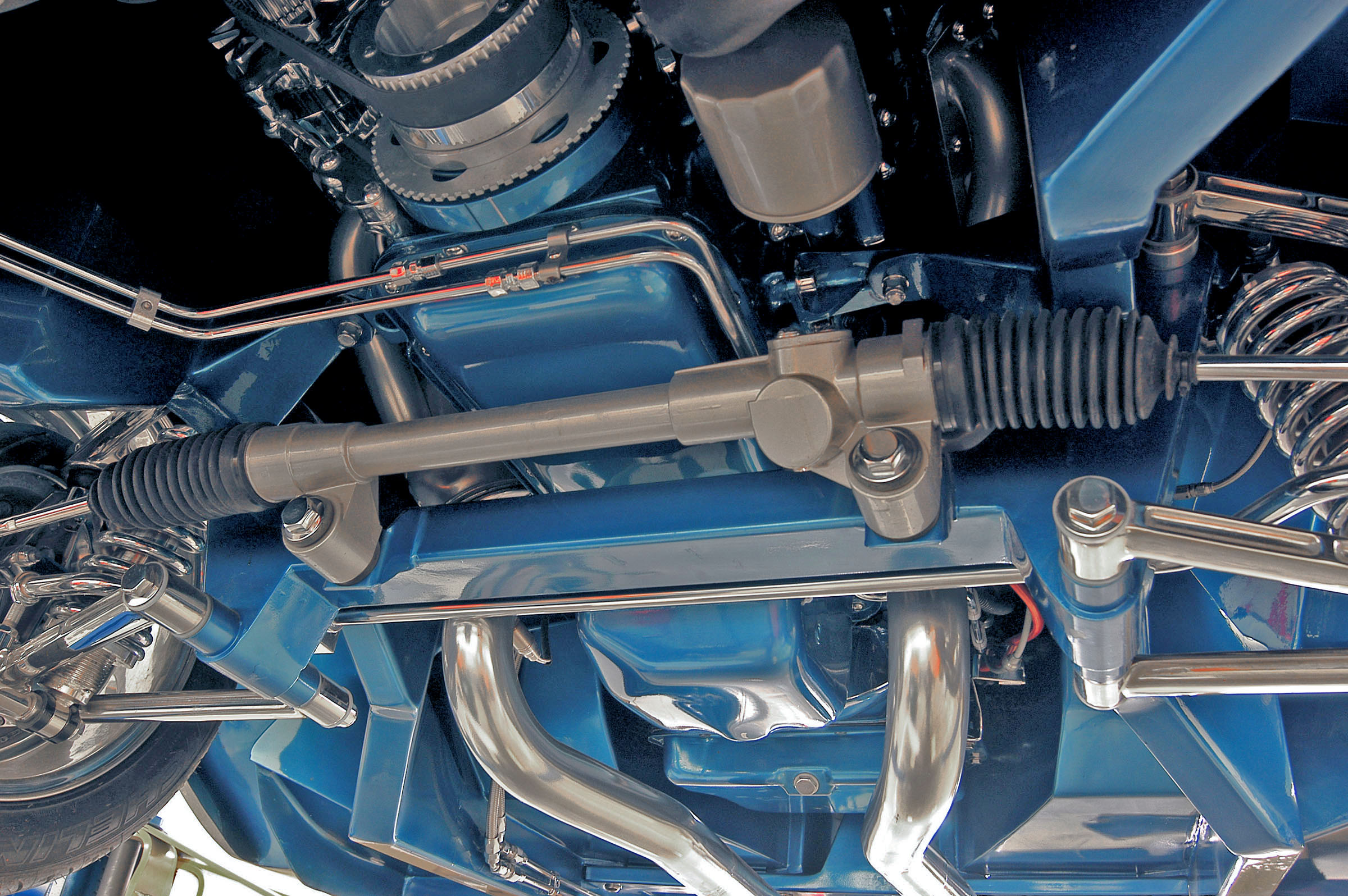 Although Buzzello found a nice, rust-free car, he wanted a full frame under the Fury instead of the original unibody construction. They opted to build a completely new chassis, since it would have been more work to update the old suspension. Gantz, from Des Moines, Iowa, welded the 2×4 mild-steel tubing together, making a super-strong and good-looking chassis. All of the welds on the frame were ground slick and molded for a clean look. In the front, a new crossmember was welded in, allowing the Kugel IFS to bolt up easily. The fully polished stainless steel control arms look awesome and connect to a pair of Kugel spindles. Coilovers soften the ride and a Kugel rack-and-pinion enables the big Plymouth to be steered effortlessly. Wilwood discs with four-piston calipers quickly bring the Fury to a halt. Rolling stock for the front consists of Budnik Cannon wheels measuring 17×8, with Michelin Pilot Sport tires hugging the road.