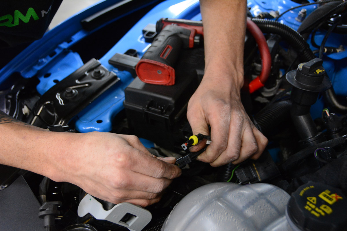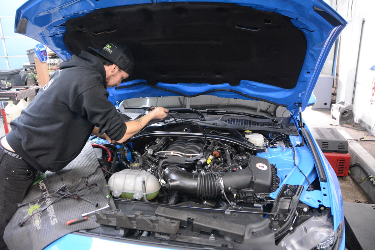Joey Bolden at RM Motor Werks is handling the PROFLEX install on this S550 Mustang. He begins by laying out the injector wiring harness.