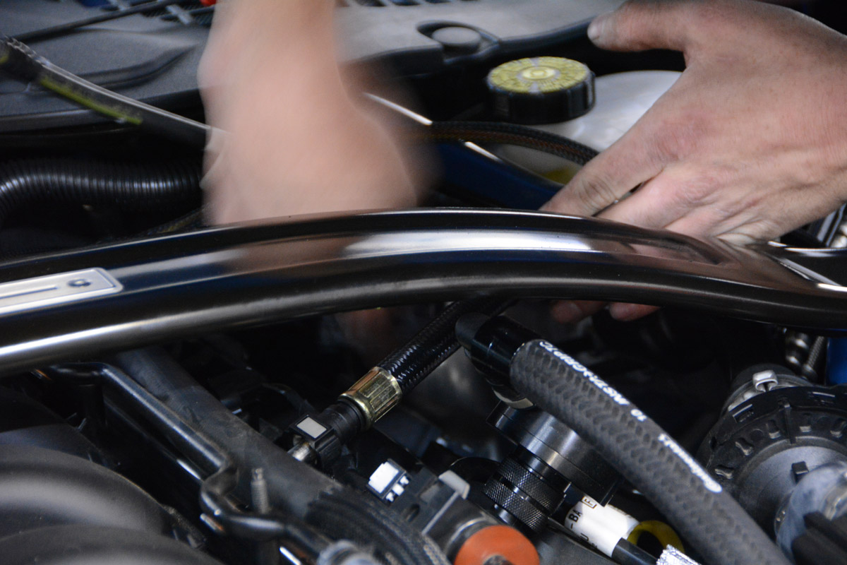 Next is the fuel content sensor install. Using a disconnect tool, Joey disconnects the original fuel line from the engine and then disconnects the line at the firewall bulkhead. Since the fuel system is under pressure, a small amount of fuel may spray from the connection points when they are disconnected. Keep the rag underneath the fuel line in case any fuel drips out during installation.