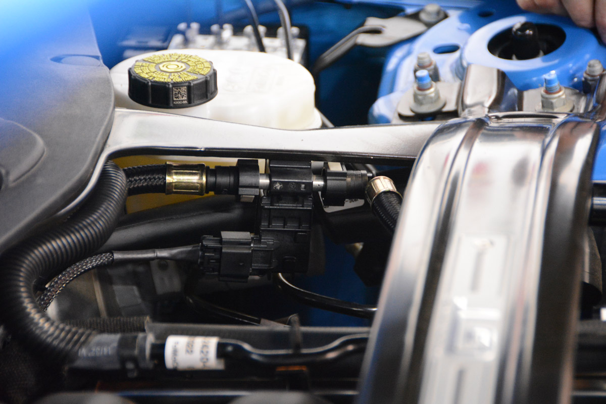 Advanced Fuel Dynamics offers kits that work with port fuel injection as well as direct injection. This Mustang features port injection and direct injection from the factory, and the PROFLEX DX kit has the necessary components to work with both injector systems. The kit includes a Port Commander Module, a Direct Commander Module, fuel content sensor, wiring harness and pre-assembled braided fuel lines with factory-style locking connections.