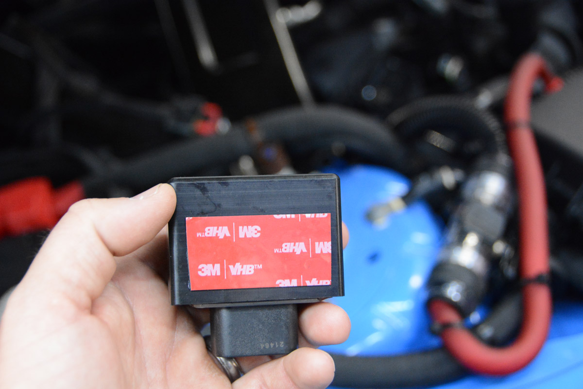 3M double sided tape is used to attach the two modules to the location of your choosing. In the case of this S550 Mustang, the areas near the battery box made the most sense. You want the modules to be mounted in a dry place, away from extreme heat.
