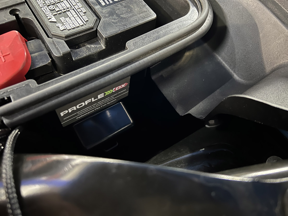Advanced Fuel Dynamics has developed kits for many makes and models, and our focus today is installing a PROFLEX DX Adaptive Flex Fuel System on a 2022 Ford Mustang GT Premium. This car already makes great horsepower in an efficient manner, but the added octane and lower temperatures of E85 fuel will allow the factory ECU to add ignition timing and make more power. This affect is much greater on boosted applications, as the extra octane and cooler temperatures allow for more boost and timing.
