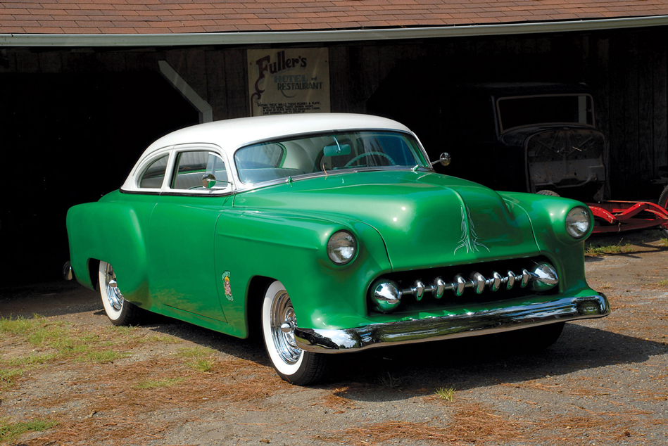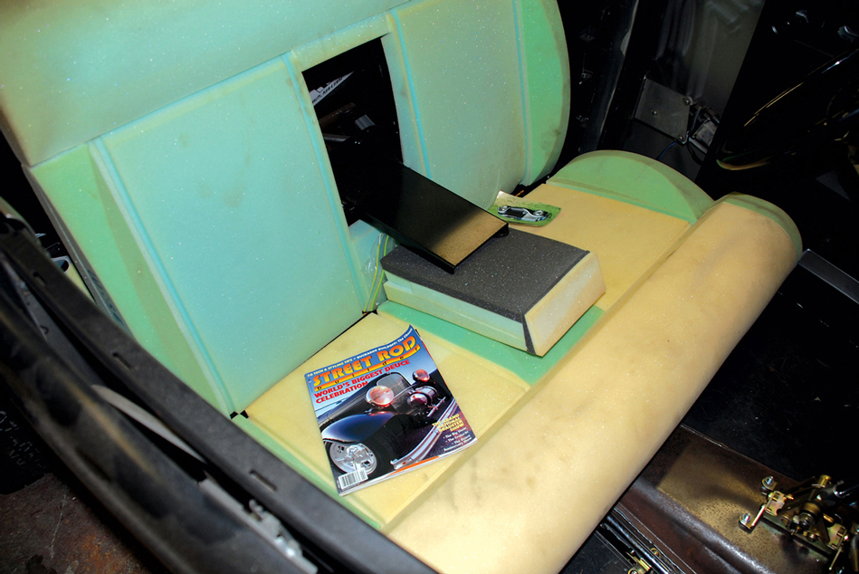 A Lokar shifter protrudes through the Fuller-built console while an Auburn-style dash insert continues the timeless hot rod theme.