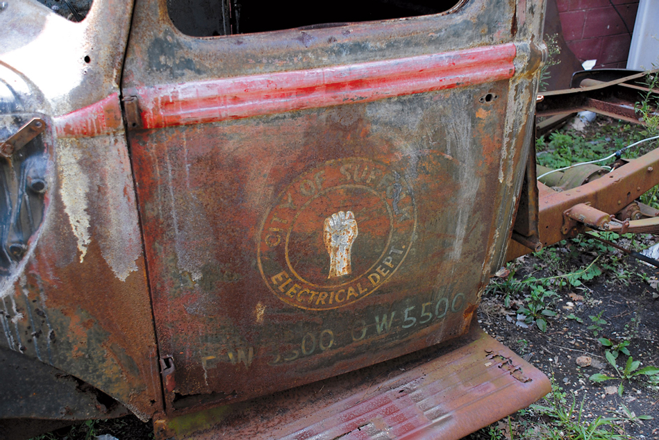 The coolest things on the old truck have to be the doors. This truck saw service with the local power company, and the “City of Suffolk Electrical Dept.” marking can still be seen under that perfect patina. That fist is holding a bolt of electricity.
