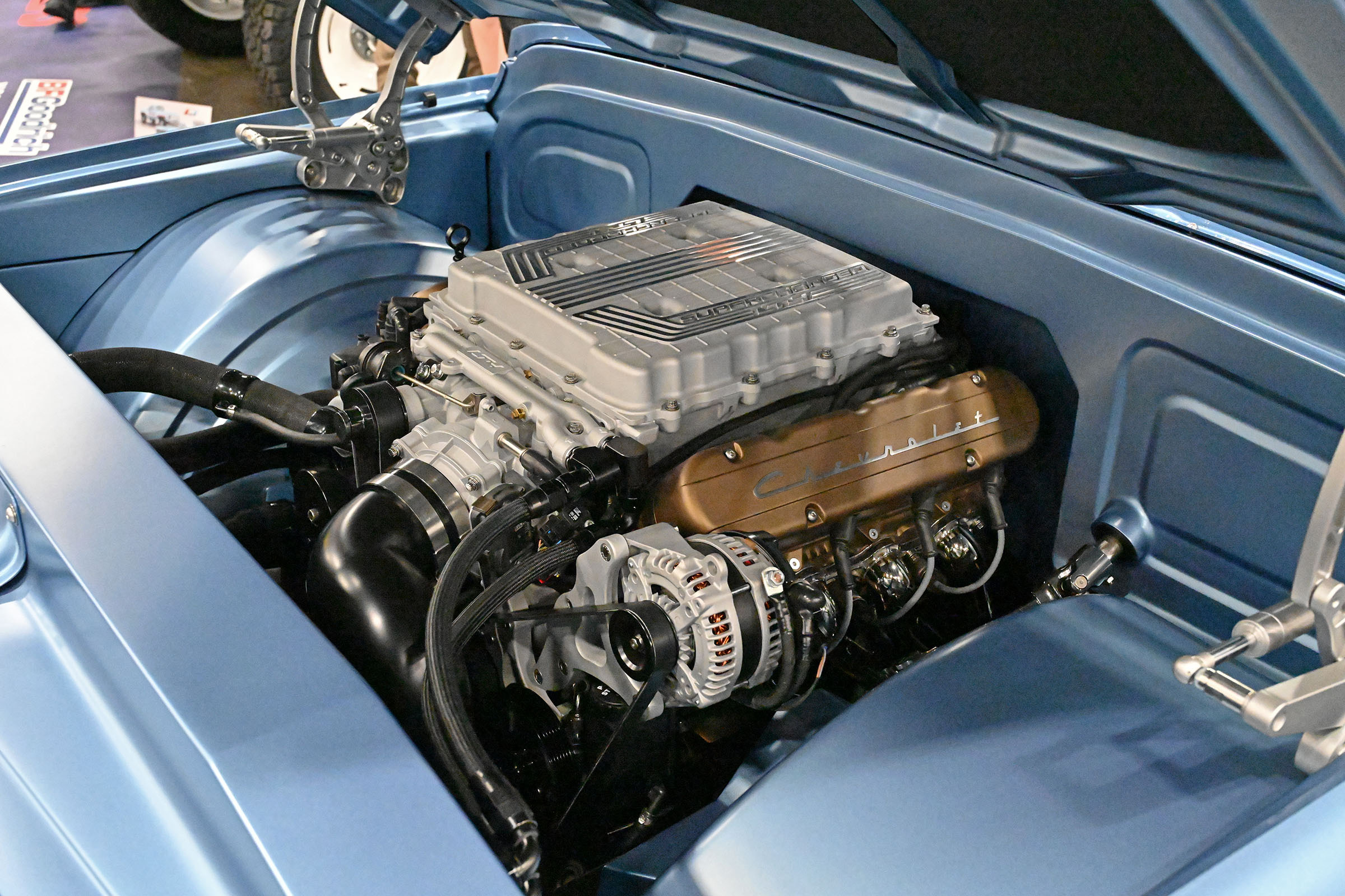 Dustyn Dell’s 1969 Chevrolet C10 is a full-scale work of art, transformed in every detail from chassis to cowl. Beneath its classic lines lies an all-wheel-drive system powered by a 900-hp LT4 engine mated to a 10-speed automatic transmission, blending raw American muscle with modern performance. The build is a showcase of meticulous finishing, with every component painted, powdercoated, or Cerakoted for flawless execution. The front bumper is shaved and tucked, while the hood features a built-in ram air intake, and the engine bay boasts custom bead-rolled panels and a shaved cowl—every surface engineered for both form and function.
