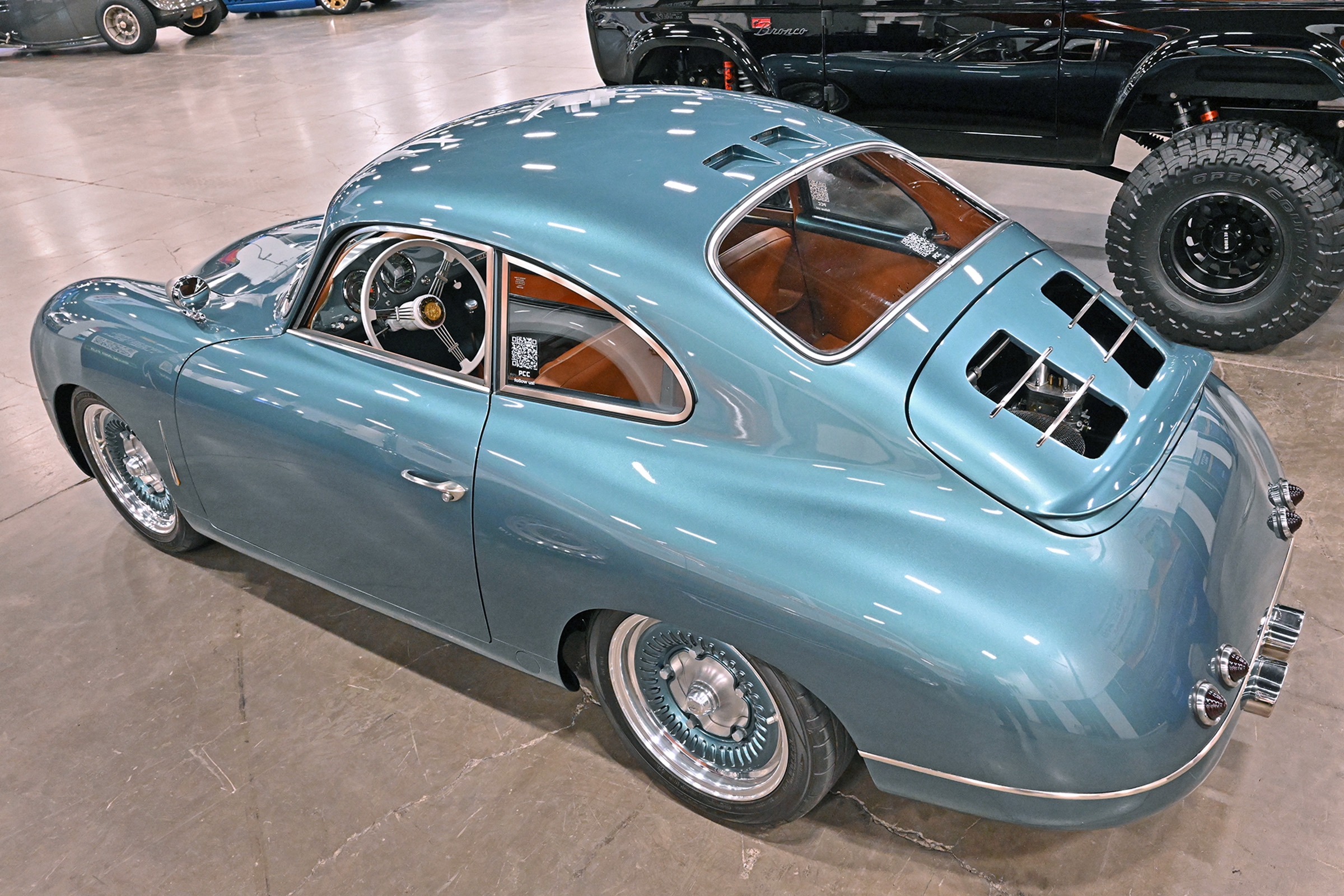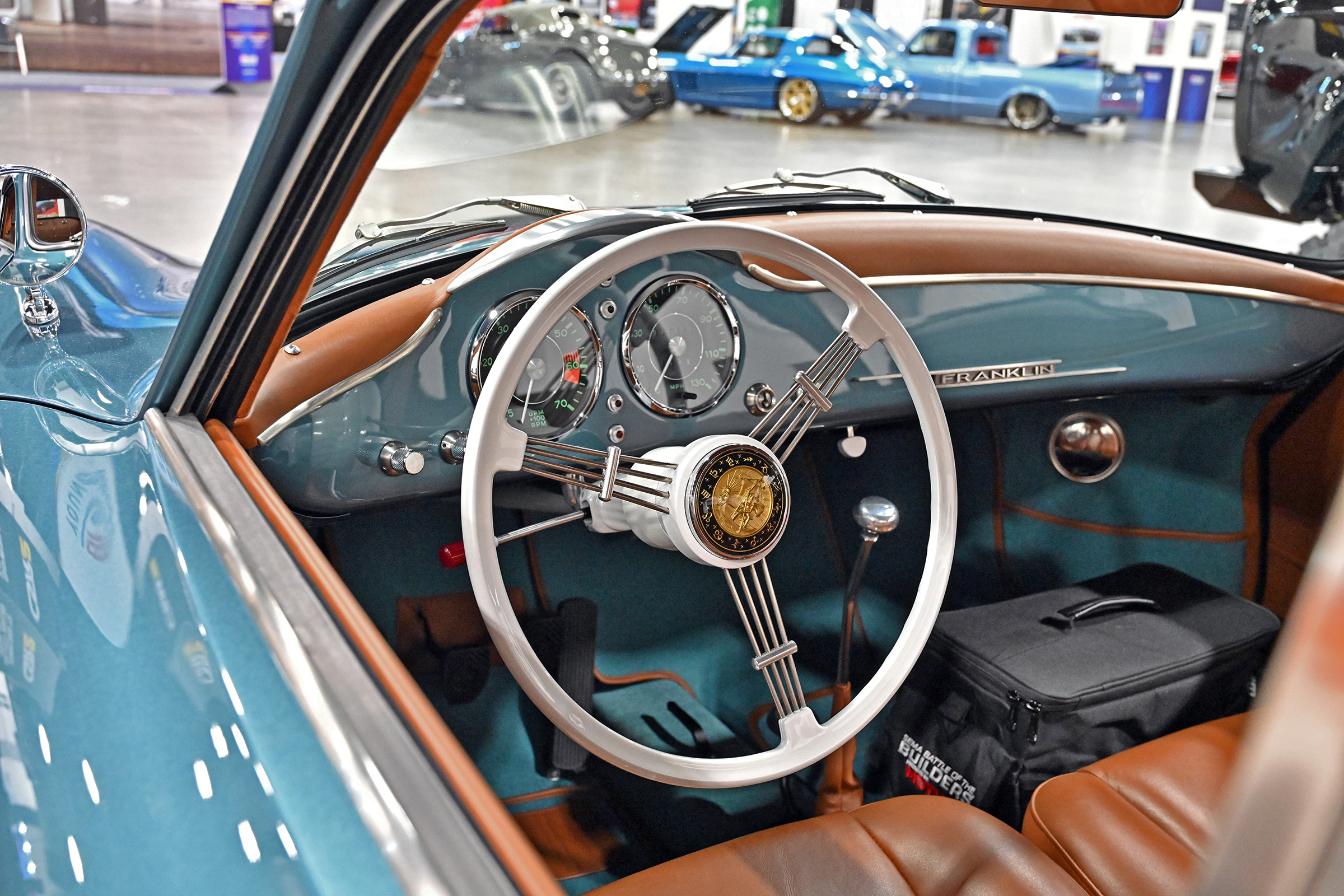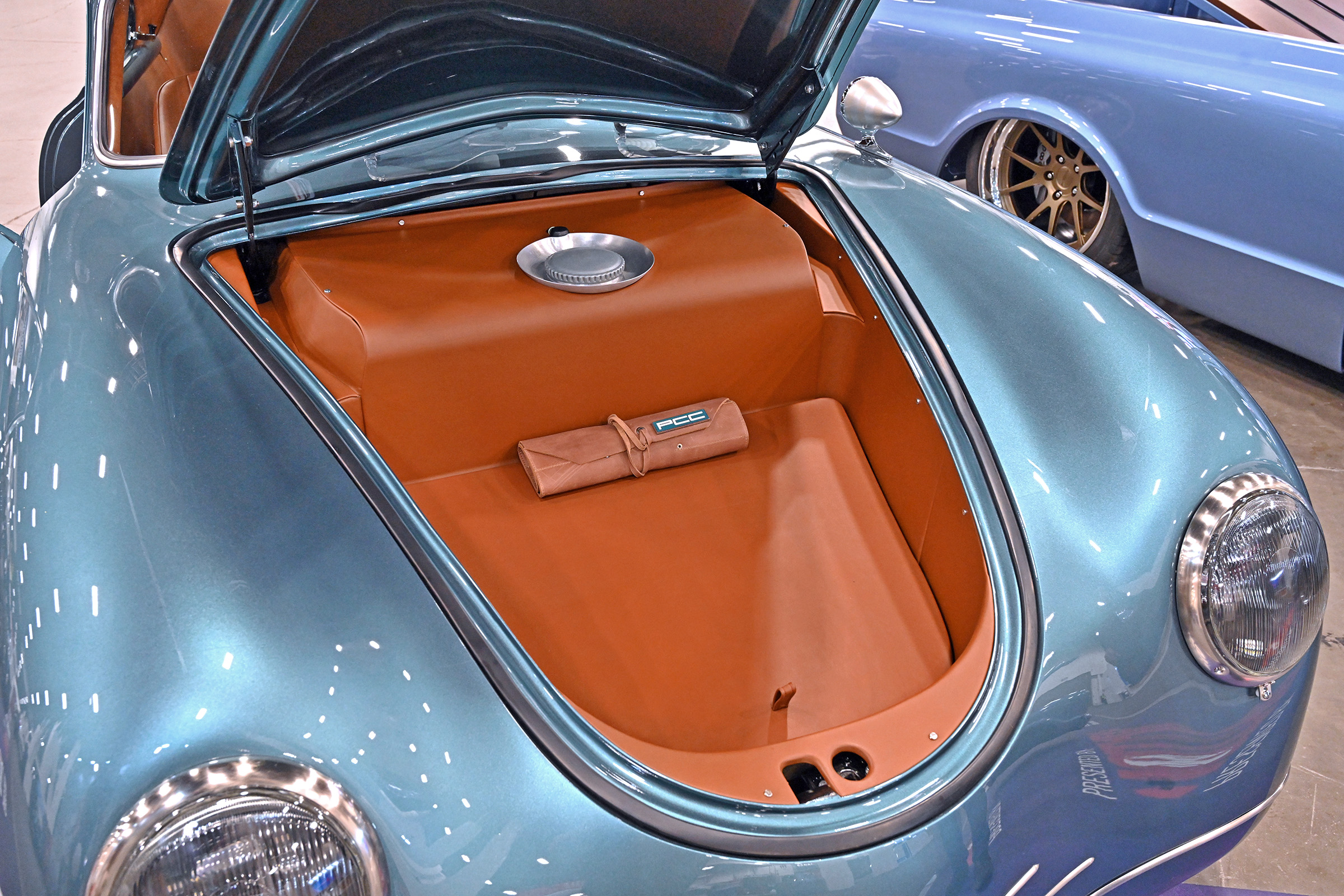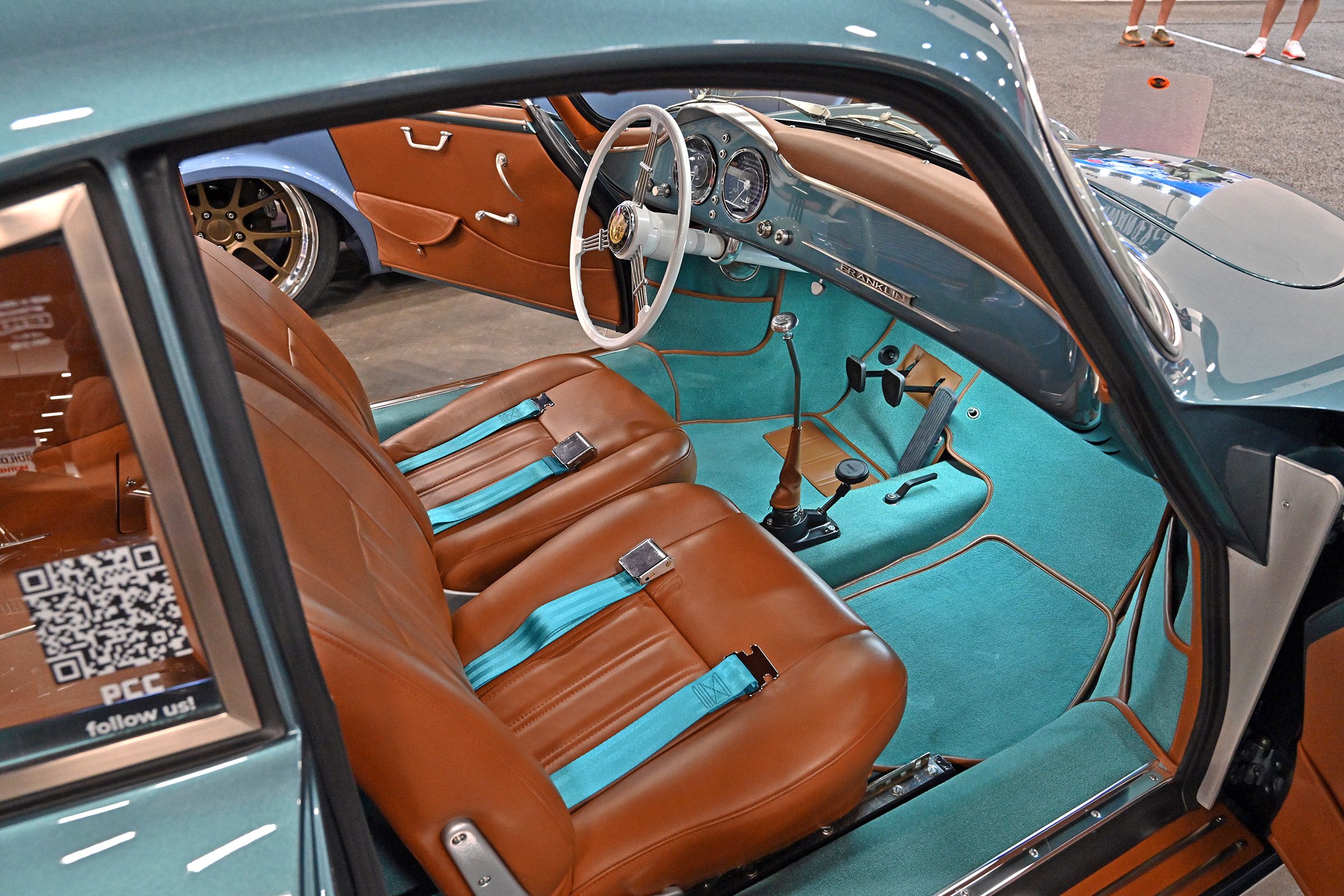 Tim Franklin and his team took a derelict 1960 Porsche 356B and transformed it into a streamlined, luxurious custom masterpiece. Every surface was reimagined, from contoured body panels and rolled rockers to a one-piece aluminum rear deck. Symmetry defines the build, with dual roof brake lights, rear deck trim sets, taillights, and exhausts meticulously balanced for both form and function. The custom wheels were designed in-house, complete with heat-extracting fins inspired by the original 356, while subtle roof slots improve safety and aesthetics.