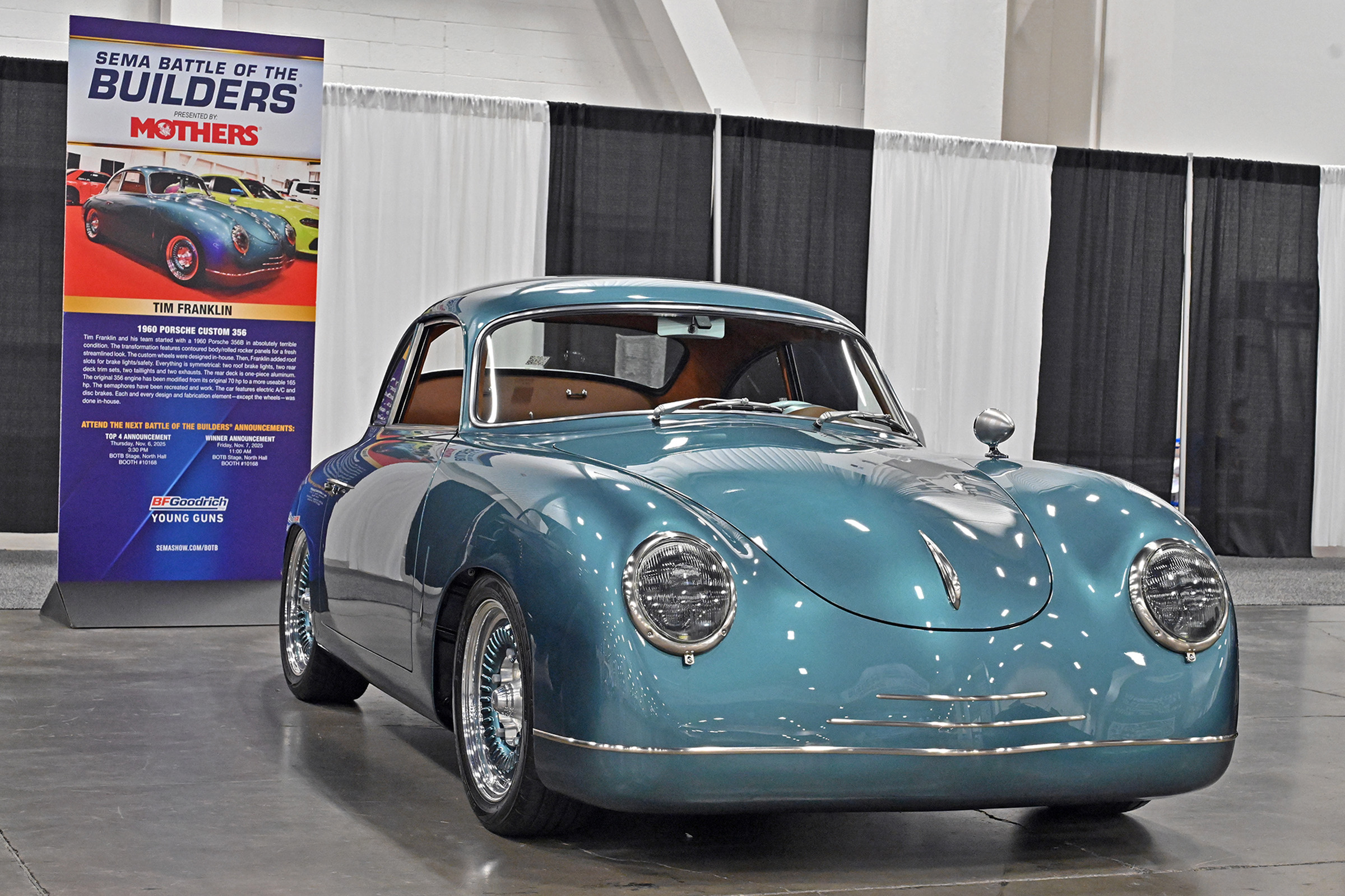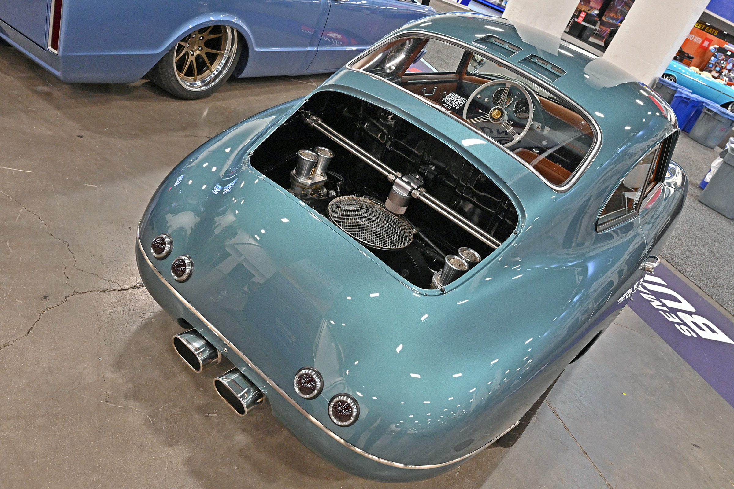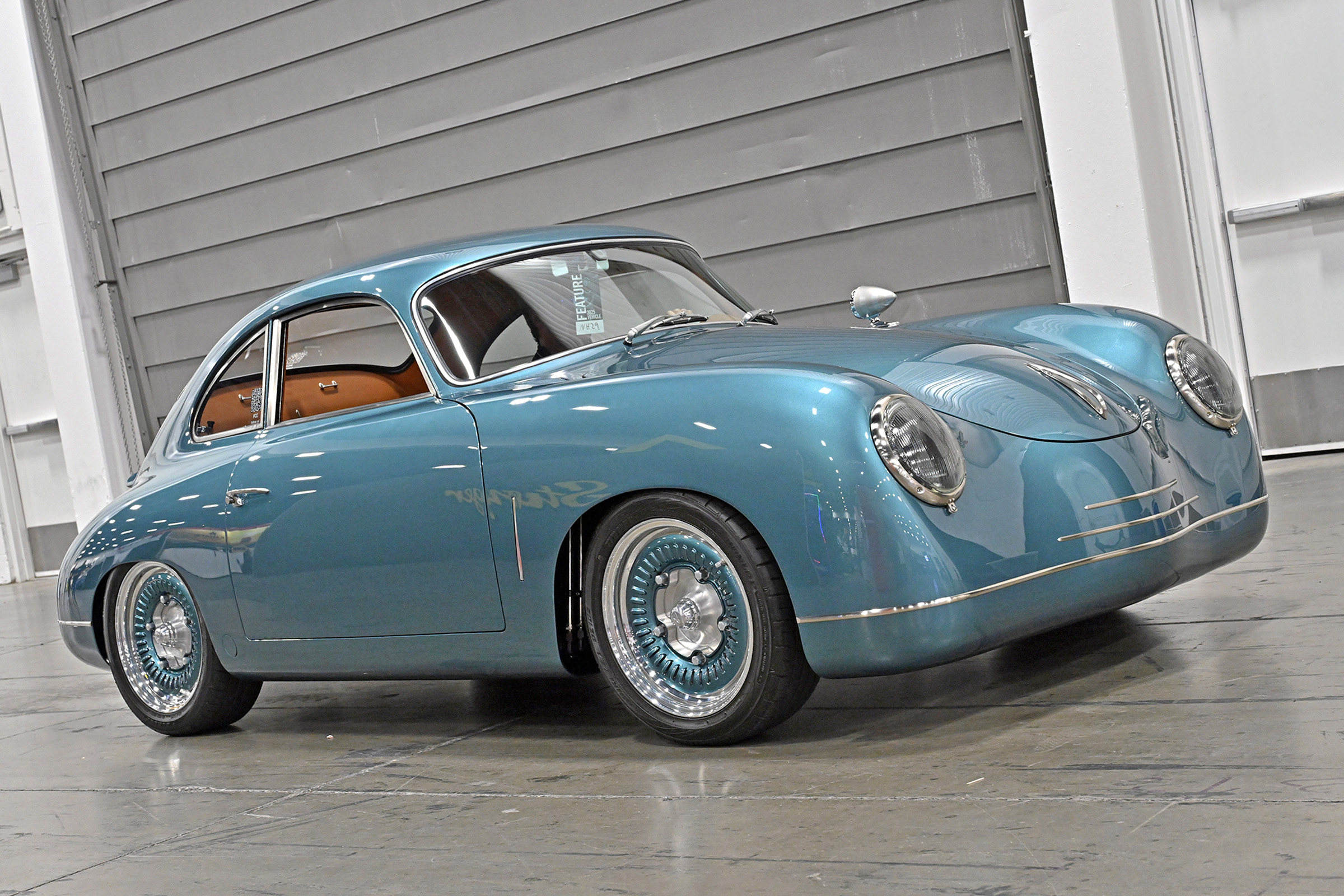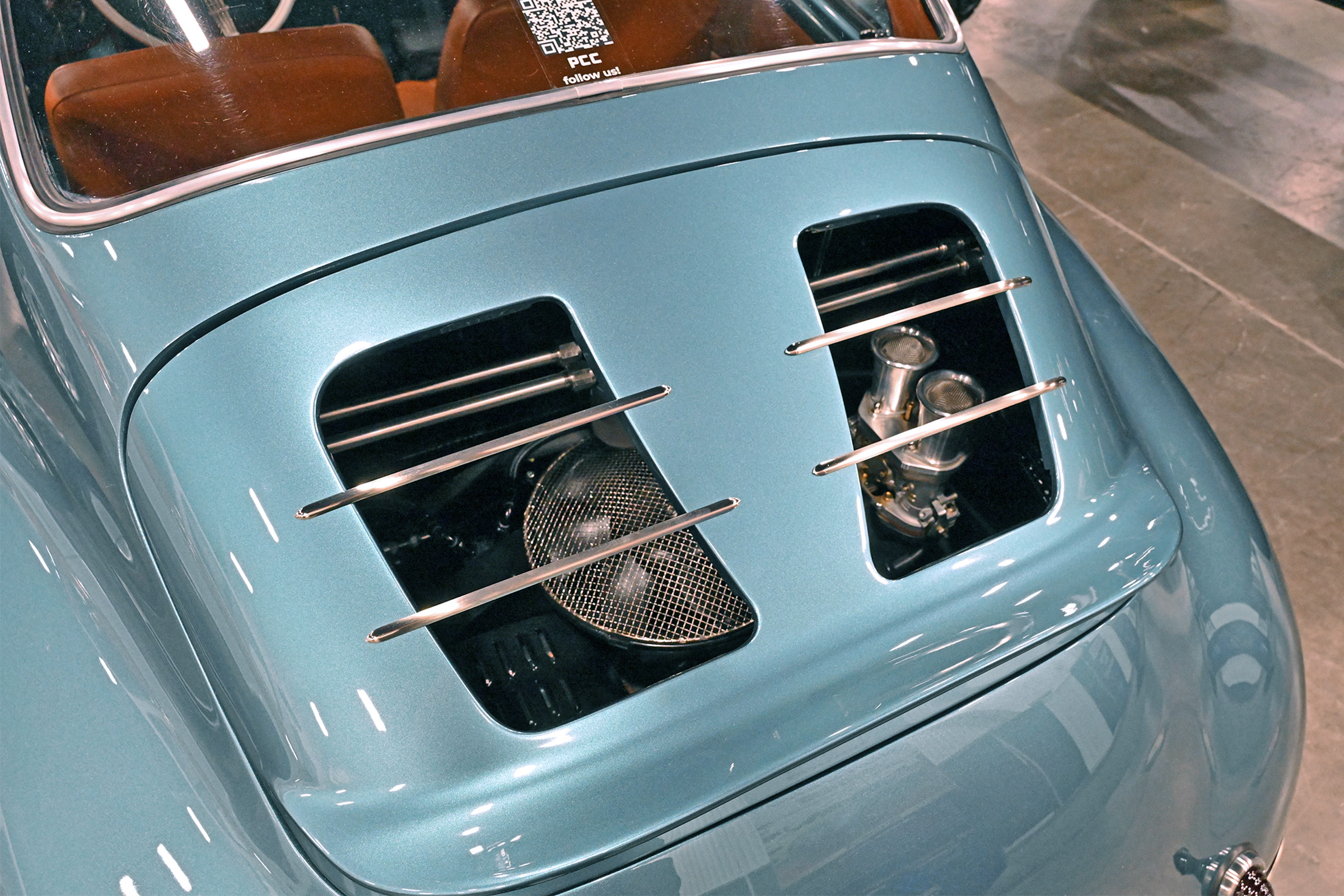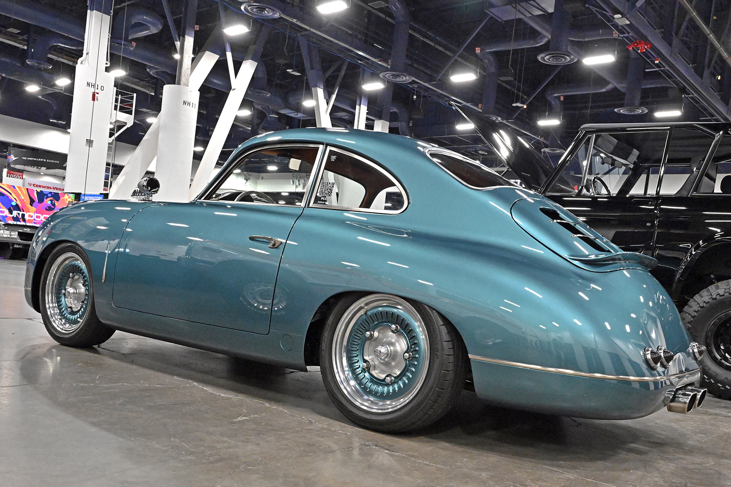 Tim Franklin and his team took a derelict 1960 Porsche 356B and transformed it into a streamlined, luxurious custom masterpiece. Every surface was reimagined, from contoured body panels and rolled rockers to a one-piece aluminum rear deck. Symmetry defines the build, with dual roof brake lights, rear deck trim sets, taillights, and exhausts meticulously balanced for both form and function. The custom wheels were designed in-house, complete with heat-extracting fins inspired by the original 356, while subtle roof slots improve safety and aesthetics.