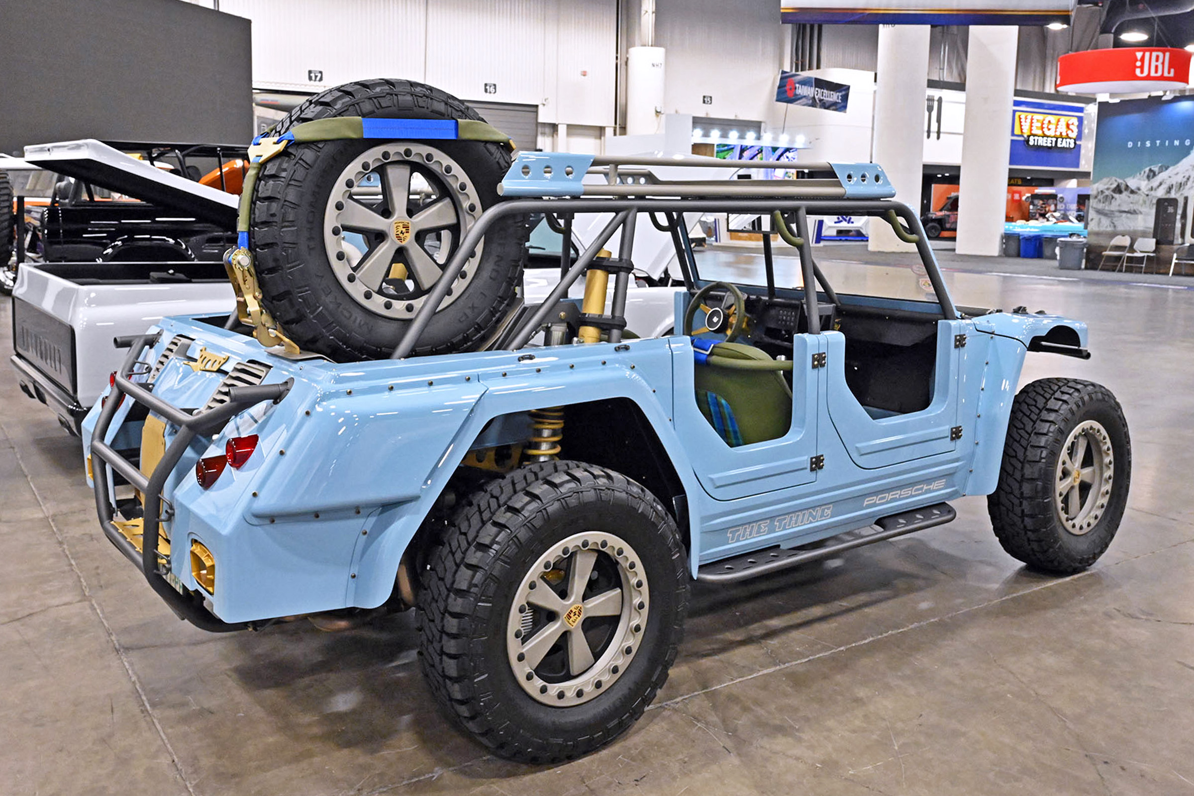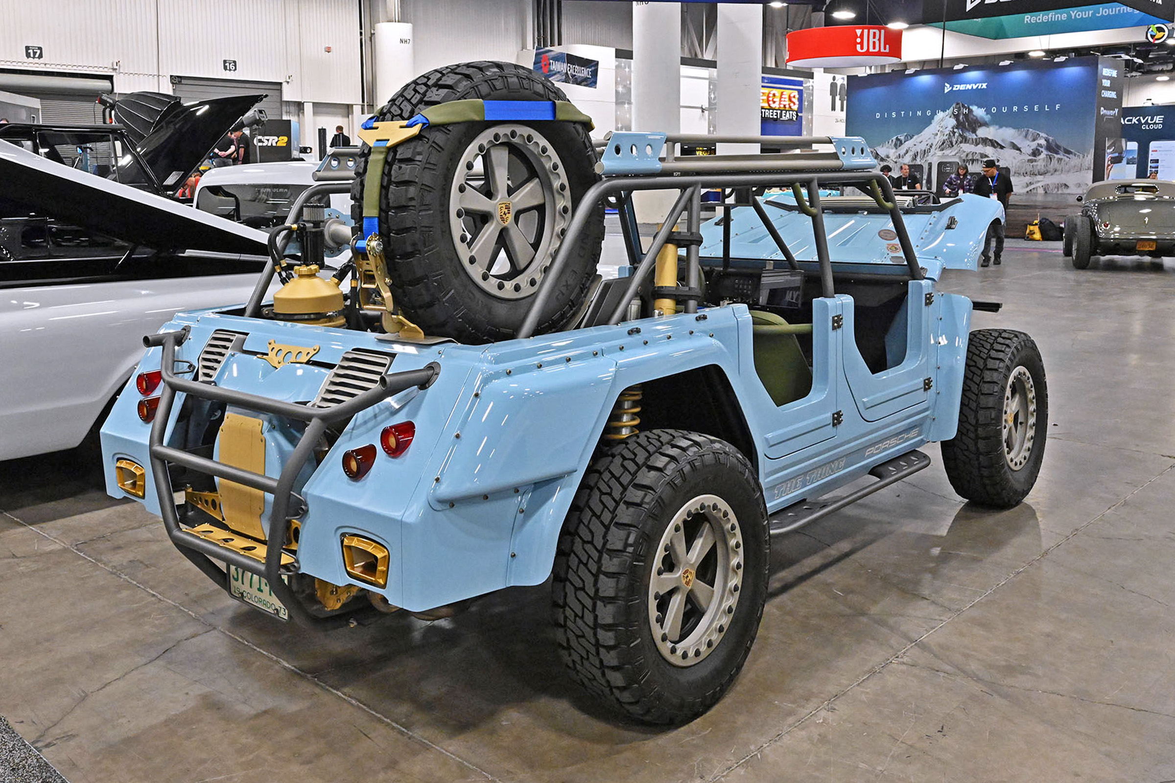 Power comes from a 3.2L air-cooled Porsche 930 flat-six, converted to fuel injection and managed by a MoTec ECU, mated to a Porsche 996 transaxle with torque tube and front differential from a 997, producing over 300 horsepower in a 2,600-pound package. Porsche DNA flows throughout, from plaid seats to a 911 RS steering wheel, with Curtis Speed Equipment wheels anchoring the stance. Equal parts bizarre, brilliant, and breathtaking, this VW Thing proves that with vision and craftsmanship, even the oddball of the VW lineup can become a world-class showstopper.