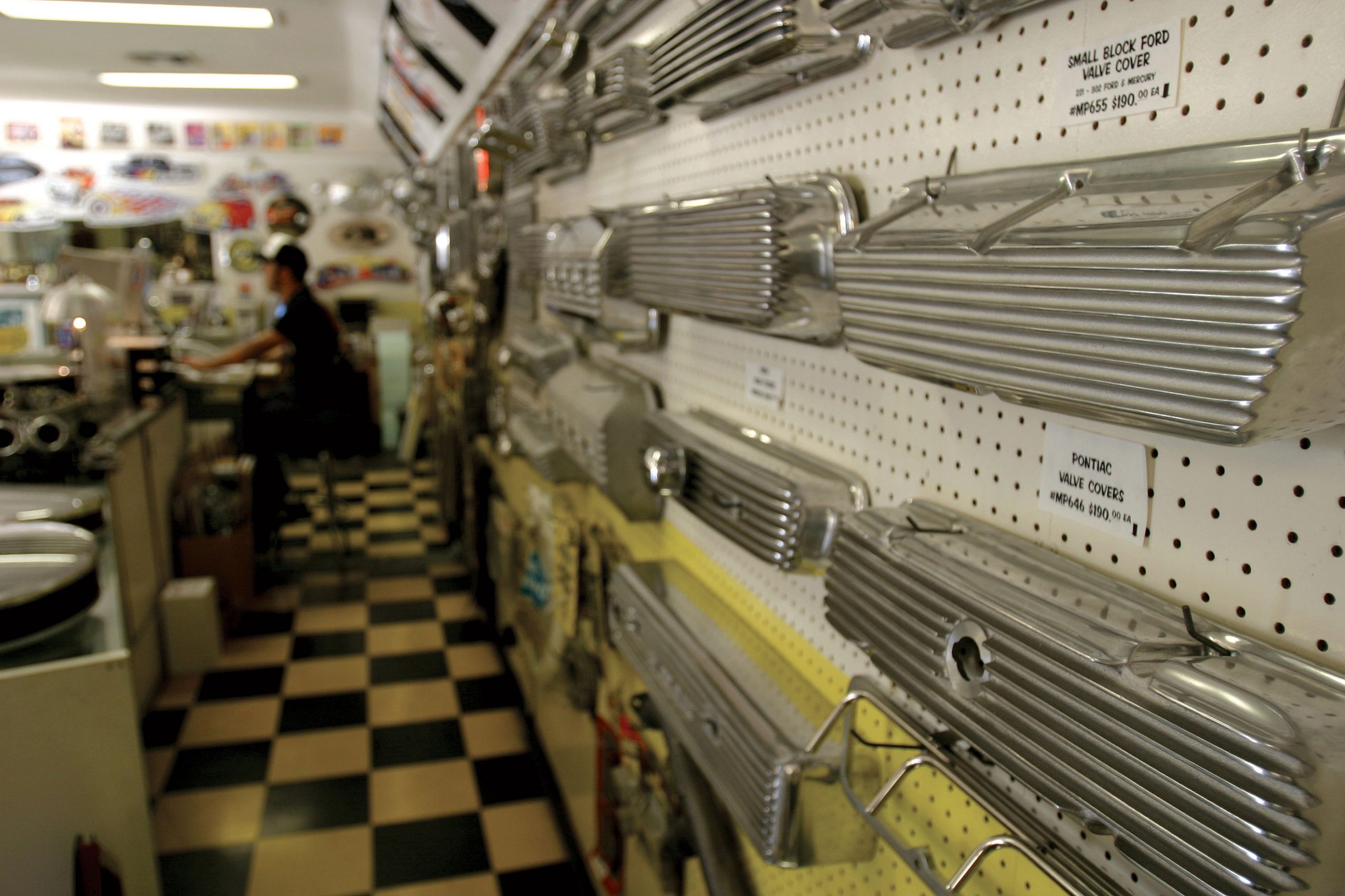 The showroom is what every auto parts store dreams of being: diced in checkerboard black and yellow tile with a heap of pegboard. Up front, the sales counter is the hub of business, fueled by eager customers that keep the phone ringing off the hook. Bob, Sam and Robin deal one-on-one with customers, keeping all 50 states Moon-equipped.