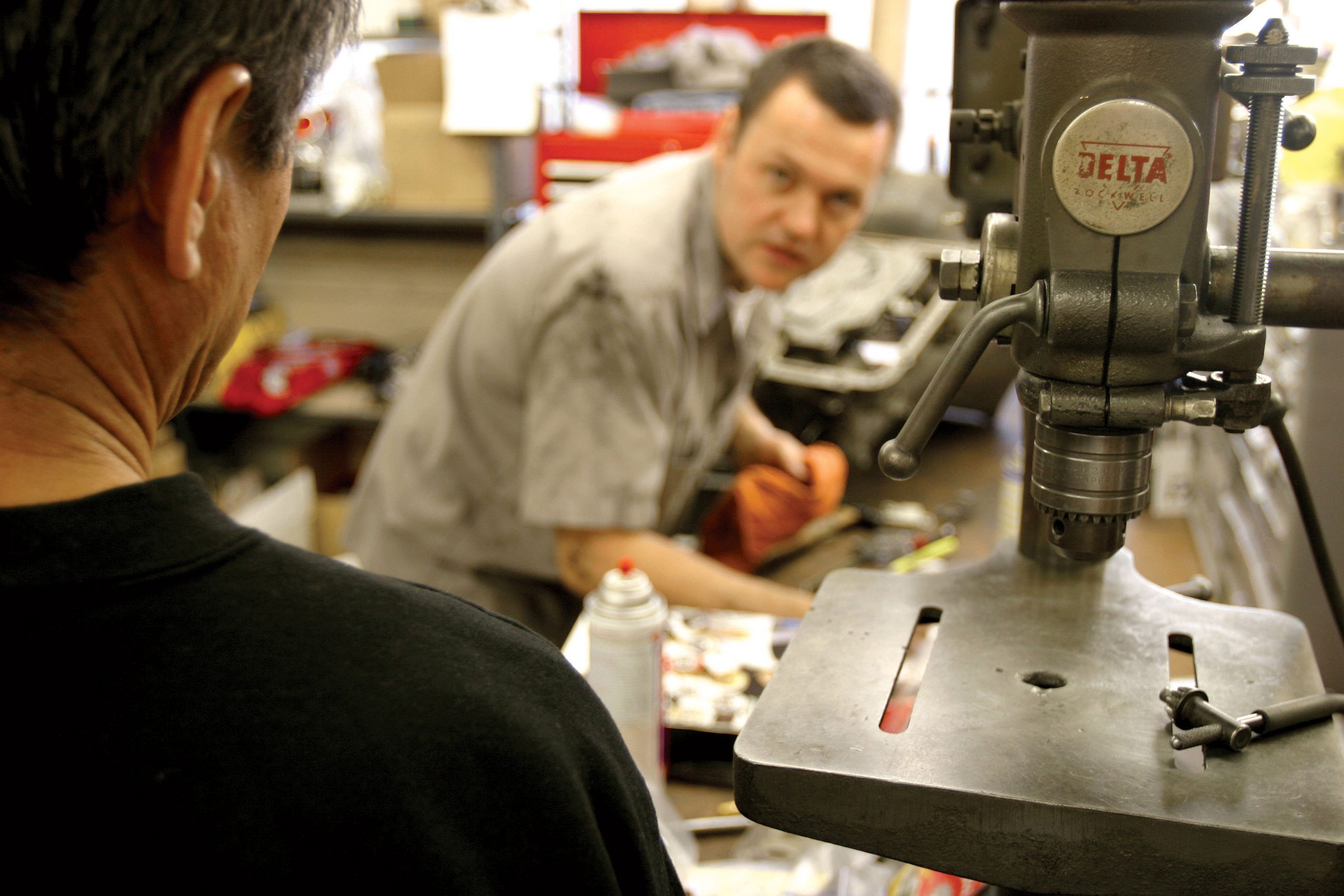 Back in the shop, the staff works hard to fab the hop-up parts. You won’t see a CNC machine here, only lathes, milling machines and drill presses. By the window, you’ll find cam-grinding legend Bill Jenks, who usually works on custom orders or builds one of Mooneyes famous gas tanks. At any stage of the process, Moon tanks are a thing of beauty; fabricated from the finest aluminum, each tank is finished in the company’s signature sunray surface. Traditionally mounted in front of the grill, the polished tank can easily clamp onto a deuce spreader bar in minutes. Over in the corner, Manuel Flores pumps out Moon discs spun from circle cut aluminum, each a different thickness. Like a fine ceramicist on a potter’s wheel, it’s mesmerizing to watch as he shapes the spinning aerodynamic covers.