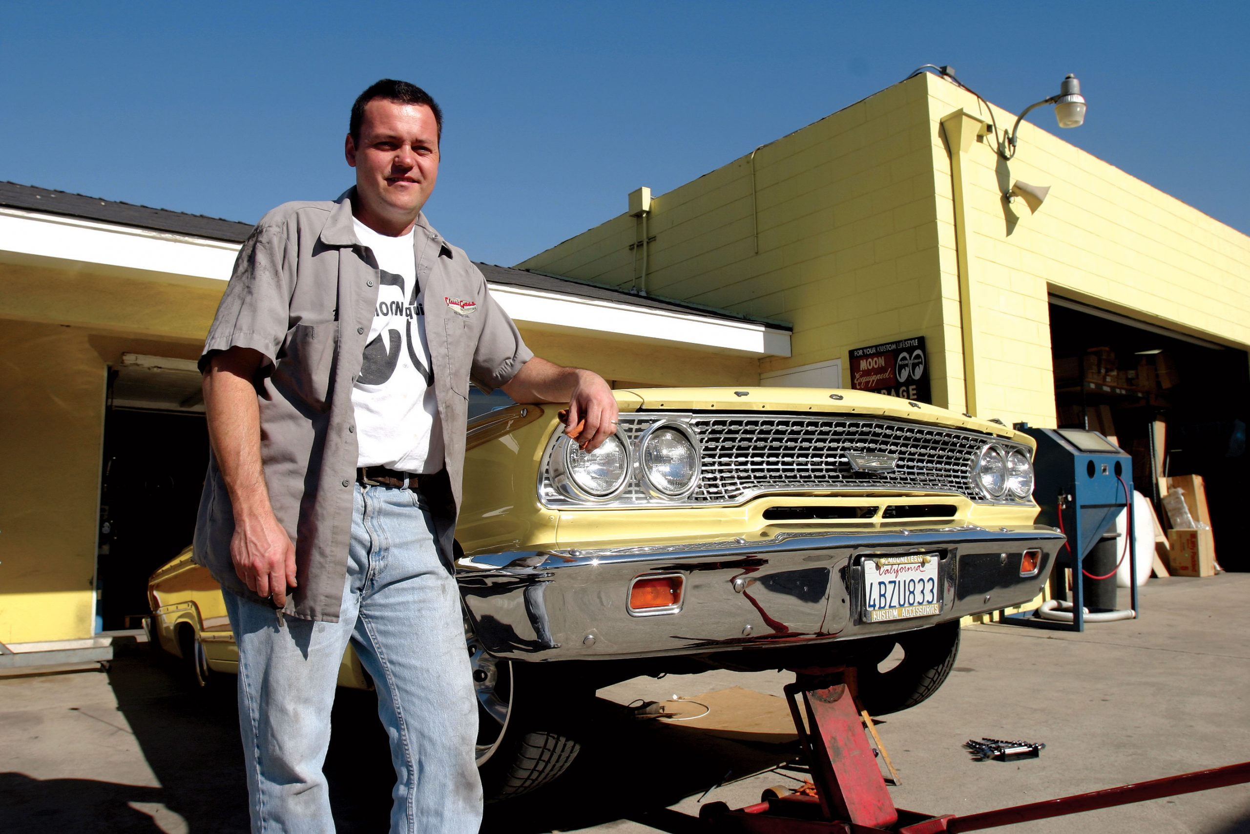Out in the yard, hot rod guru Ken Farrell wrenches on a ride, popping the new push-button transmission controls in the company station wagon. With the hand-painted wood grain ’63 Country Squire on a jack, he installs the Smart Shift to the rolling laboratory. Recognized for his development of Moon’s new-fangled fuel injection units, Farrell fuses new computer technology with classic hot rod ingenuity. Spinning wrenches on the concrete pad in the warm California sun, he is totally oblivious to the fact that he is occupying the same turf as the notorious Rat Fink reunion parties. These one-day events that host pinstripers, hot rod artists and music reunite rodding legends with the younger crowd. With over 500 cars attending last year’s Christmas party, the mid-December event was moved up the street to a bigger parking lot in Whittier.
