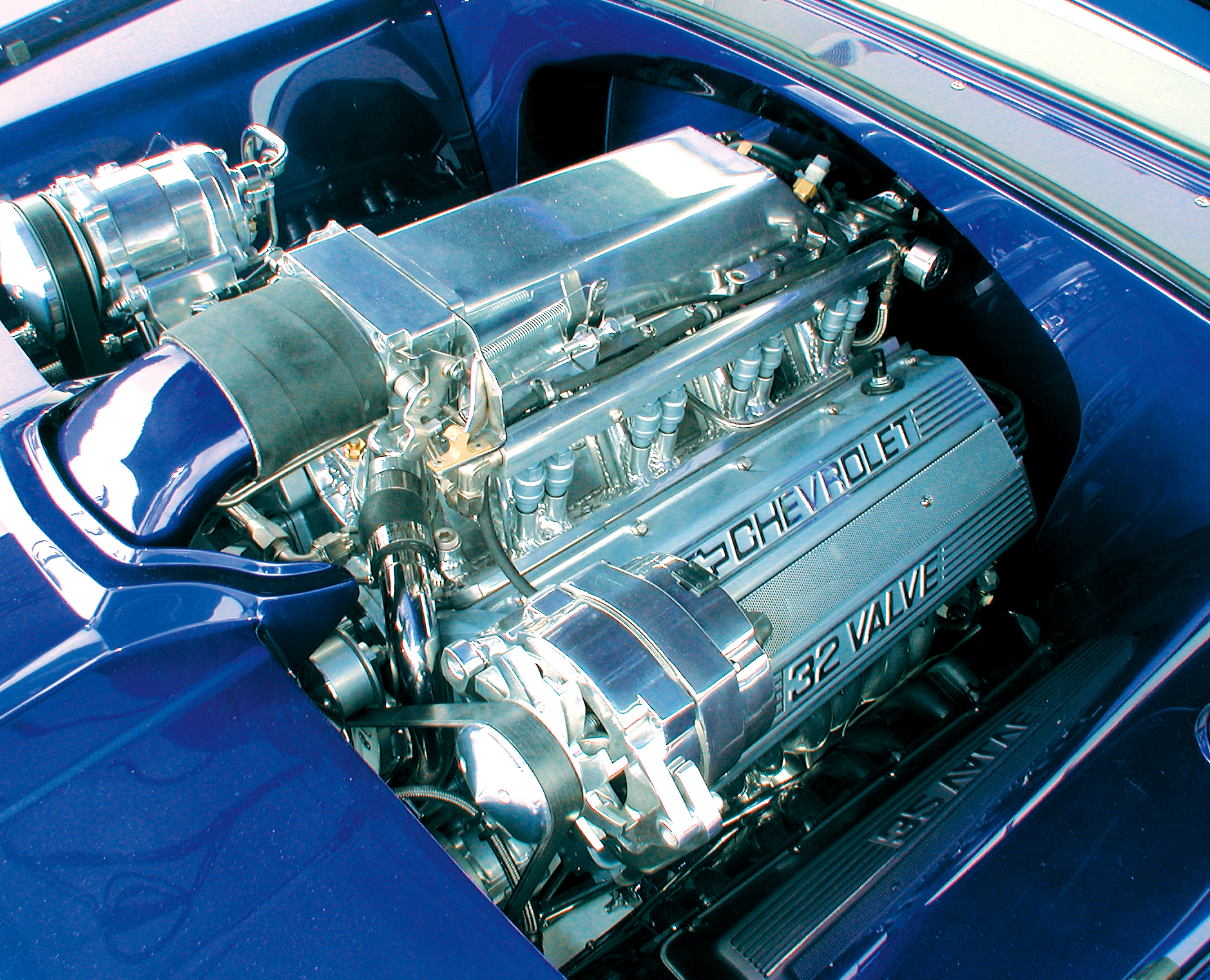 When we first saw NewMad in primer, the car was so straight and its body panels so perfect that it looked as if the factory had stamped all the panels out of expensive body-panel dies. The finished product is a credit to the craftsmen who worked on the body to get it so flawless. A great deal of block sanding and preparation went into the body before it was finally wheeled into the spray booth for the application of House of Kolor Majik Blue Pearl with Kandy Cobalt urethane. The frame was painted the same color, with the parts either natural aluminum or painted bright aluminum color.