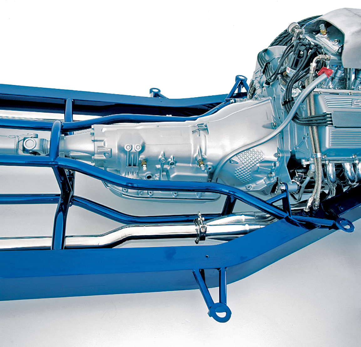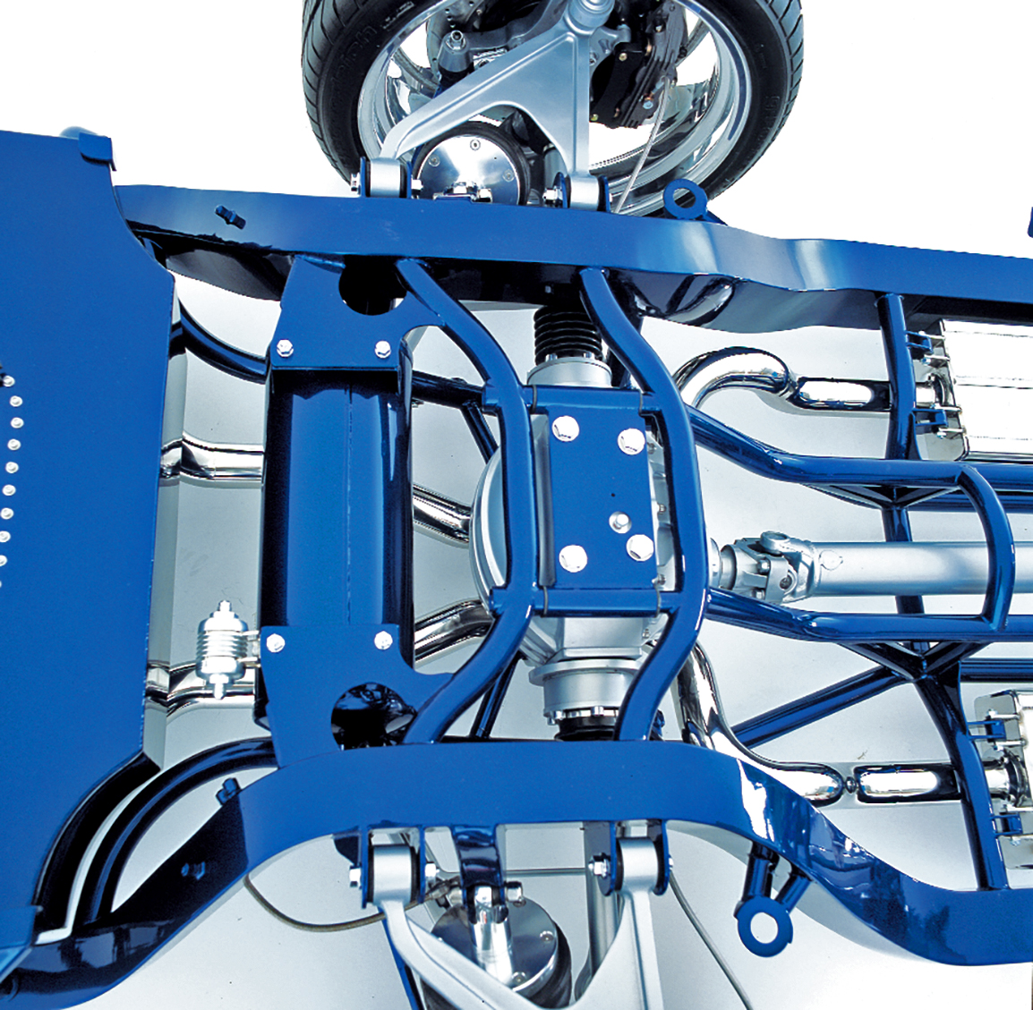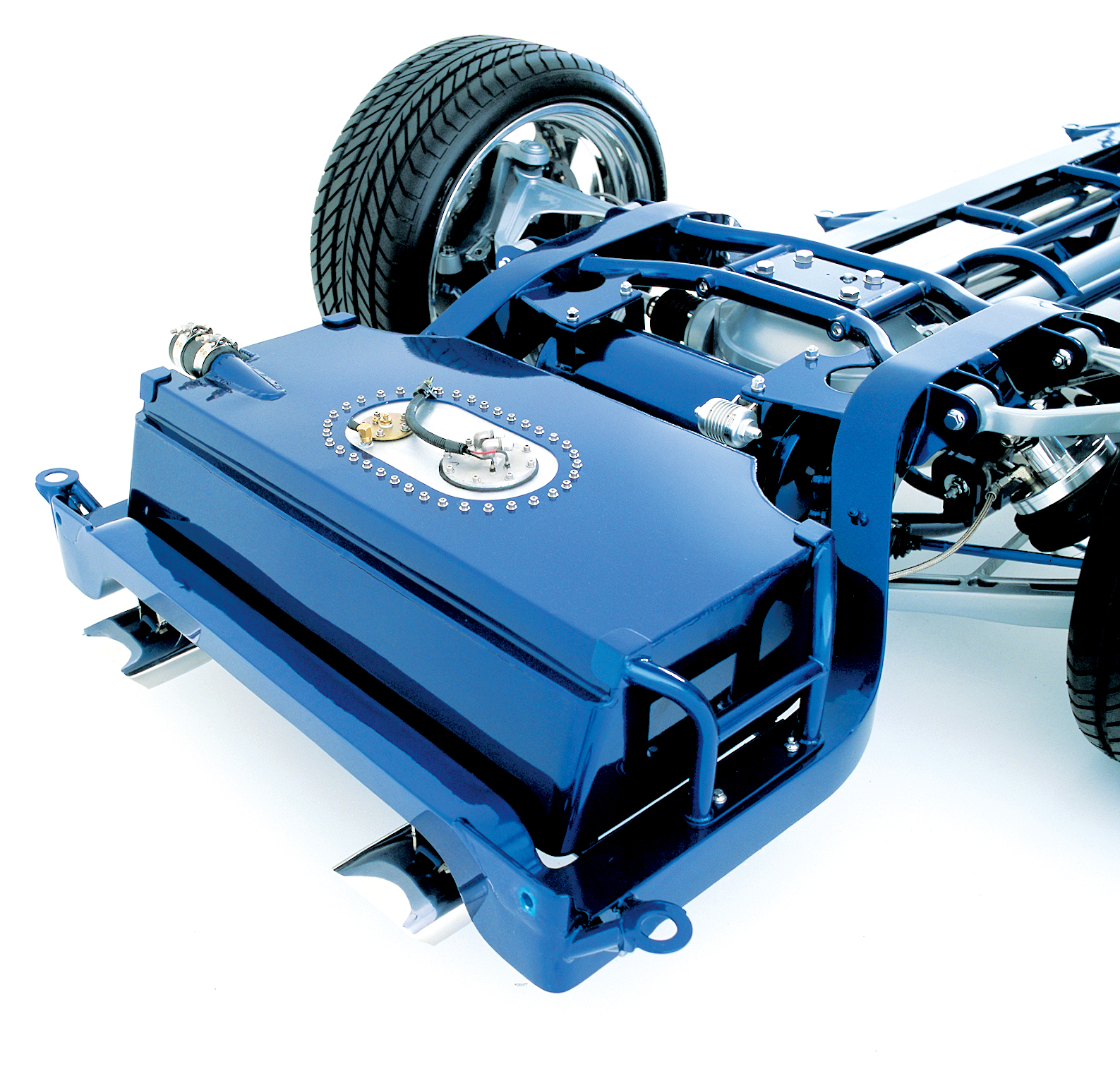 When we first saw NewMad in primer, the car was so straight and its body panels so perfect that it looked as if the factory had stamped all the panels out of expensive body-panel dies. The finished product is a credit to the craftsmen who worked on the body to get it so flawless. A great deal of block sanding and preparation went into the body before it was finally wheeled into the spray booth for the application of House of Kolor Majik Blue Pearl with Kandy Cobalt urethane. The frame was painted the same color, with the parts either natural aluminum or painted bright aluminum color.