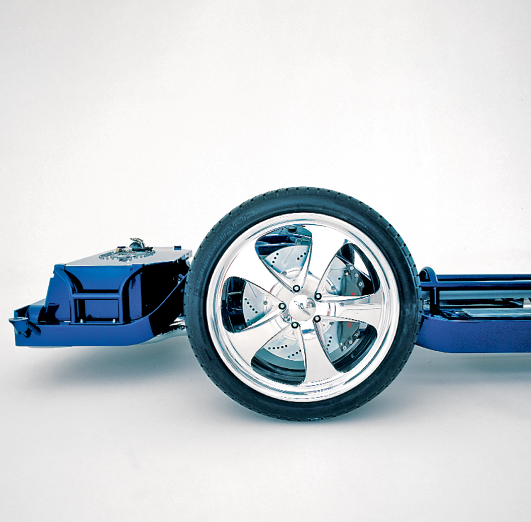 One of the highlights of NewMad is the highly modified Valley Head Service “Thunderhead”-equipped, 496ci aluminum Donovan big-block engine. The 32-valve heads deliver an awesome 540 hp and a radical appearance that is unequalled when equipped with the hand-built EFI aluminum intake manifold and air plenum. The unusually beautiful engine is hooked to a Hughes Performance GM 4L80E automatic overdrive transmission with a 2,500-rpm stall speed torque converter. An HGM Compushift onboard programmable controller ensures that the shifts are crisp and on time. A Ron Davis custom aluminum cross-flow radiator handles cooling duties with dual 16-inch Spal cooling fans. An 18-gallon custom fuel tank delivers the juice with a Holley in-tank pump. The stainless steel fuel lines are run inside the frame for a cleaner look, and the filler neck is hidden behind one of those slick, one-off rear taillight assemblies. Fumes from the 16 exhaust ports flow from custom headers, 2-1/2-inch stainless steel tubing and a pair of polished stainless steel mufflers. To keep NewMad cruising smoothly, it rolls on 20×8.5-inch Budnik front wheels running BFGoodrich G-Force 255/35ZR20 tires and 20×10-inch Budnik rear wheels running BFGoodrich G-Force 275/35ZR20 tires.