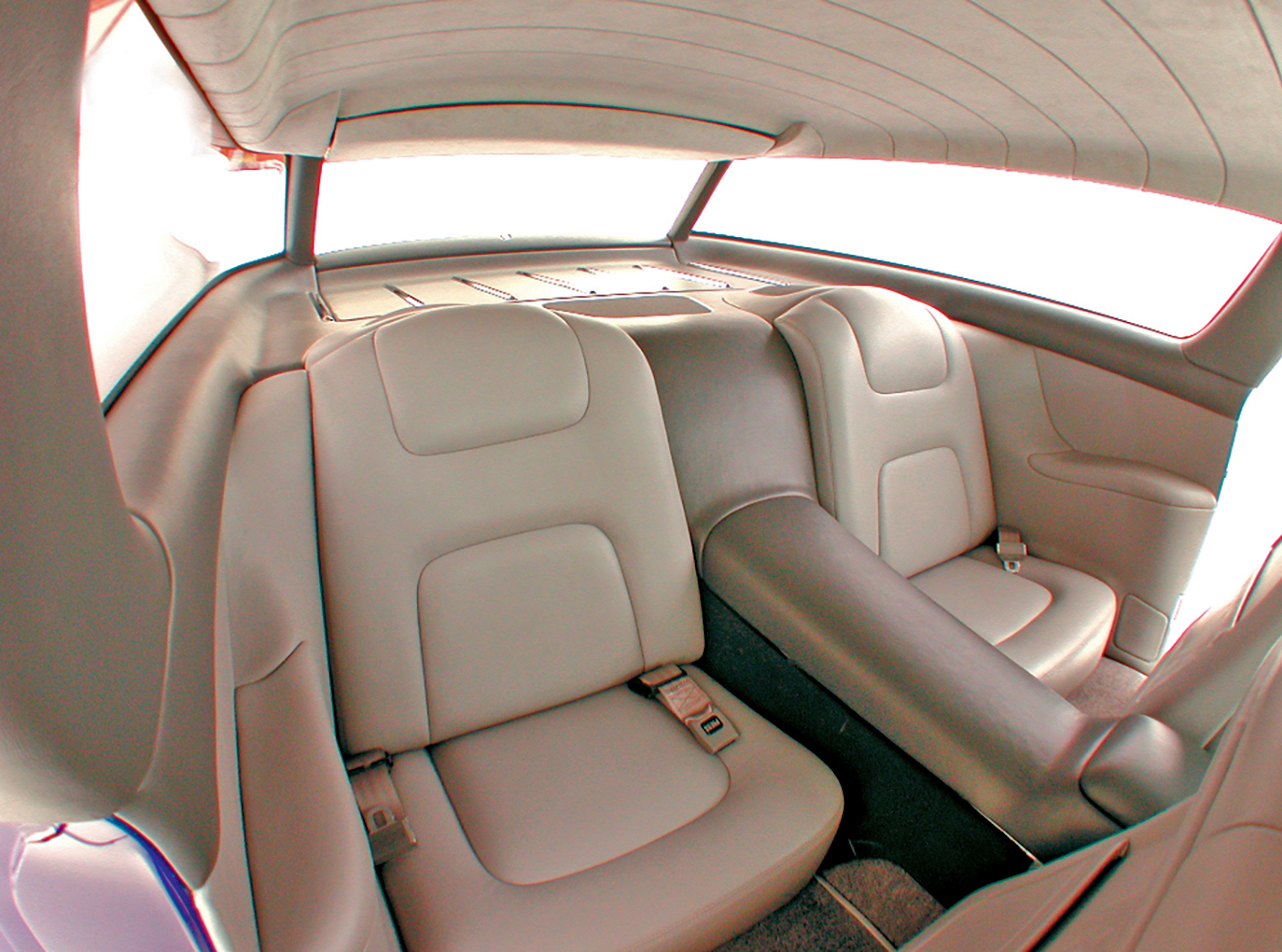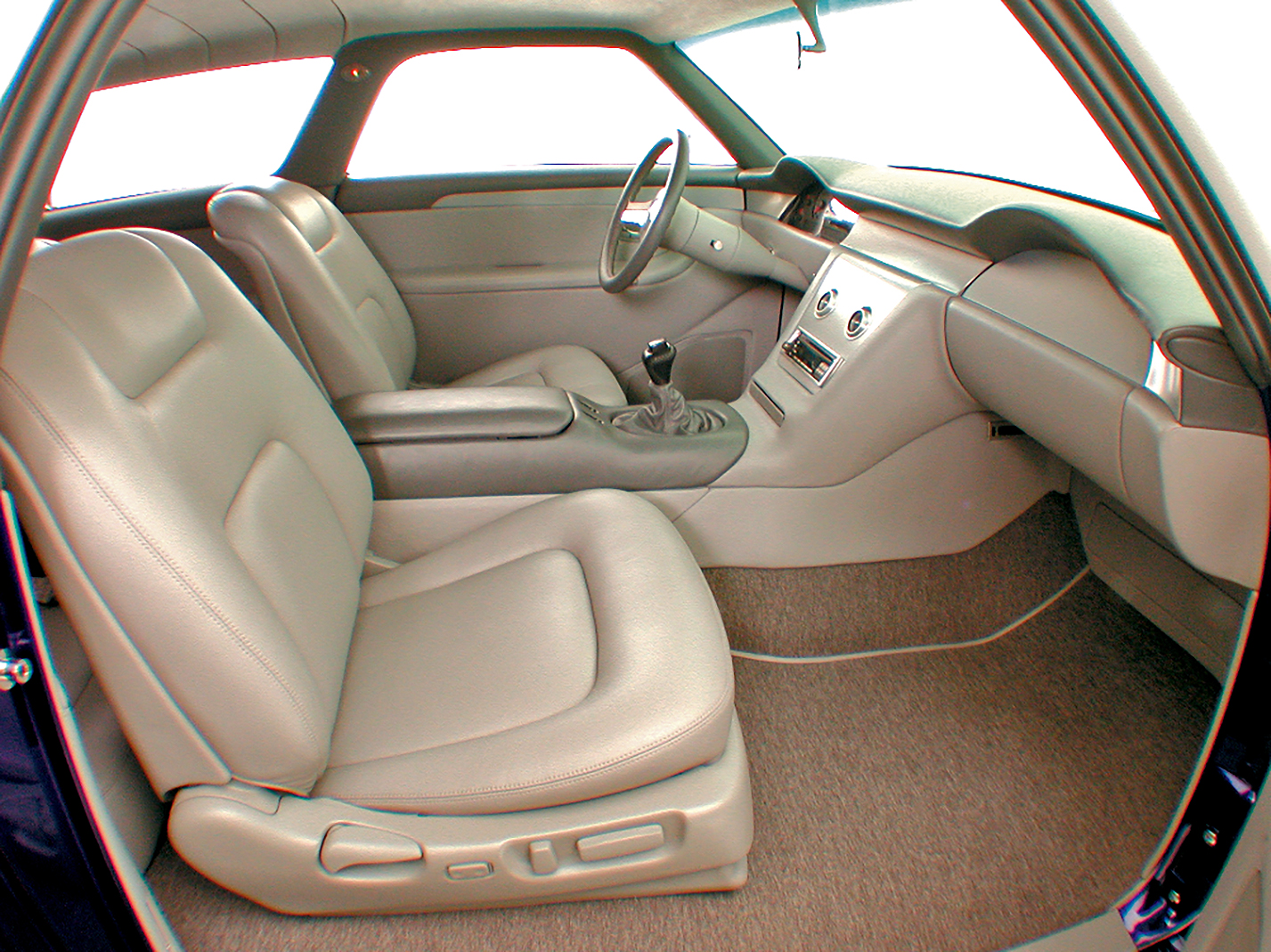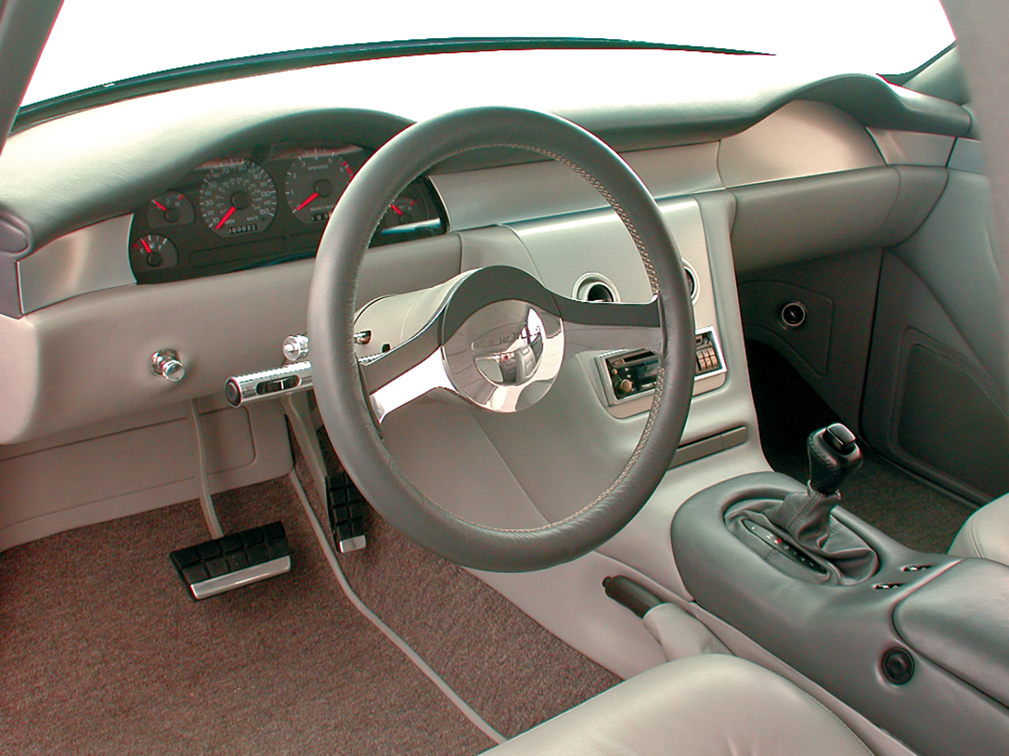 The interior also was built from an artist’s illustration that featured a pair of elongated dash pods similar to, but larger than, the original designs in the Chevy Nomad. The pods flow off the dash on the inside to form the forward base of the console. It was determined that a ’99 Ford Cobra instrument cluster with a 150-mph speedometer would be perfect for the car. On the opposite side, a glovebox door mimics the shape of the instrument cluster. The original seats were replaced with modified Lexus SC400 10-way power seats with hidden aircraft-style seat belts. The rear seat was hand-fabricated to flow into the rear stowage section. To blend the outside of the car and the interior into one cohesive package, custom-dyed two-tone gray leather was used throughout, with the exception of the headliner, which was done in gray Ultra Suede.