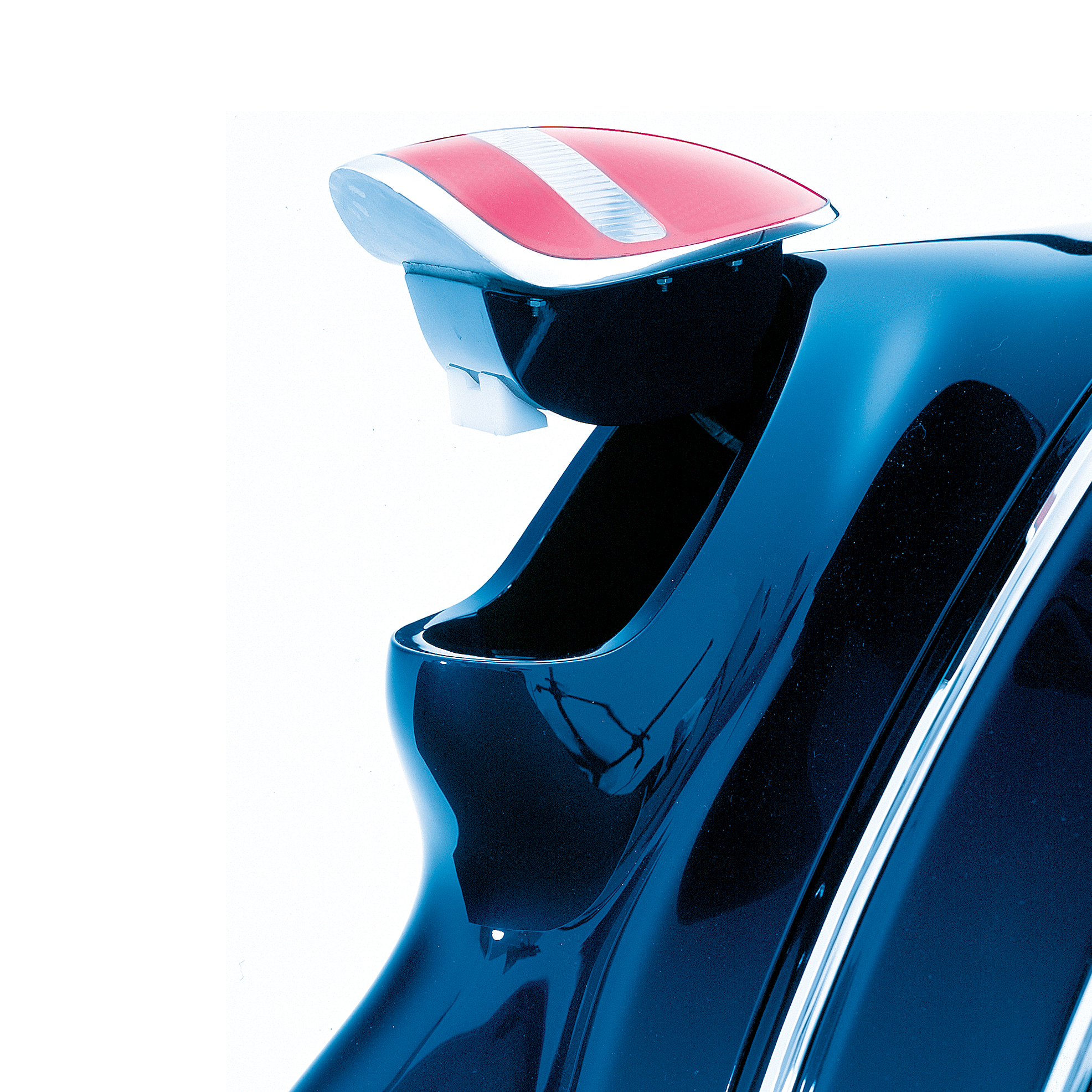 The rear quarter panels also received many subtle changes, starting with re-contoured wheel openings. The taillights were laid forward to match the angle of the pillar posts, and they were completely hand-fabricated to retain the basic design features of the originals. Both light assemblies are hinged, one for the gas filler and the other for a battery switch. The lower portion of the fender was also recessed to accommodate the new body trim strip. The rear fender panels and center body valance also were highly modified to incorporate the new hand-fabricated, flush-fit rear bumper. The bumper features openings for the license plate and exhaust tips.