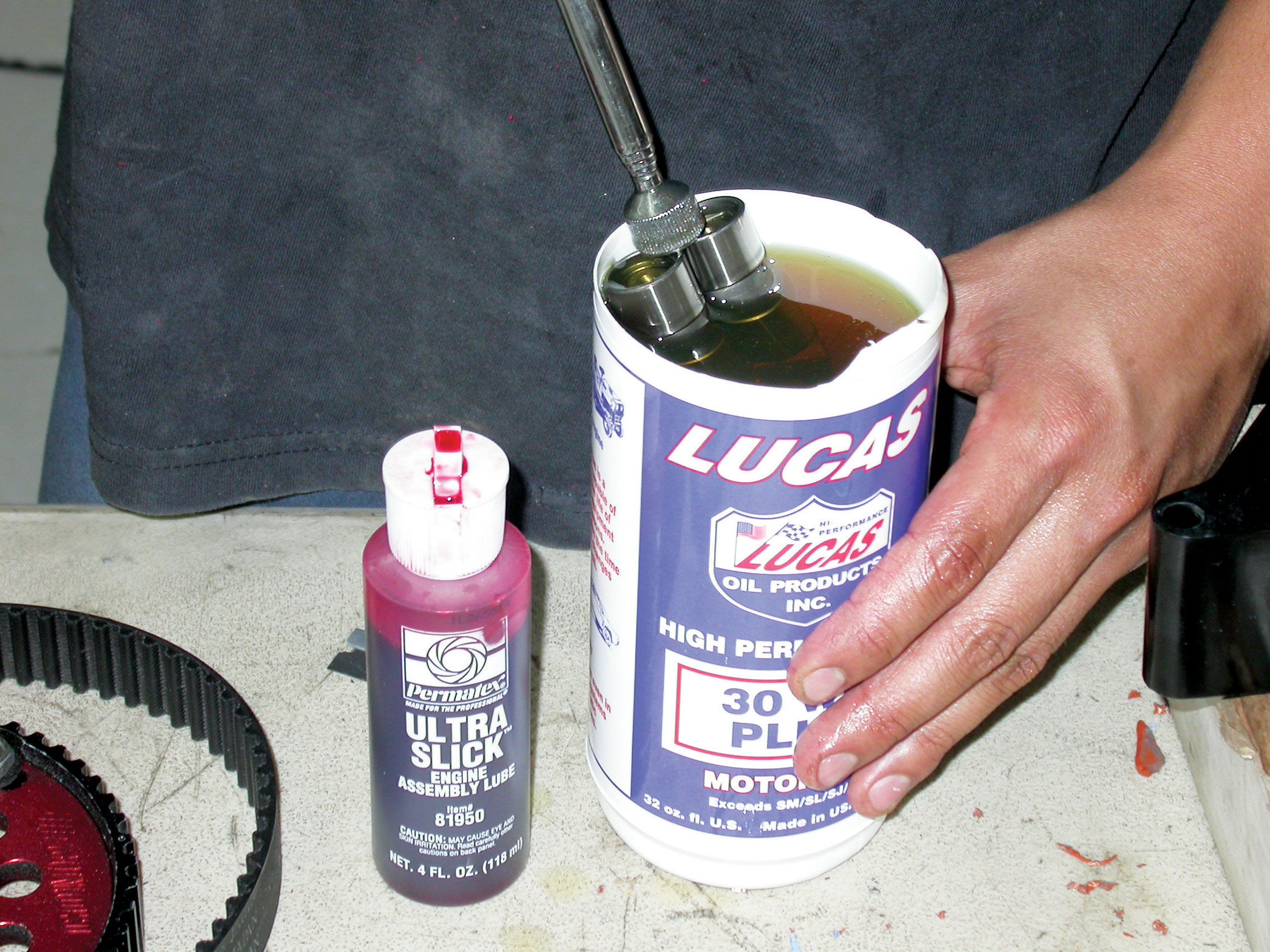 After running the nitrous with the stock cam, we swapped in the Comp NX256H cam. Swapping the cams required the removal of the carb and intake, along with the rockers, pushrods and lifters. We replaced the used hydraulic lifters with the new set provided with the cam. The new lifters were pre-lubed using Lucas 30W oil before assembly. The cam received a liberal dose of assembly lube, as did the entire valvetrain before reassembly. One trick new product we employed during the cam swap was Comp’s Valve Train Assembly Spray. This made lubricating the valvetrain a snap. After adjusting the valves, we were ready for the 20-minute break-in procedure. After we were sure that the cam and lifters were happy in their new home, we were safe to make full-throttle runs.