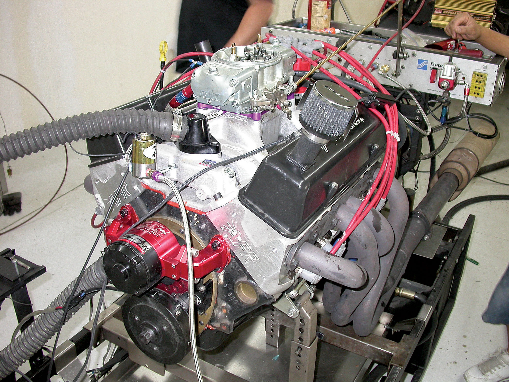 Our test motor certainly qualified as a daily driver, offering nearly 20 inches of vacuum thanks to the use of a production 200hp 350 hydraulic flat-tappet cam. A smooth idle is one quality offered by a stock cam profile, though the cam limited power production in the upper rpm range. In addition to the factory cam profile, the 350 small block featured AFR 190 heads, an Edelbrock Performer RPM Air-Gap intake and a Barry Grant Speed Demon carburetor. The static compression was less than 10.0:1, something that could easily be run on pump gas thanks to the use of the aluminum heads. Additional mods included an MSD distributor, Hooker headers and 1.6 ratio rockers.