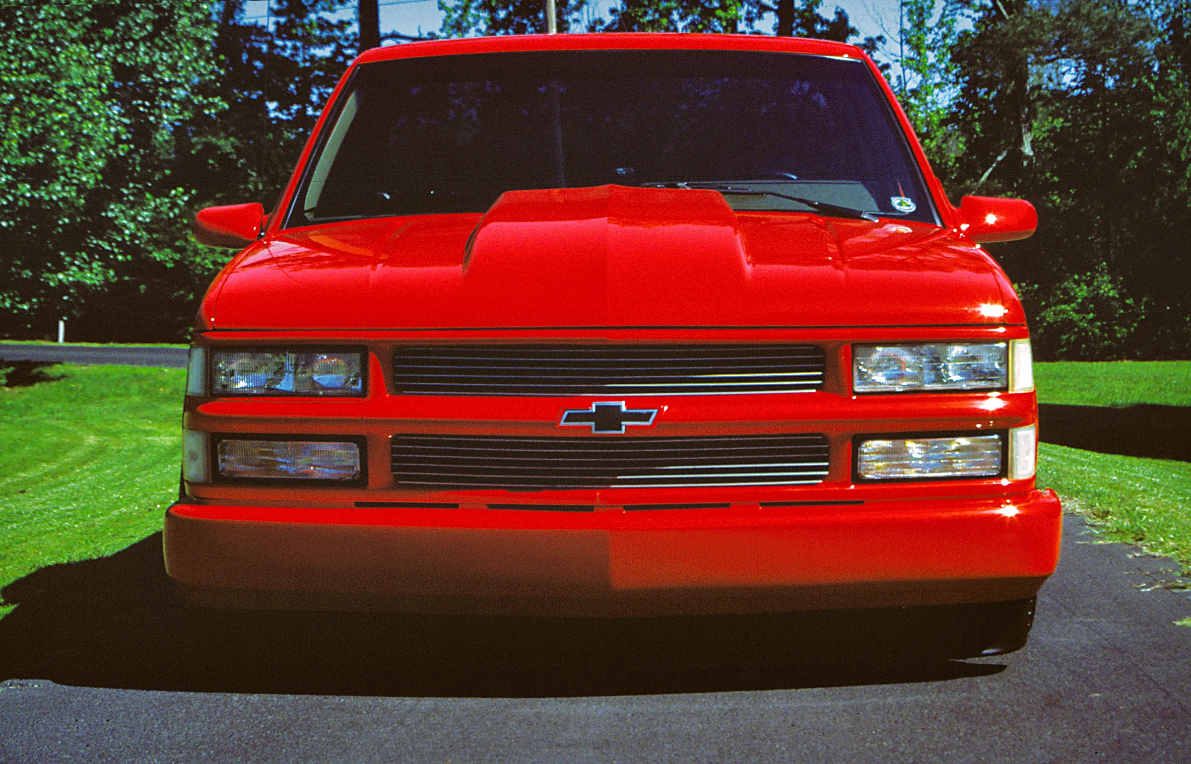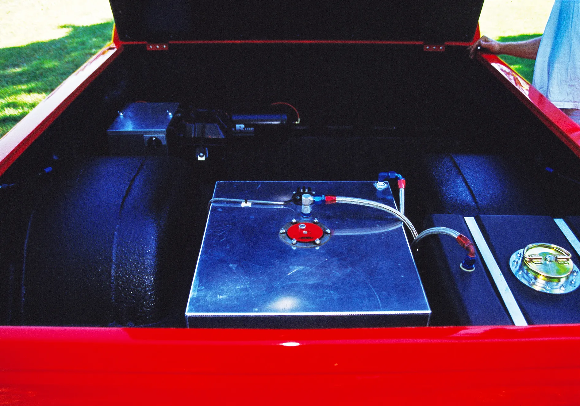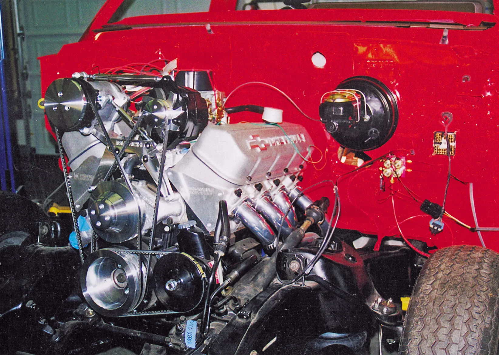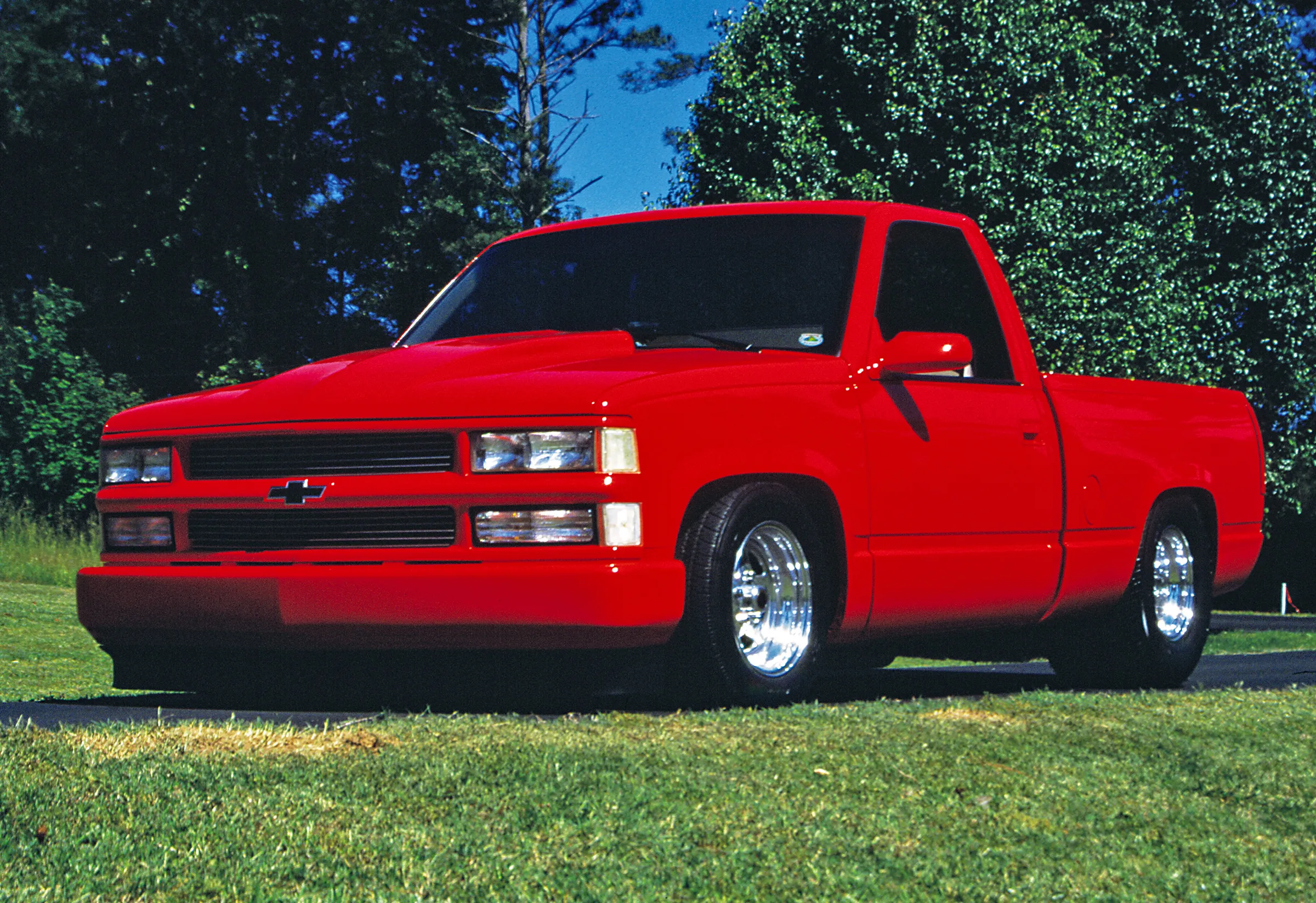 The Longs kept the body modifications to a minimum. All the exterior trim was removed and they added a Goodmark cowl induction hood, rear roll pan and a Checker Products bed cover. A 20-gallon fuel cell was mounted in the bed between the tubbed rear fender wells. Tom and Matt both worked the body smooth before Russell Hardeman applied the Viper Red PPG paint. Keeping the aggressive theme going are Weld Racing Pro Star wheels with BFGoodrich tires up front and Hoosier Radials out back.