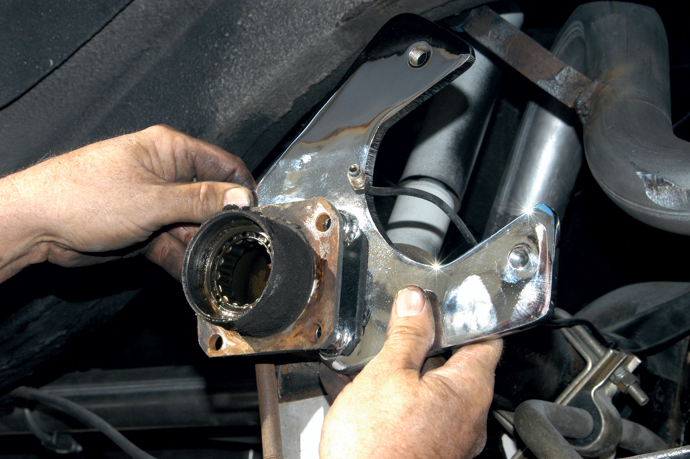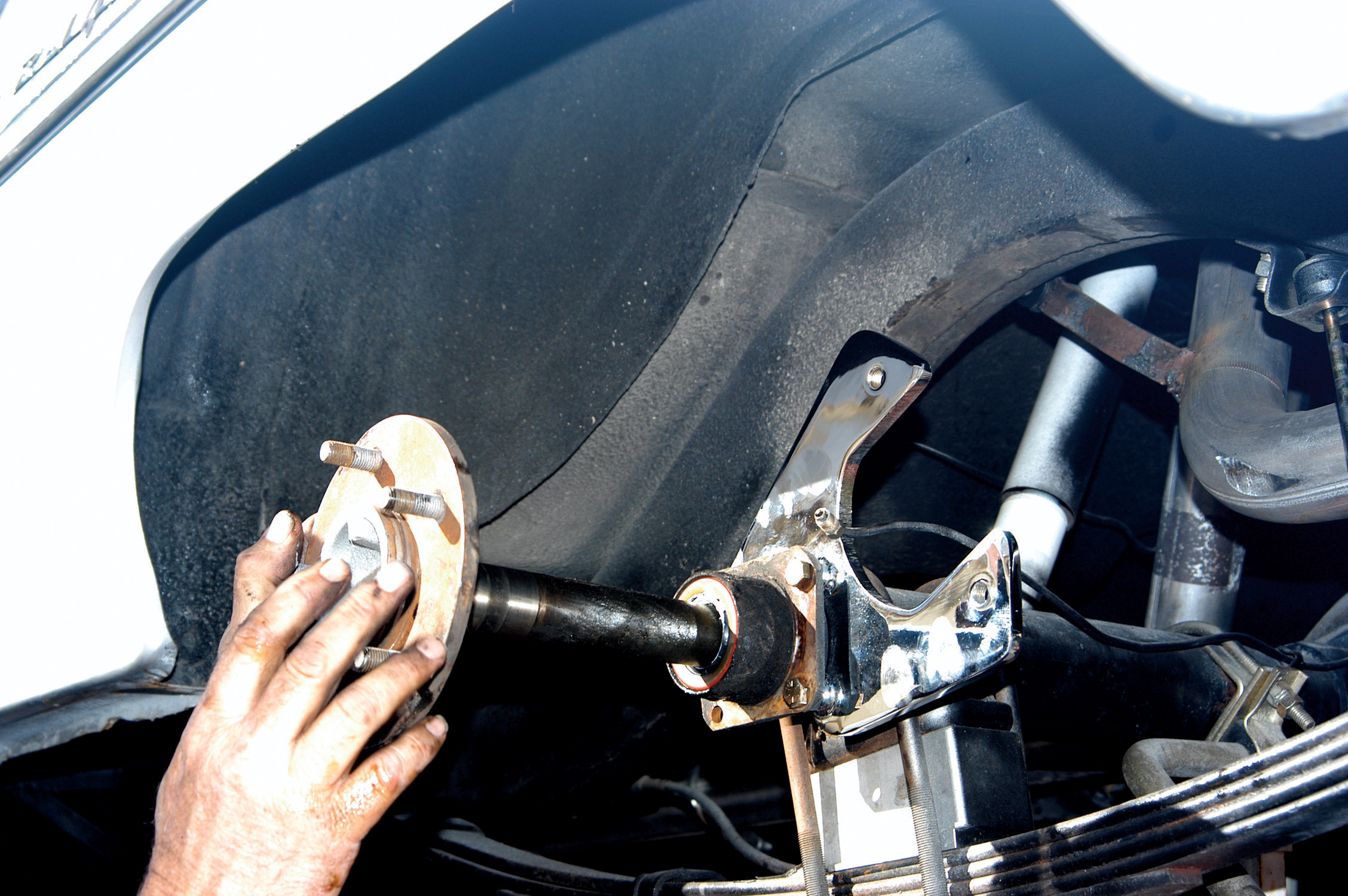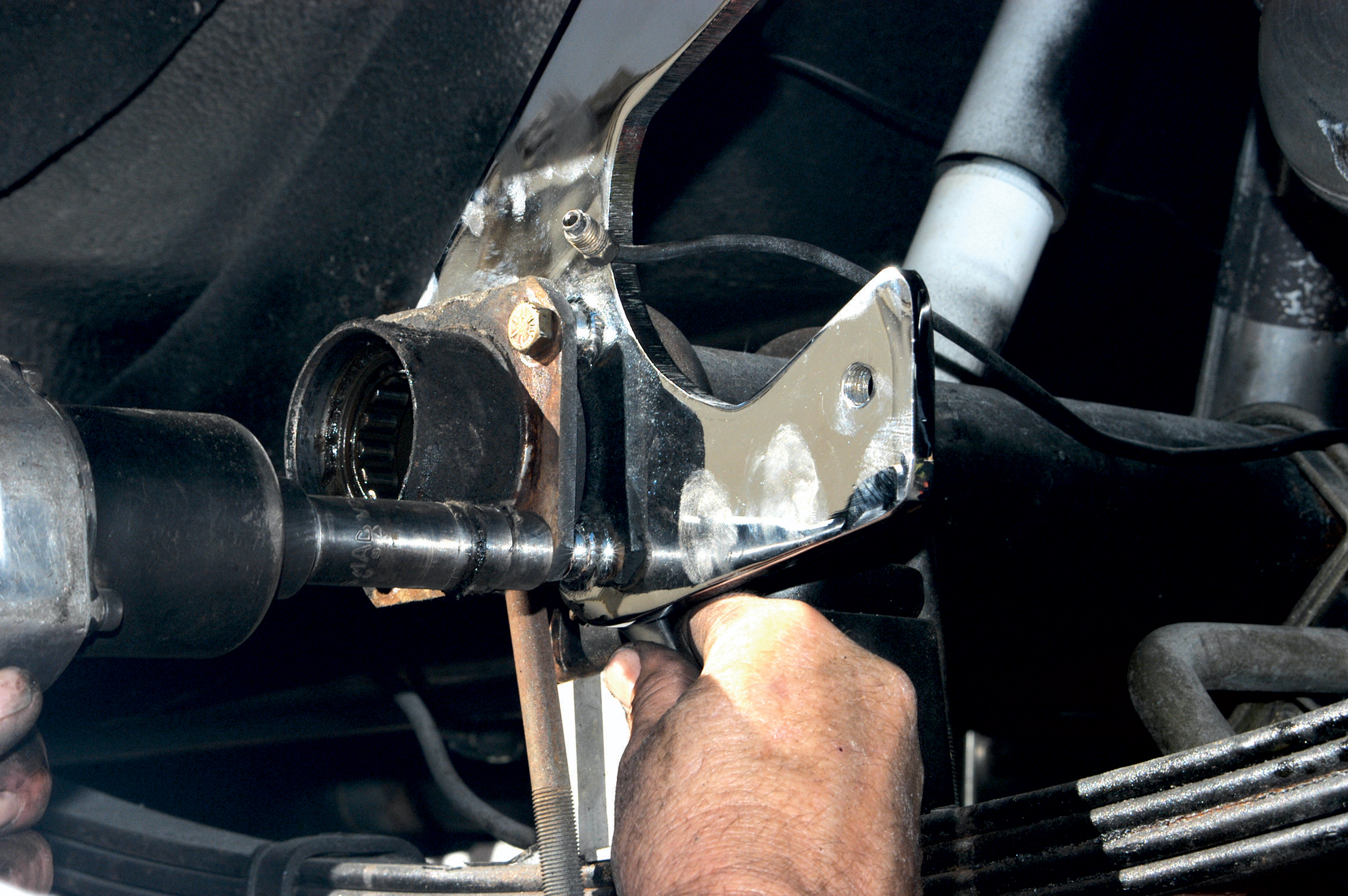 They held the bracket up to the axle flange and it seemed to line up perfectly. Here the first bolt is being installed.