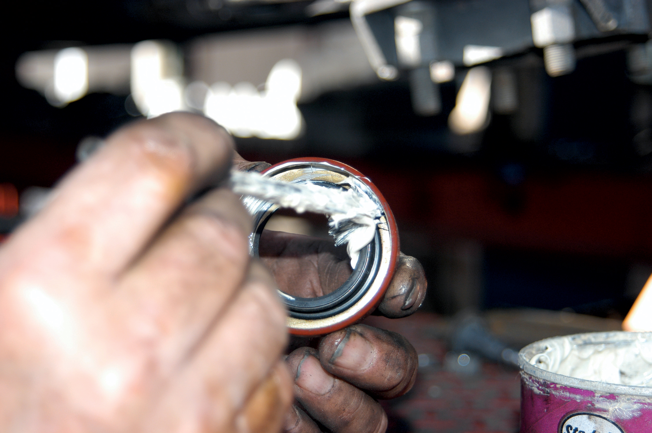 This was a good chance to install new axle bearings, so Dream Cars took the opportunity to make the upgrade. Here the seal is being greased prior to installation.