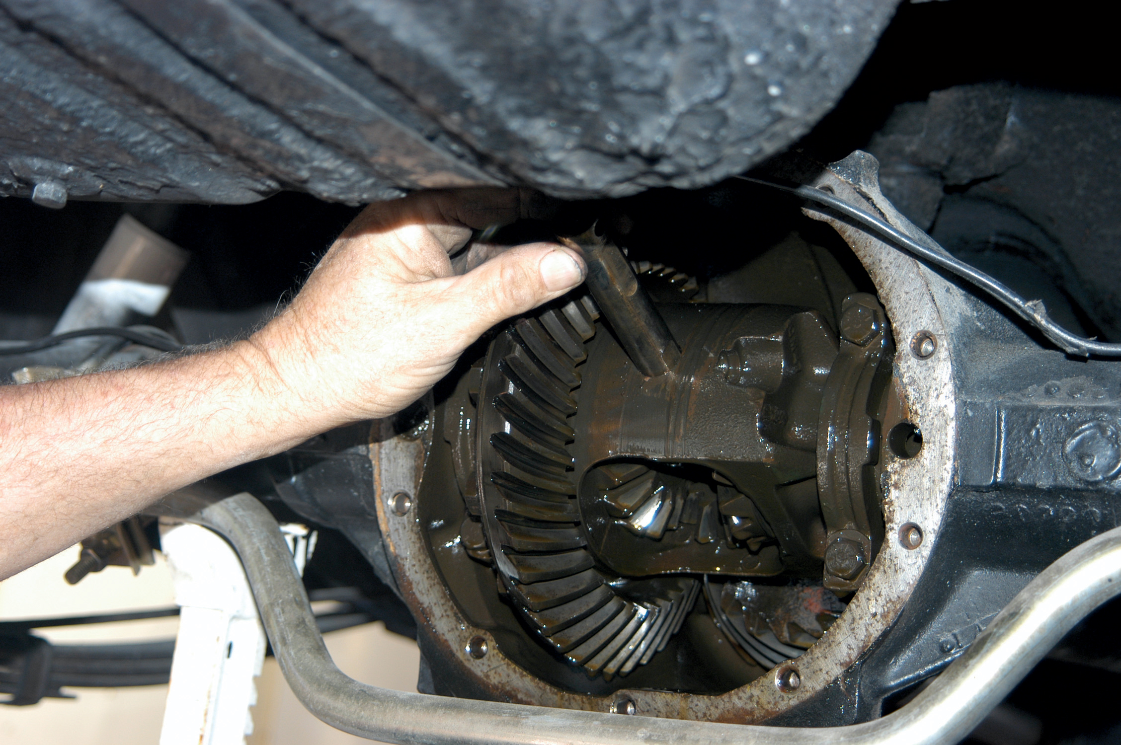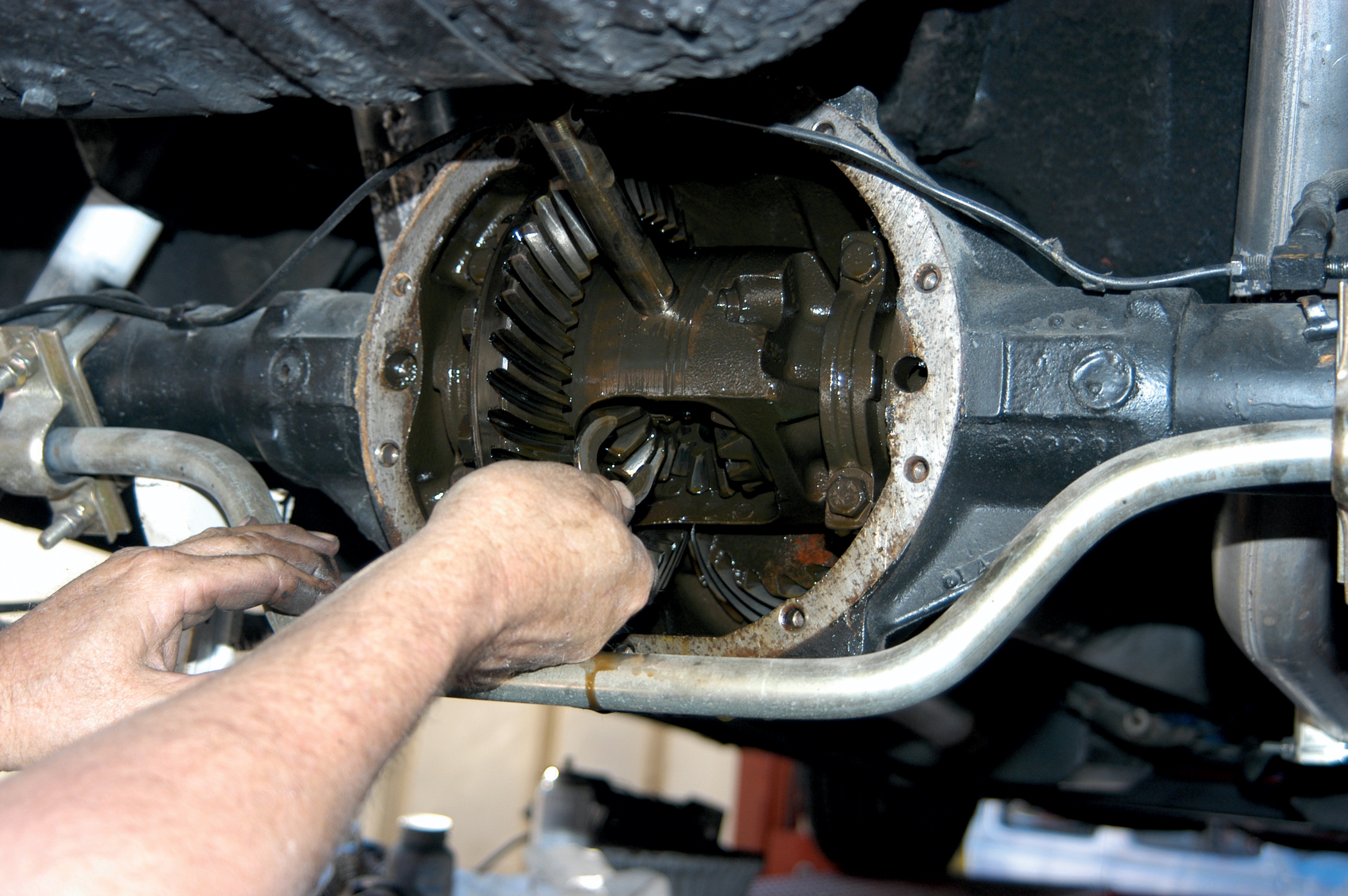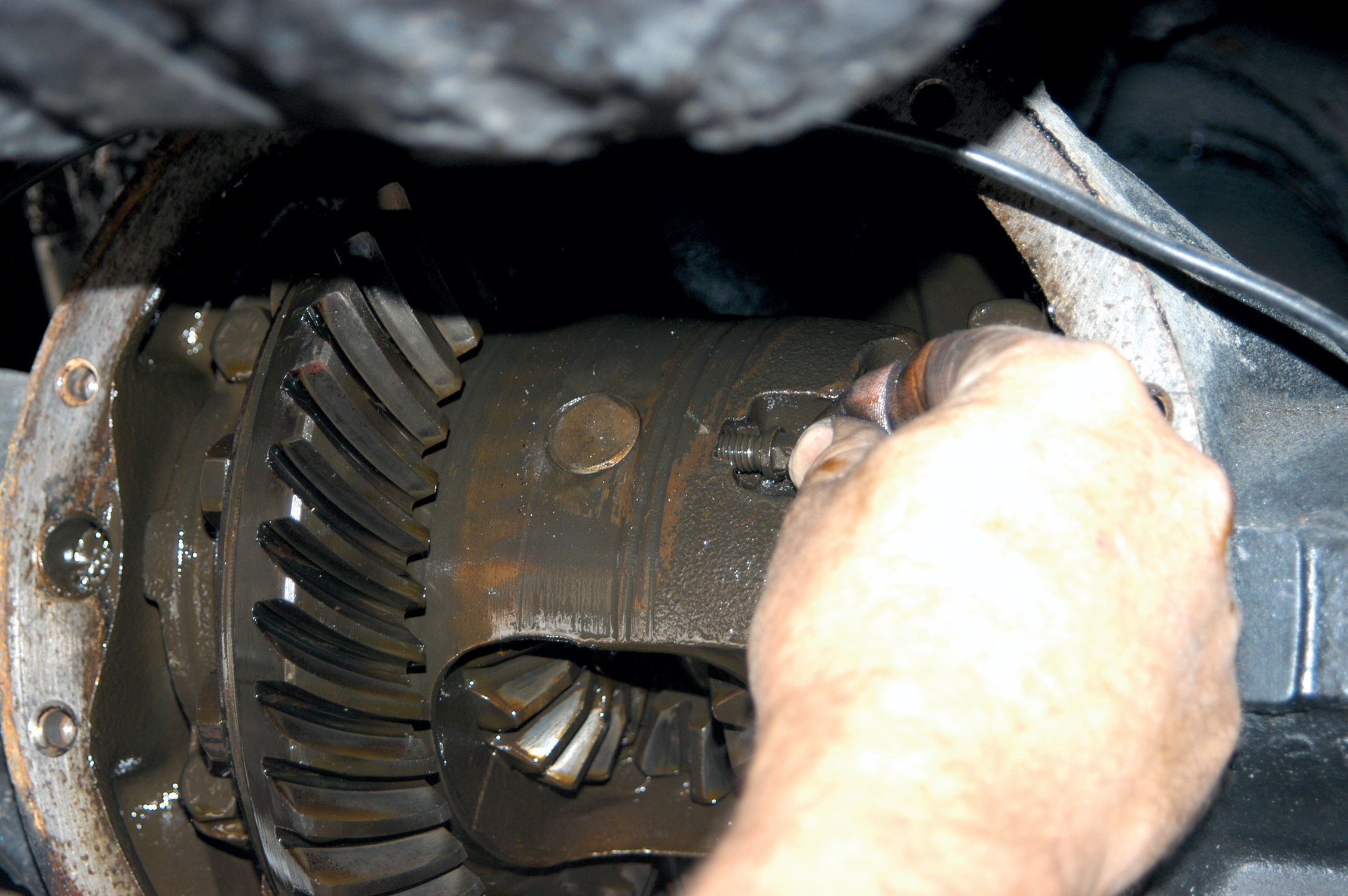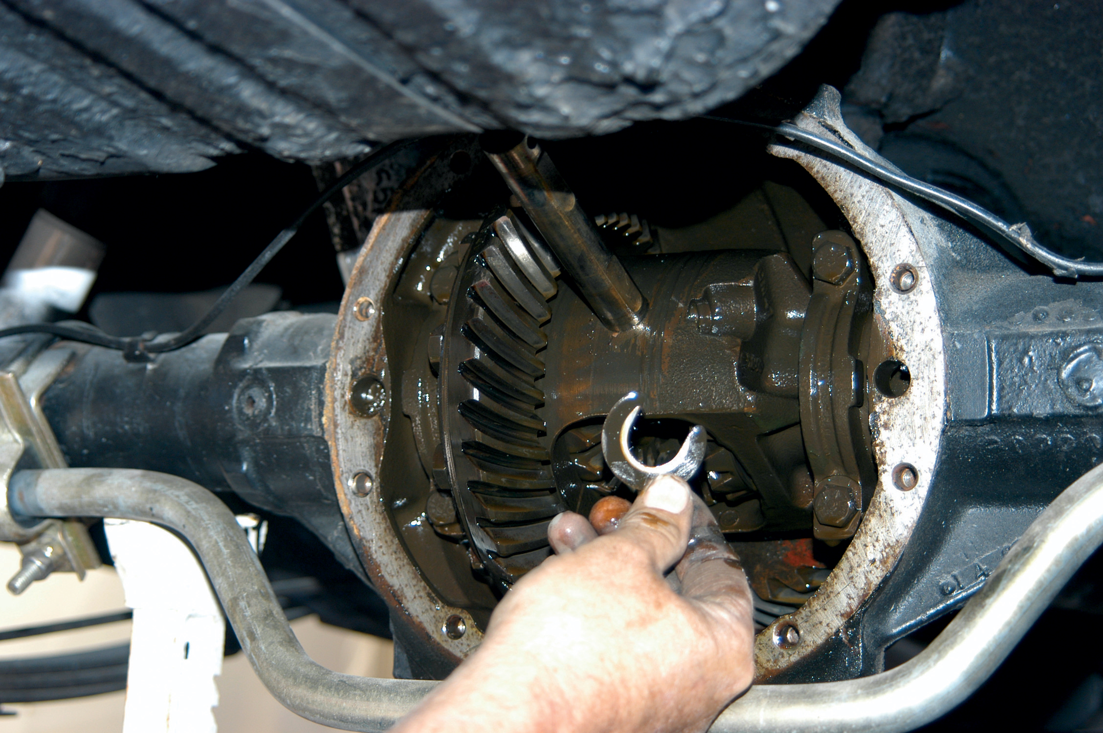 They installed the cover on the axlehousing and tightened it with a socket wrench, working side to side to tighten the bolts.
