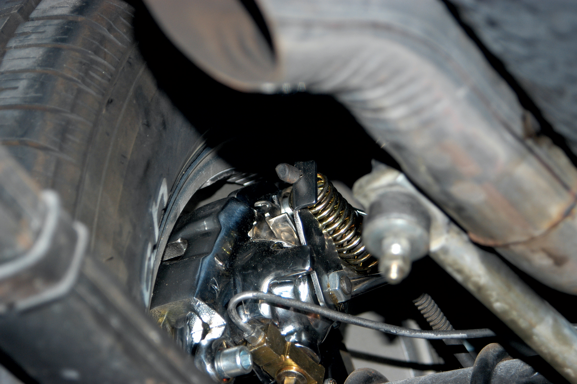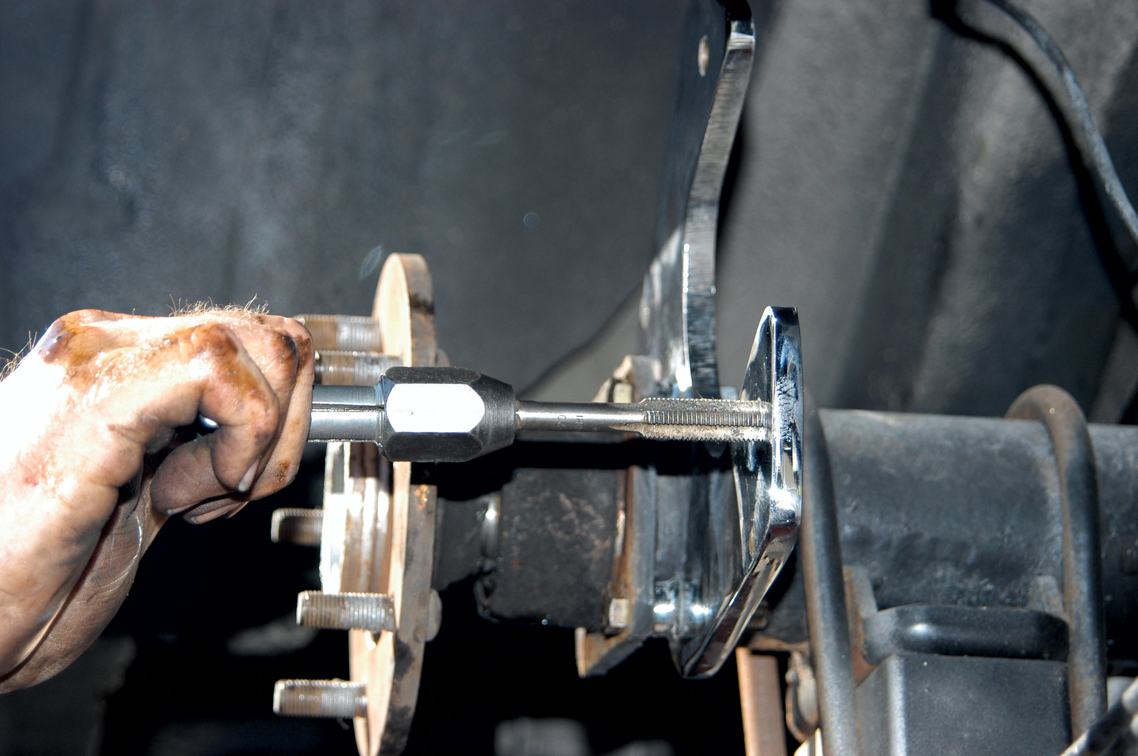 When the brakes were finished, Dream Cars installed the tires and wheels. Installing and removing tires and wheels can be a little tricky on early Chevys because of their wheel well design.